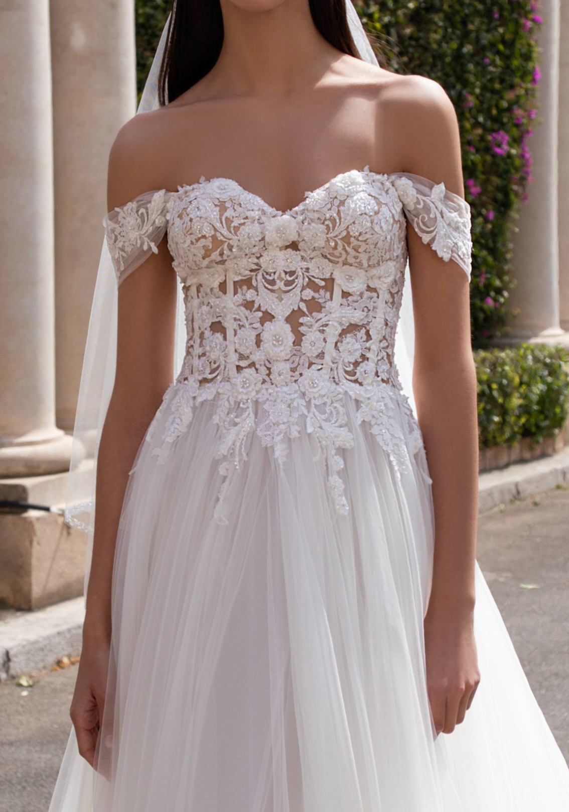 This enchanting princess-cut wedding gown features a corset-style illusion bodice adorned with beaded roses and twirling vines, exuding romantic elegance. The off-the-shoulder sleeves add a touch of whimsy, while the light, layered skirt flows gracefully into a royal train, creating a captivating silhouette.