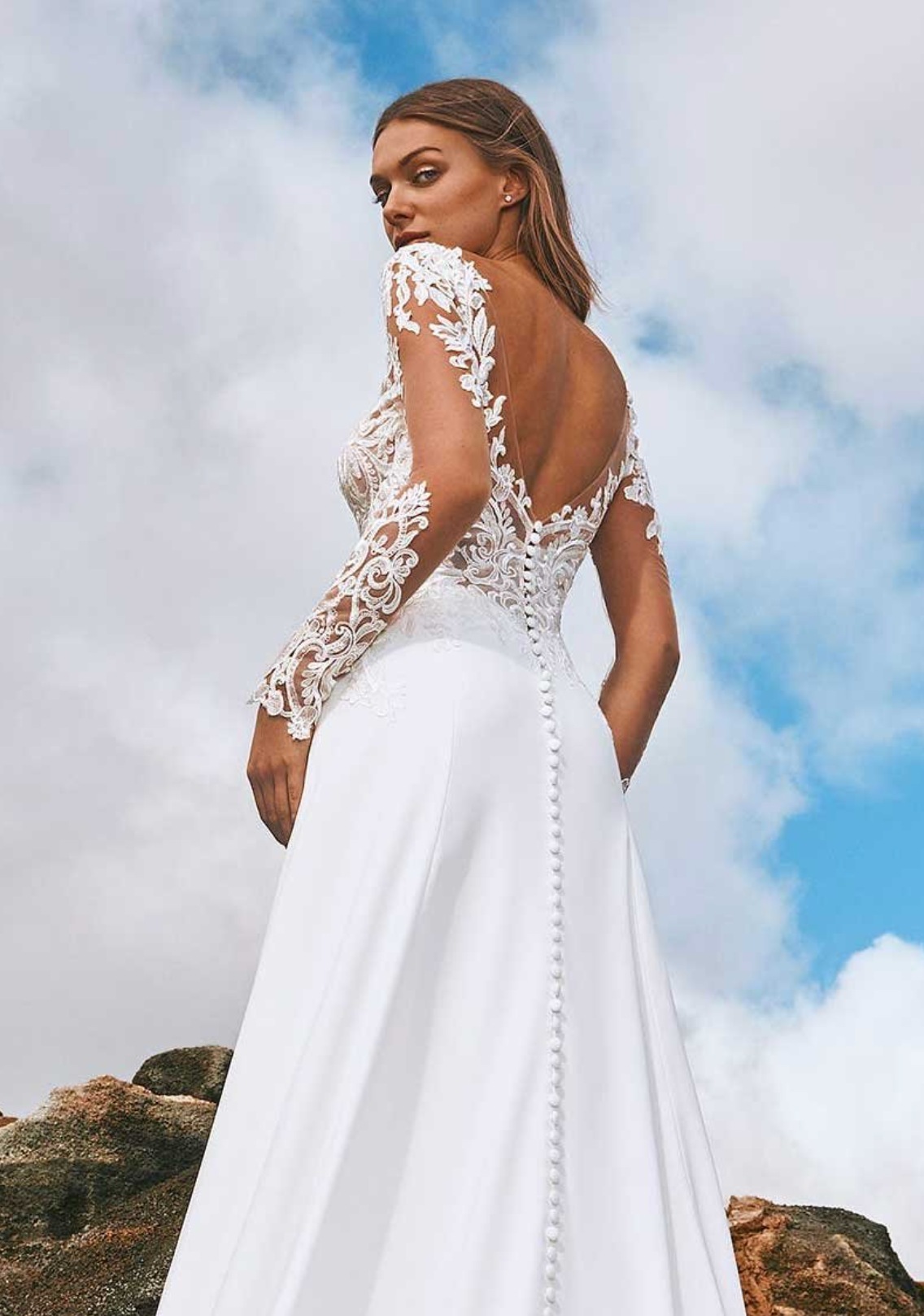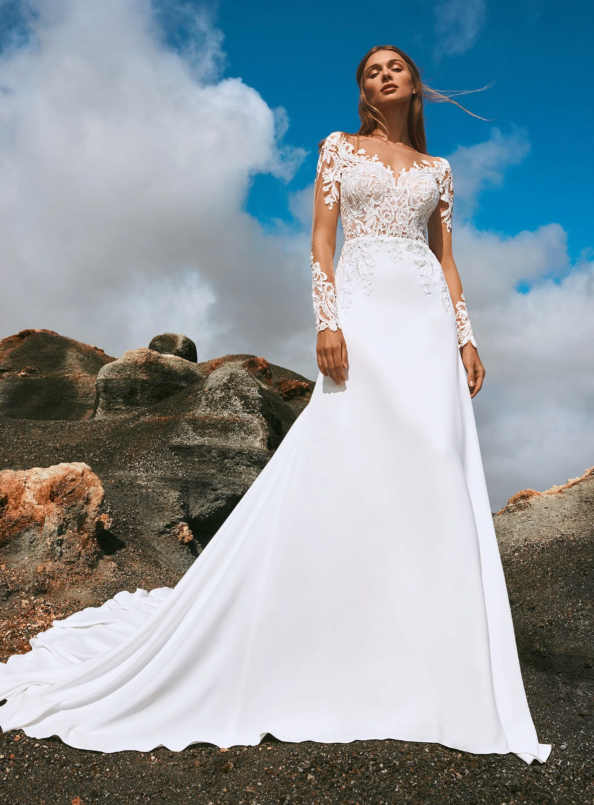 This exquisite fit-and-flare wedding gown features a bateau neckline and three-quarter sleeves, exuding timeless elegance. The bodice is adorned with intricate lace appliqués, creating a romantic allure. The illusion back adds a modern touch, while the flowing skirt and chapel-length train complete the look with graceful sophistication.