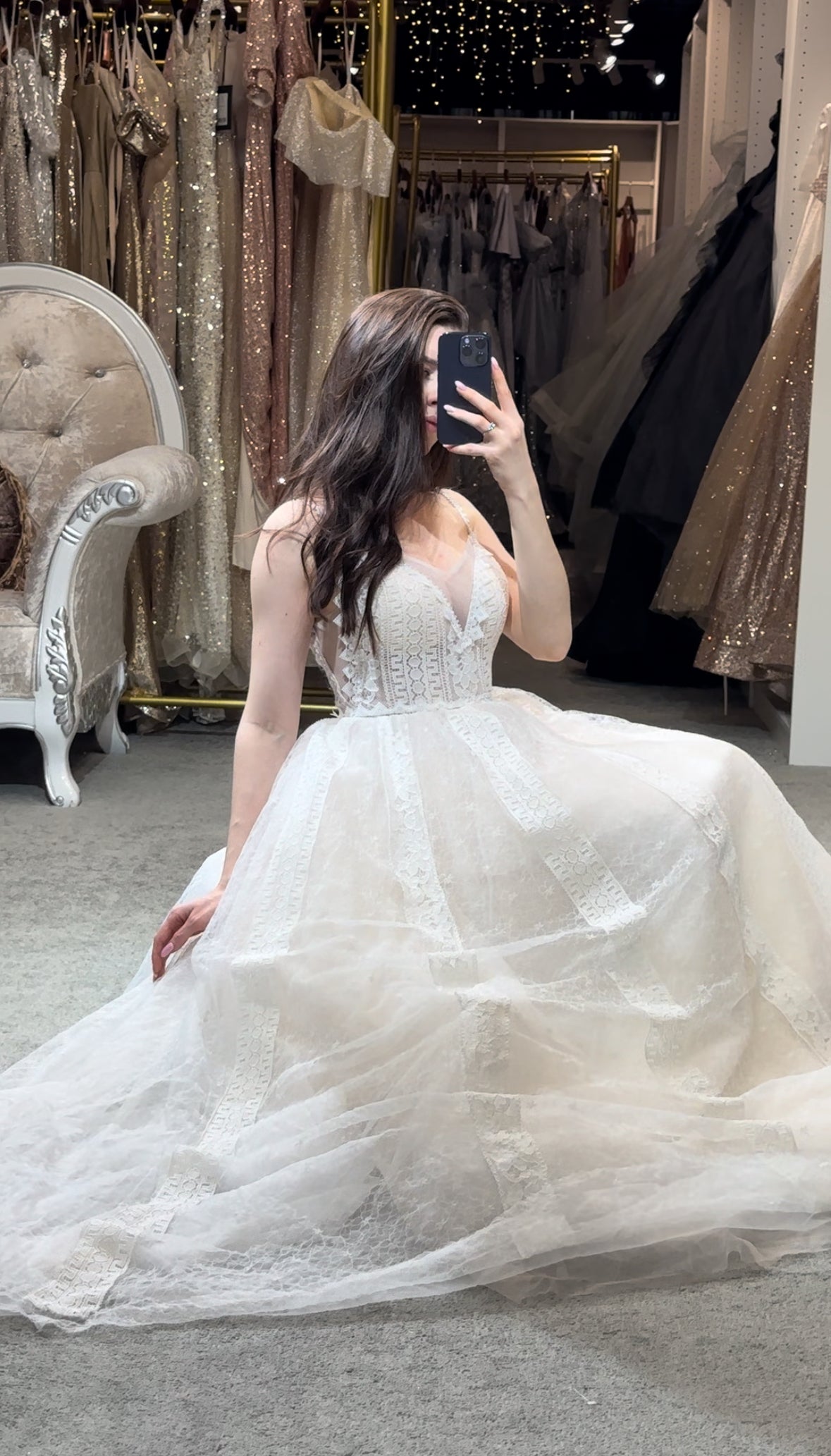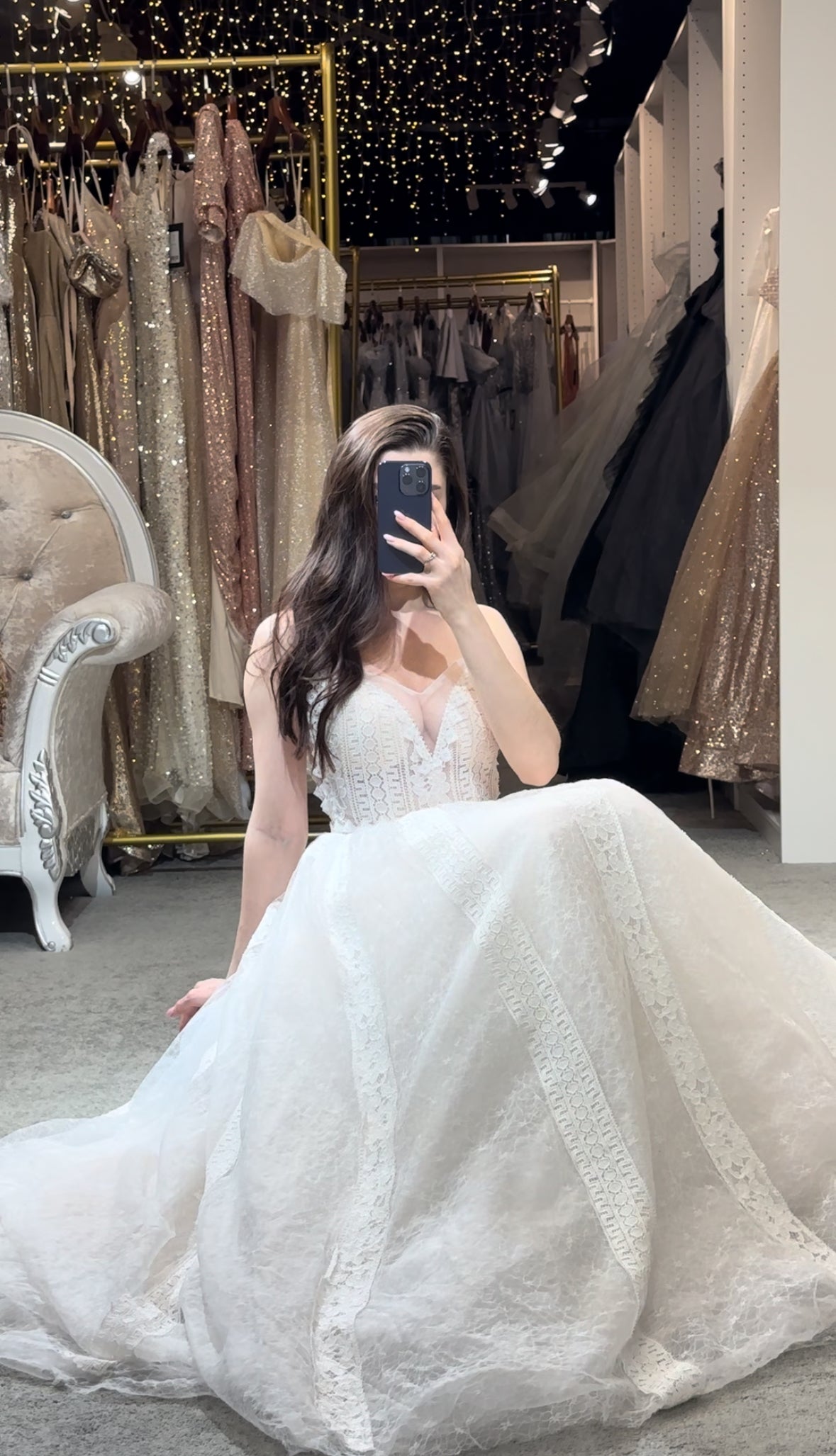 Step into a space designed for comfort and luxury. Our fitting rooms offer soft, cozy seating areas for you and your guests, along with an assortment of shoes to complement your dresses. Our curtains curate a private and safe environment, while our luxurious carpet and lighting ensure you feel pampered as you search for your dream gown. Book your appointment today and visit us to create a truly unforgettable experience.