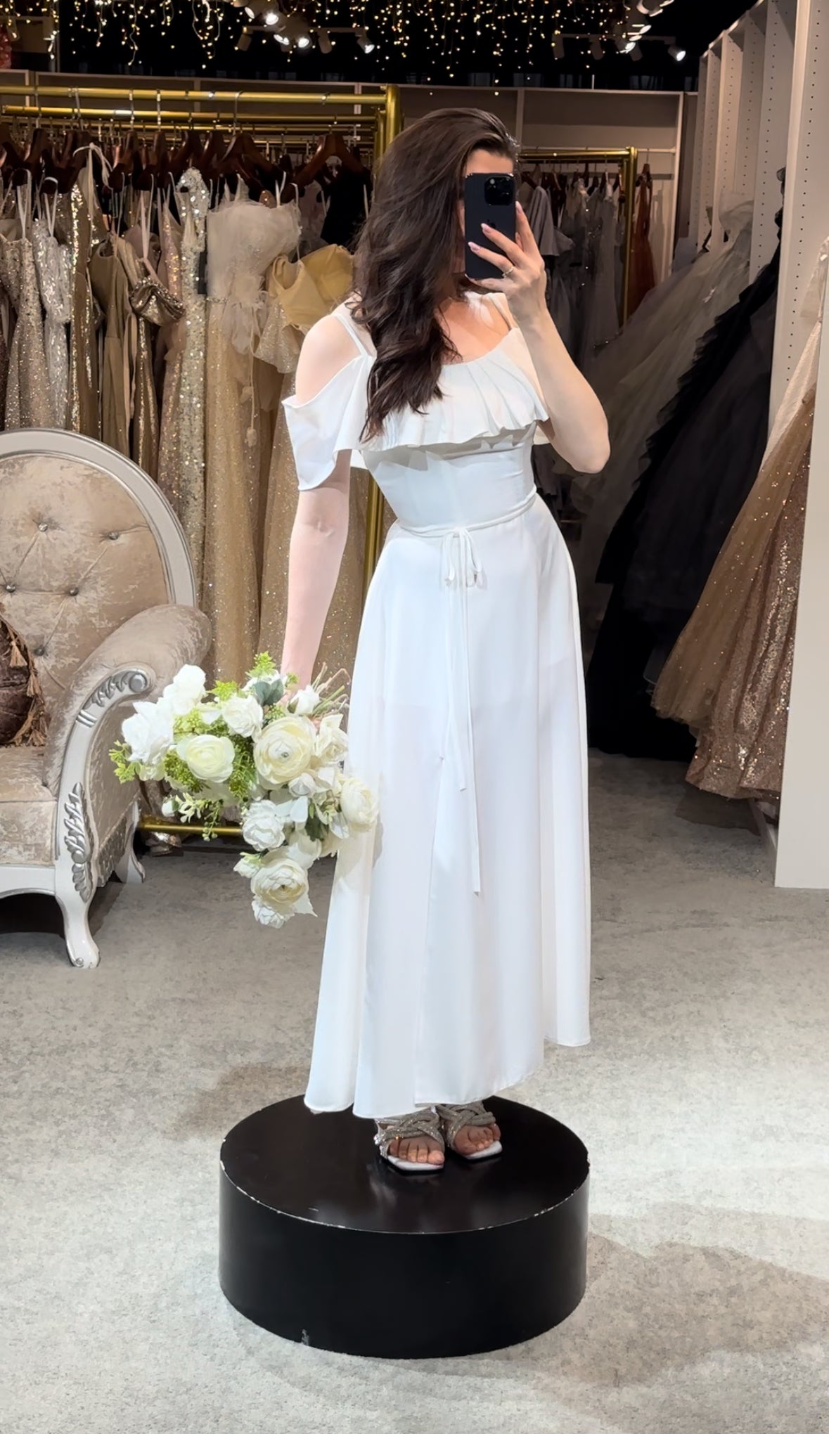 Step into a space designed for comfort and luxury. Our fitting rooms offer soft, cozy seating areas for you and your guests, along with an assortment of shoes to complement your dresses. Our curtains curate a private and safe environment, while our luxurious carpet and lighting ensure you feel pampered as you search for your dream gown. Book your appointment today and visit us to create a truly unforgettable experience.