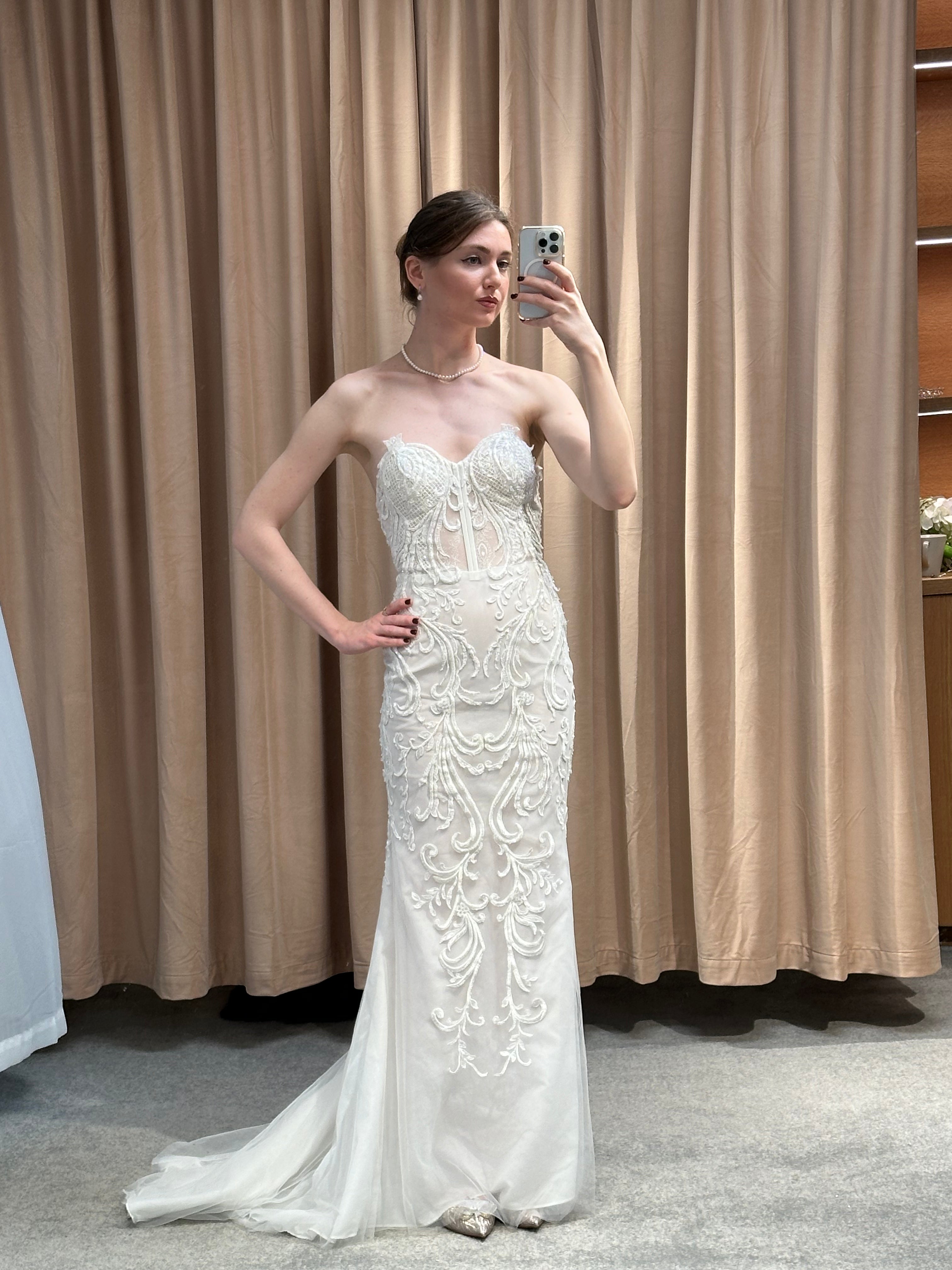Sample sale gowns can be altered down from their original size for a perfect fit. Alterations incur additional charges. If you wish to use our in-house tailor, measurements must be taken in-store. Minor issues such as zipper repairs, small holes, or slight bead loss can be fixed by our in-house tailor at no extra cost.