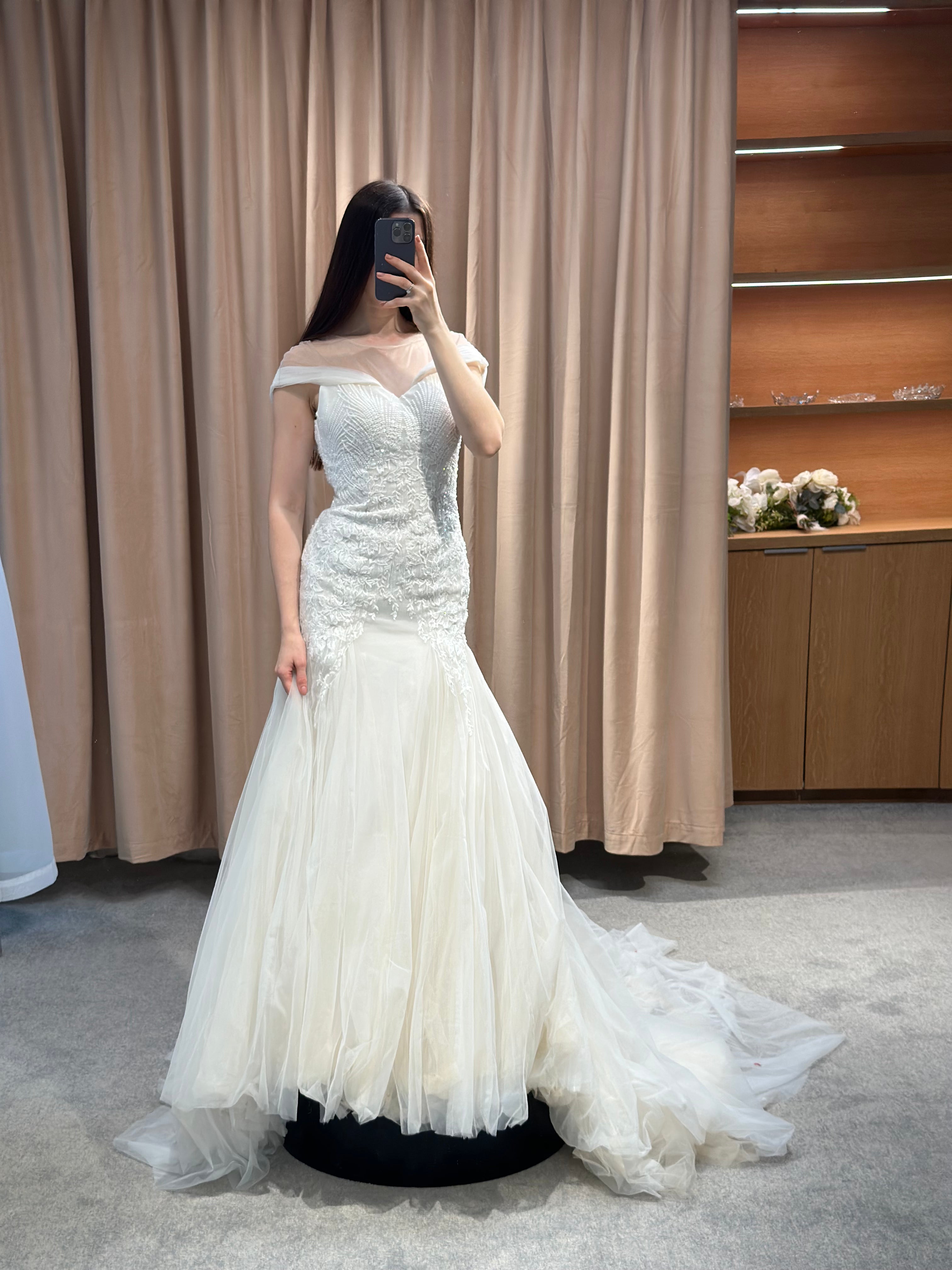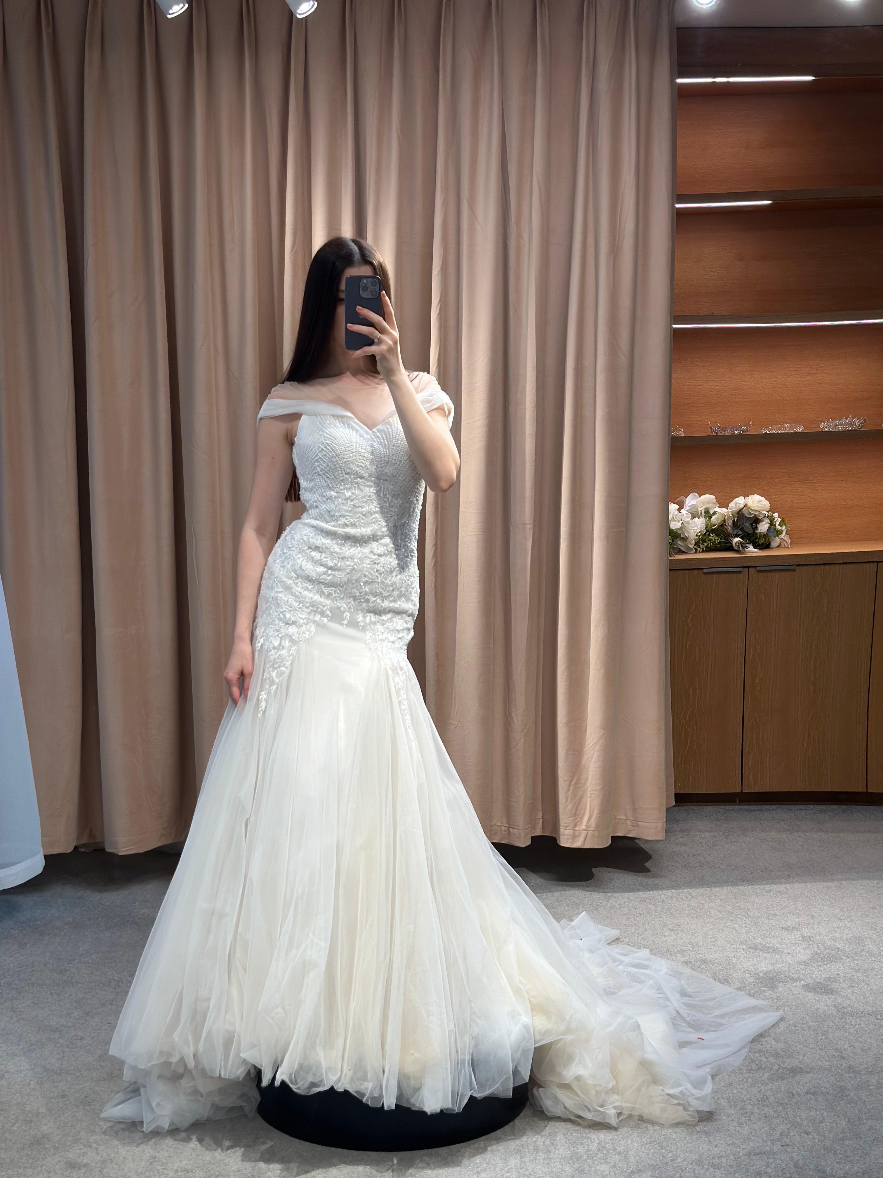 Graceful and glamorous, this mermaid wedding dress is designed to make a statement. The off-shoulder neckline exudes romance, while the dramatic puffy skirt adds a touch of grandeur. Adorned with intricate lace embroidery and delicate sequins, the gown sparkles with every movement.