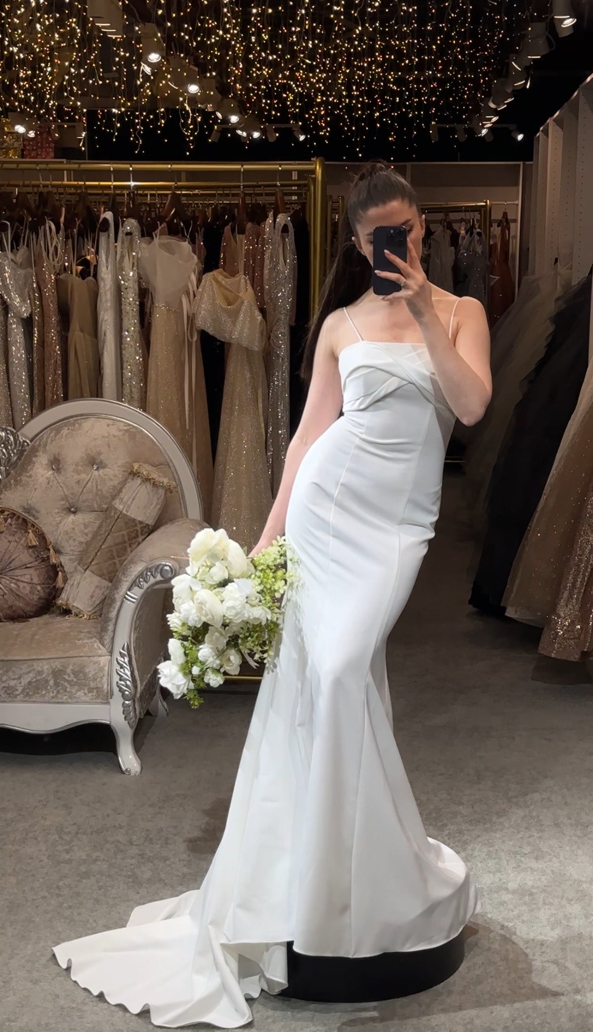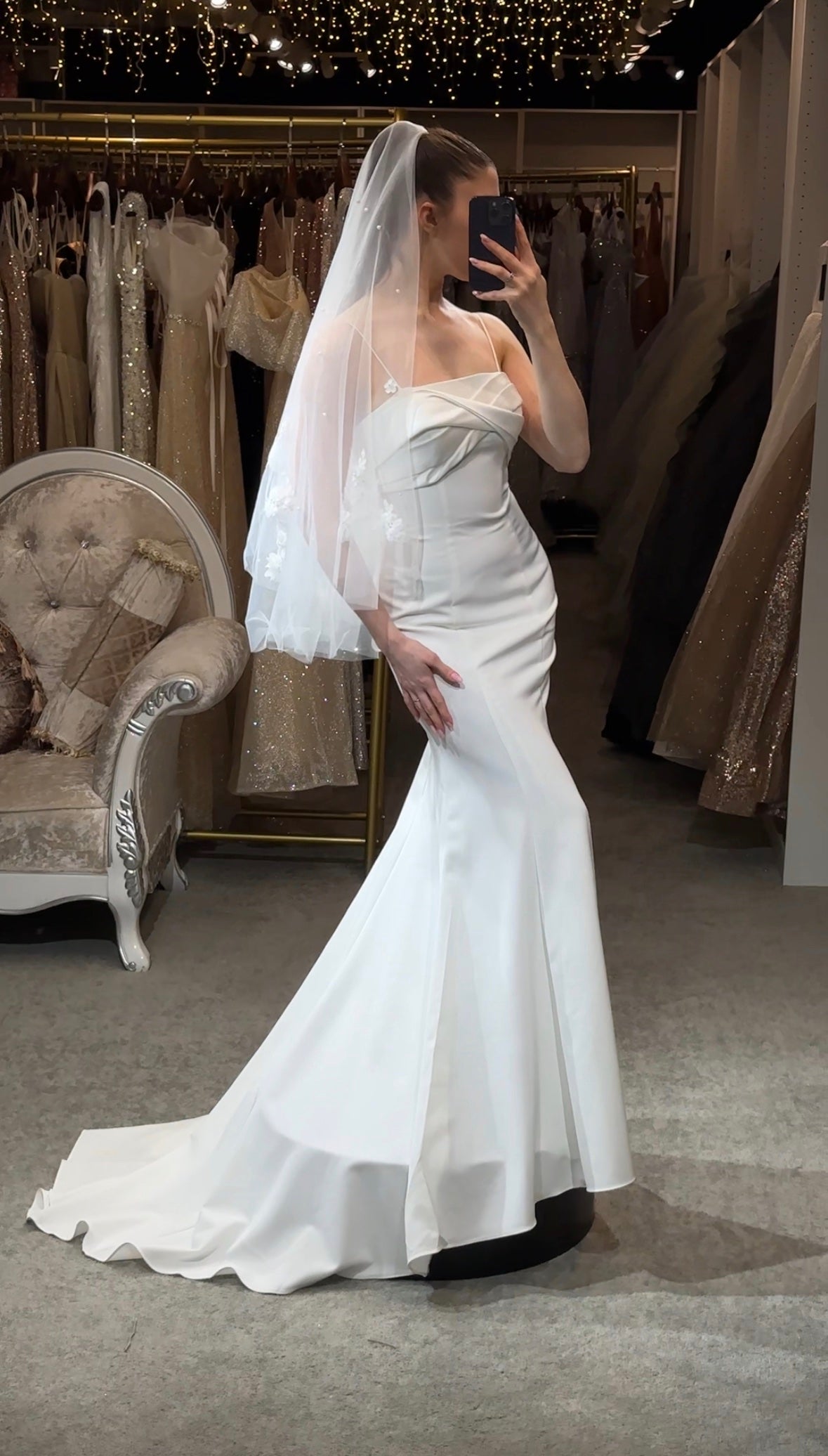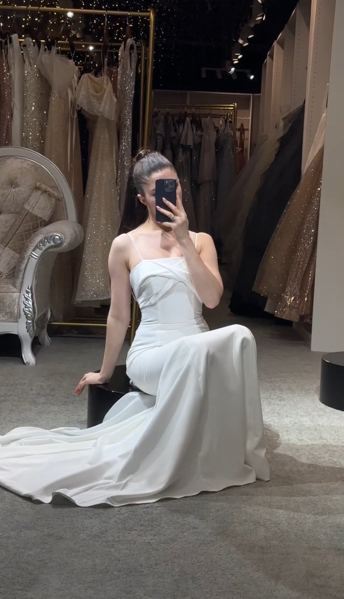 Step into a space designed for comfort and luxury. Our fitting rooms offer soft, cozy seating areas for you and your guests, along with an assortment of shoes to complement your dresses. Our curtains curate a private and safe environment, while our luxurious carpet and lighting ensure you feel pampered as you search for your dream gown. Book your appointment today and visit us to create a truly unforgettable experience.