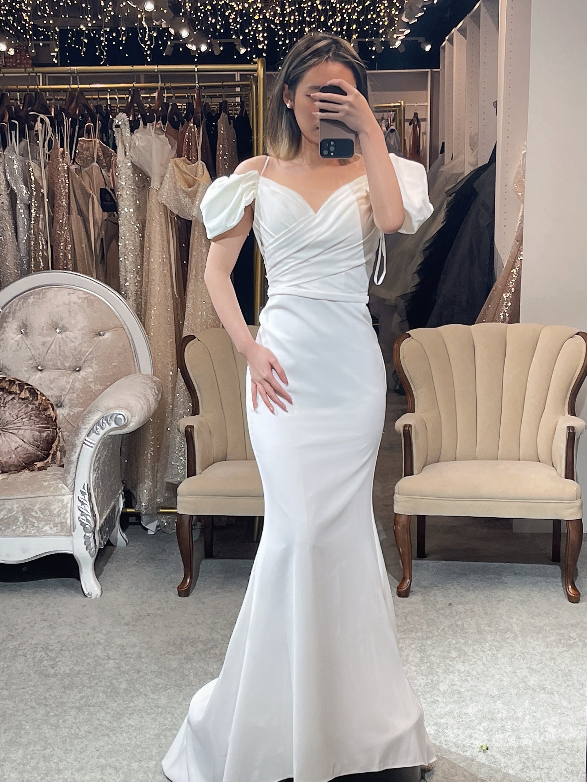 This sophisticated fit and flare gown features an alluring V-neckline paired with elegant off-shoulder sleeves, blending timeless romance with contemporary style. Crafted from luxurious crepe, the gown hugs the silhouette beautifully, offering a sleek and refined finish.