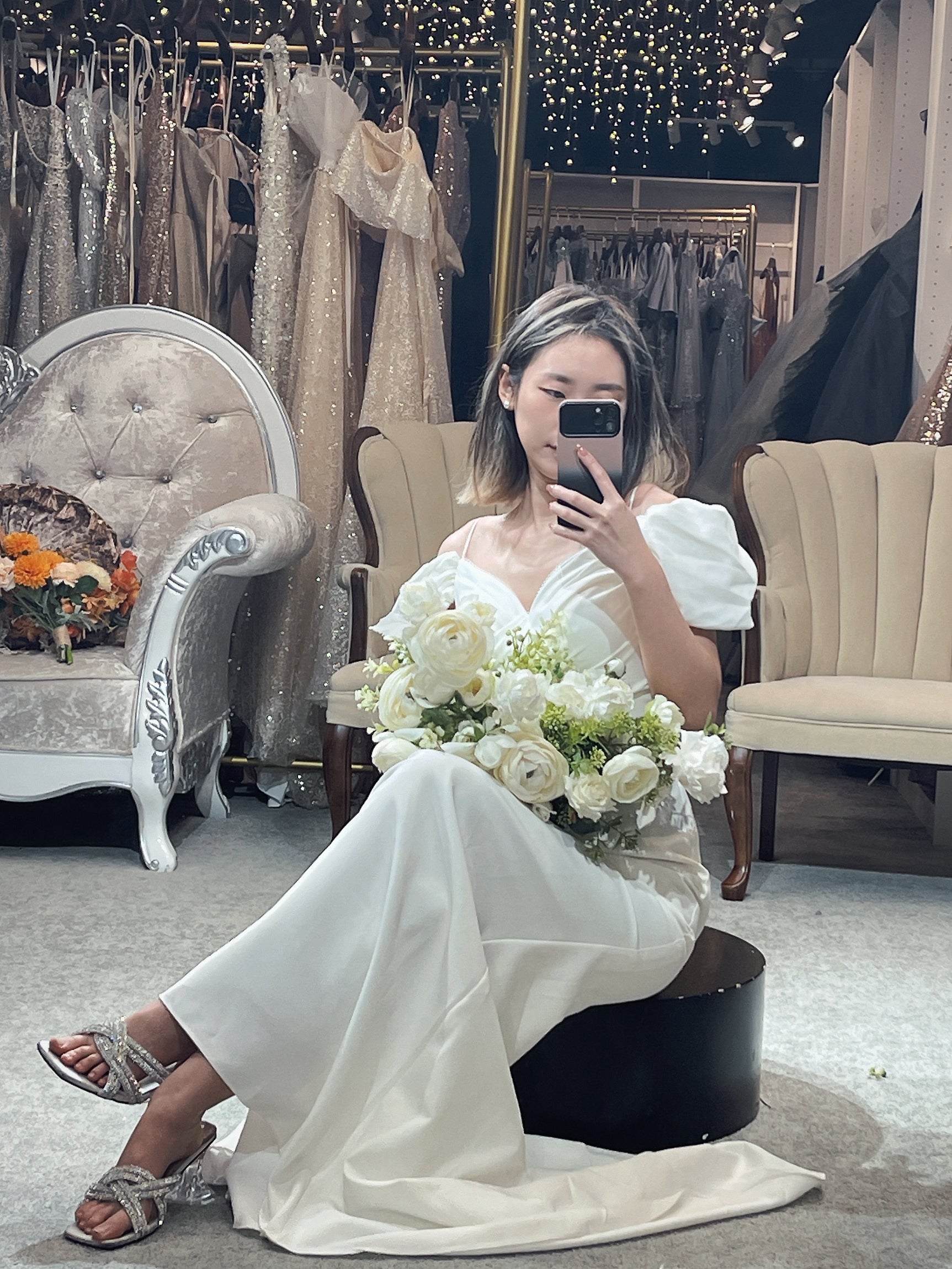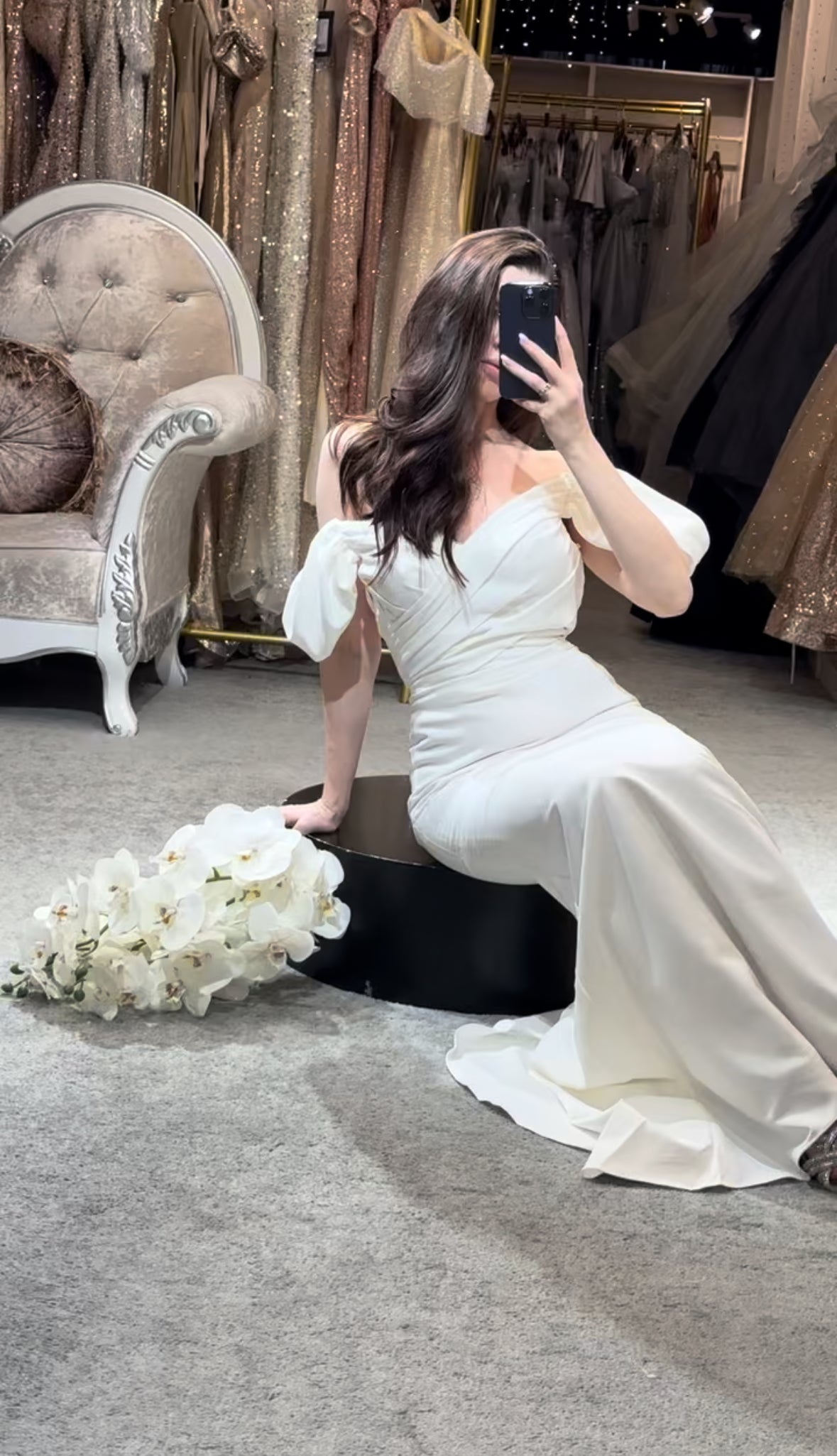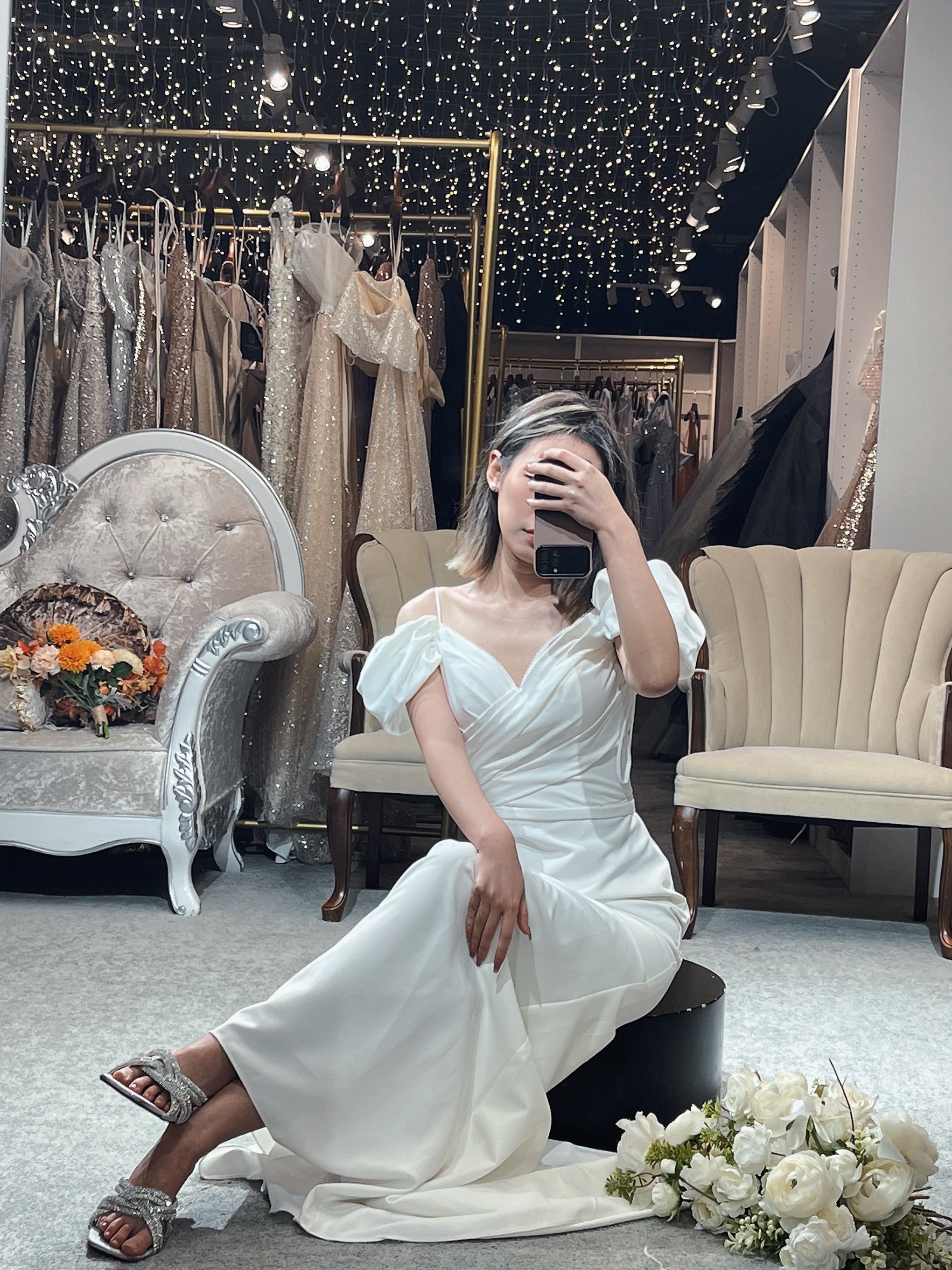 Step into a space designed for comfort and luxury. Our fitting rooms offer soft, cozy seating areas for you and your guests, along with an assortment of shoes to complement your dresses. Our curtains curate a private and safe environment, while our luxurious carpet and lighting ensure you feel pampered as you search for your dream gown. Book your appointment today and visit us to create a truly unforgettable experience.