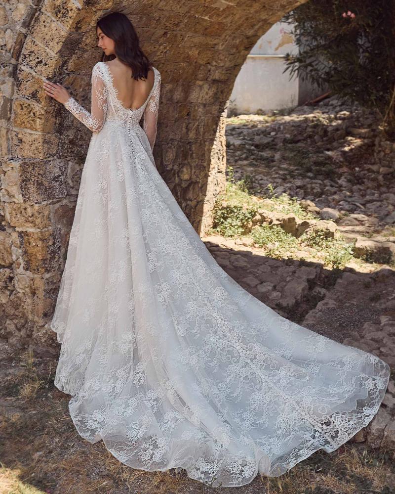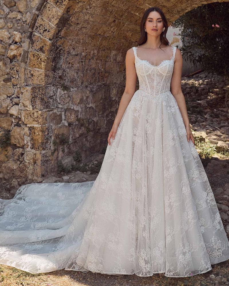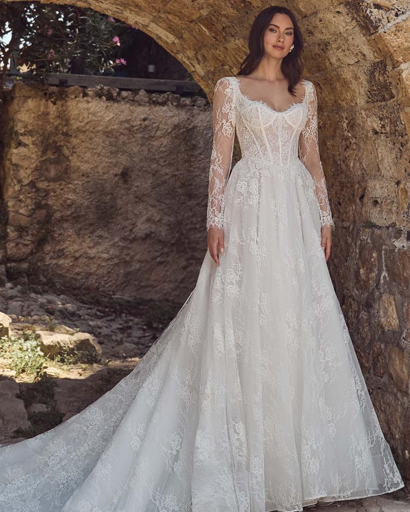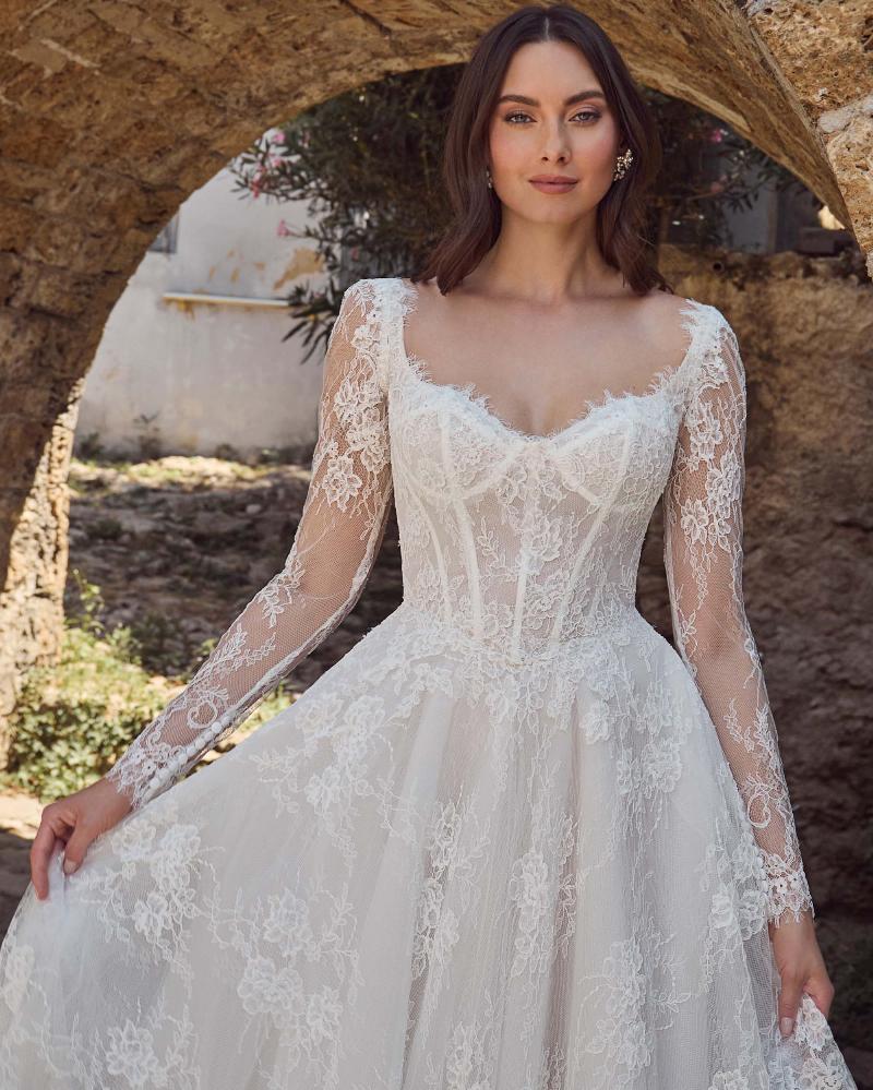 Yelena is a classic lace wedding dress that combines vintage charm with modern versatility. Her romantic A-line silhouette features a sweetheart neckline and intricate lace details that bring memories of yesteryear. Brides can choose between tank straps or long sleeves with her detachable sleeves adding an extra layer of customization for the ceremony. Practical pockets complete this timeless, elegant look, making it perfect for any bride wanting a romantic and classic aesthetic with subtle versatility.