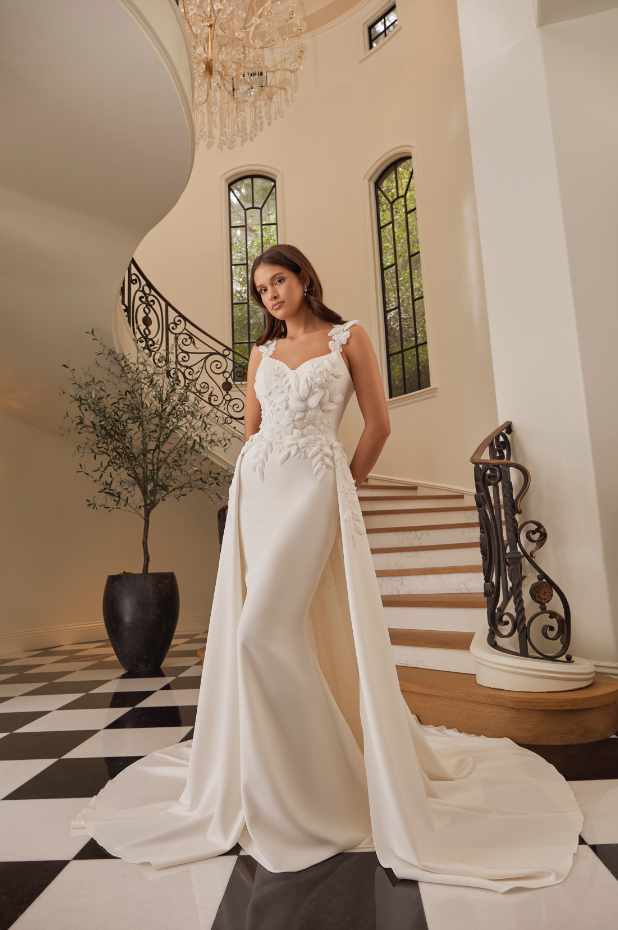 Dramatic, detachable, and A-line, this dress is the matching overskirt to our stunning Tessa gown. Attaching at the waist and descending to the floor in stretch matte satin, this skirt is adorned in sequined, chiffon floral lace trickling down in a vine-like pattern. This piece is an effortless accessory that you can add to achieve a showstopping 2-in-1 bridal ensemble with a 74-inch train. This skrit was designed for pictures on a grand staircase and can be easily removed for your party on the dancefloor.