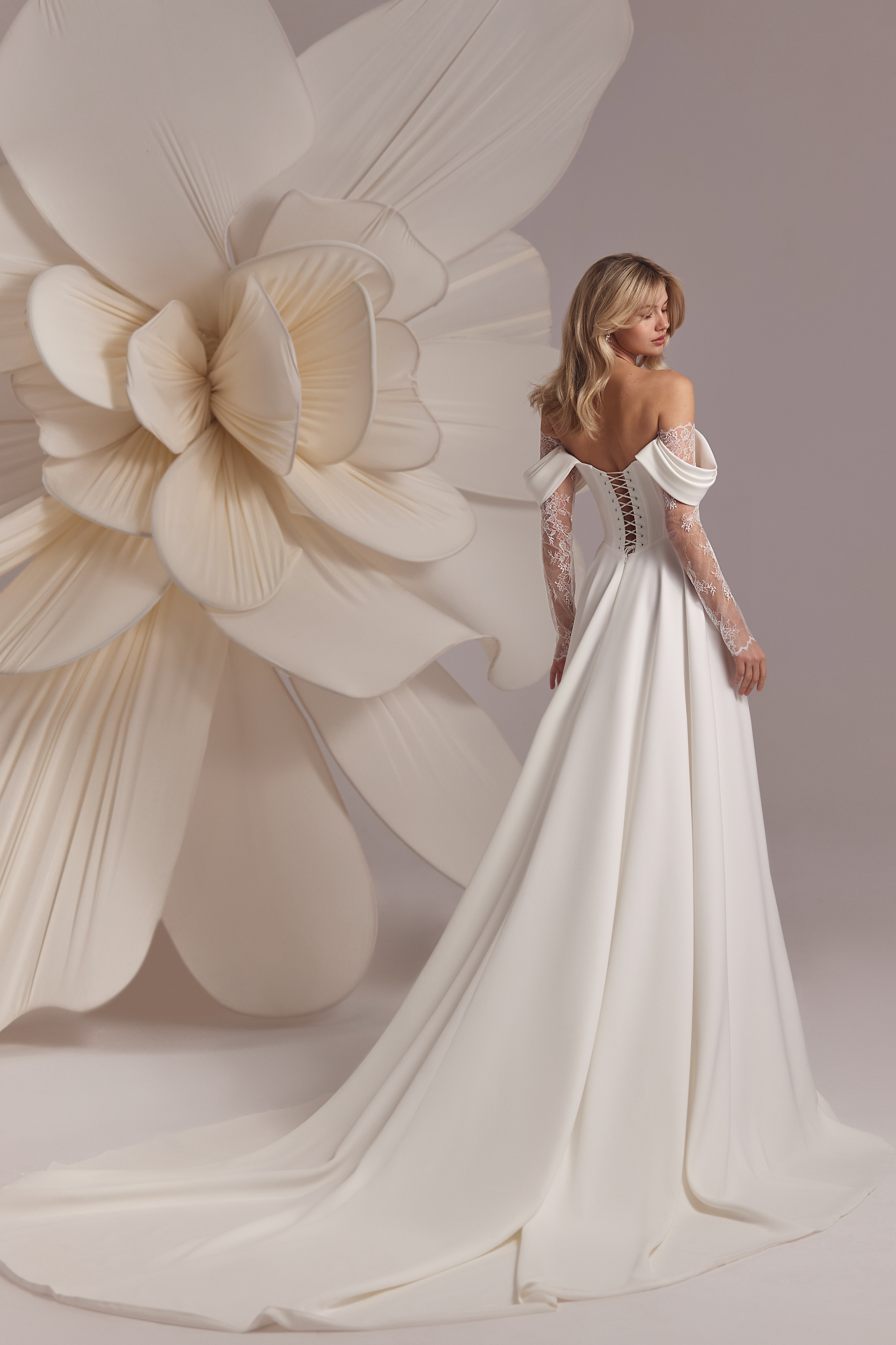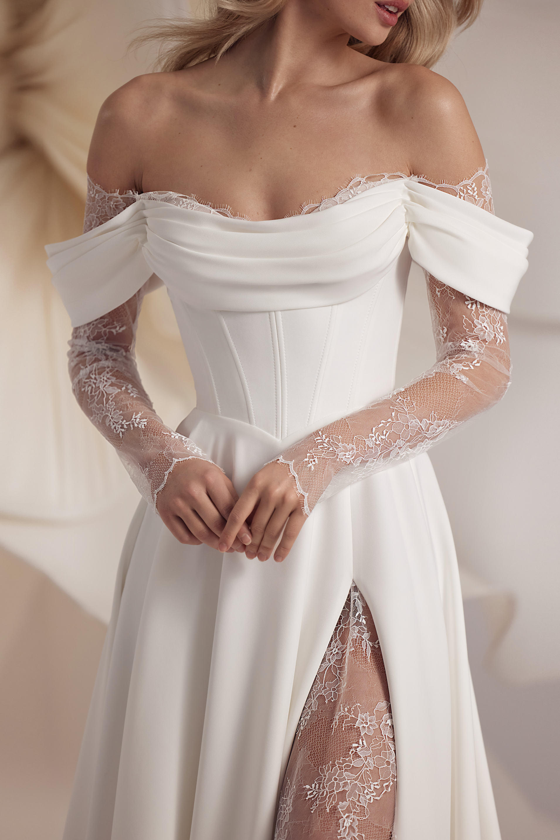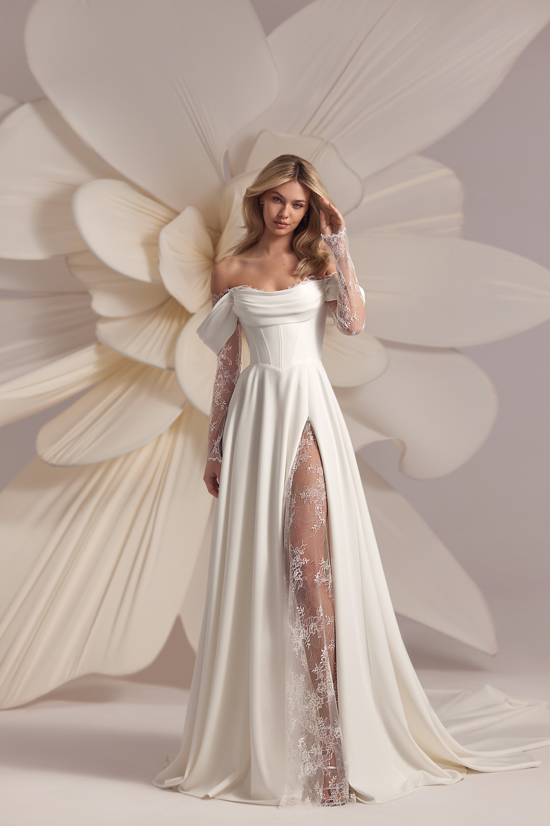 Baccara – an A-silhouette lace-up dress designed with intricate cold-shoulder lace sleeves and a gracefully split skirt. The structure naturally forms soft, elegant folds that cascade over the delicate lace undergown, enhancing its romantic and sophisticated aesthetic.