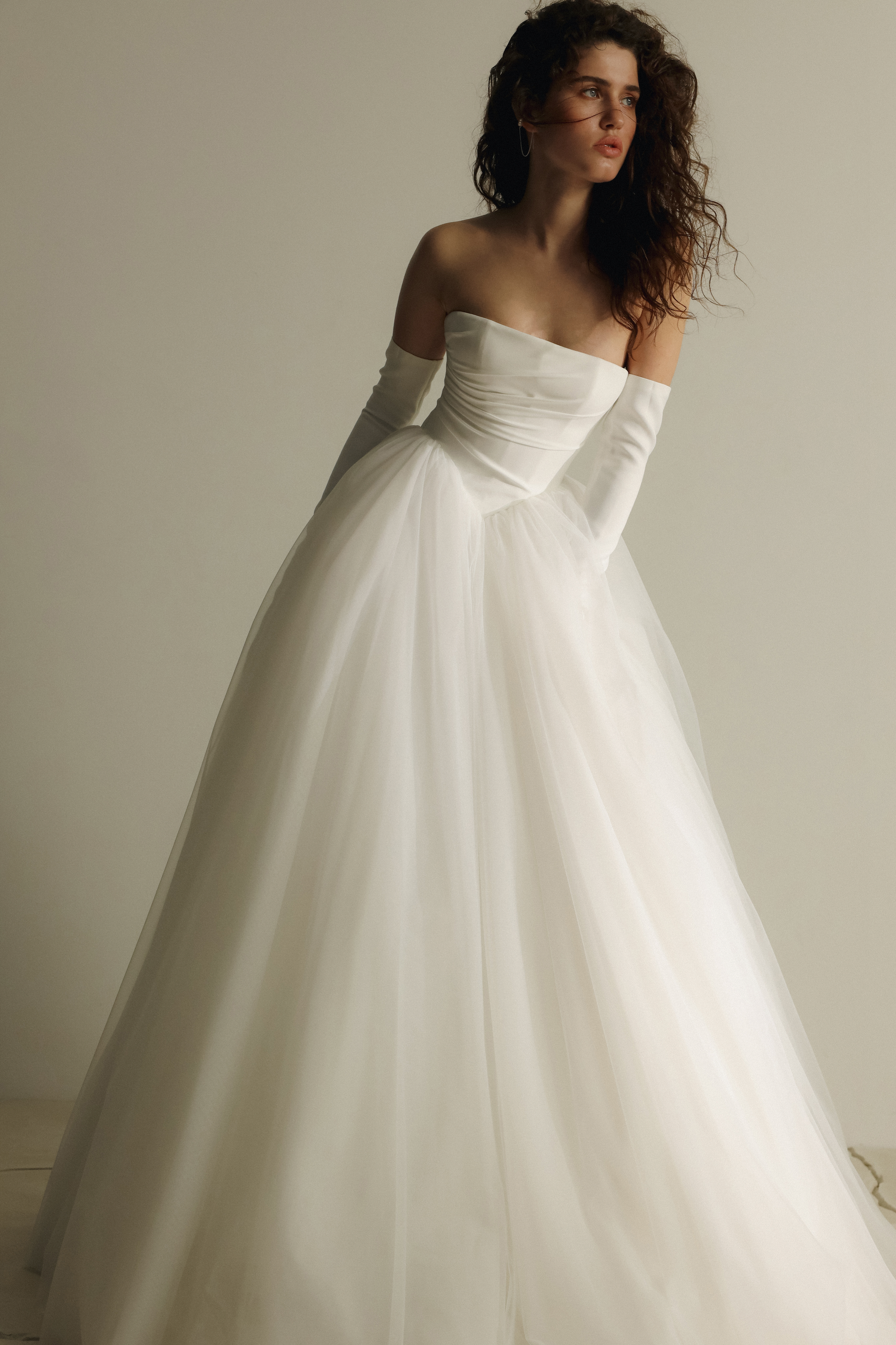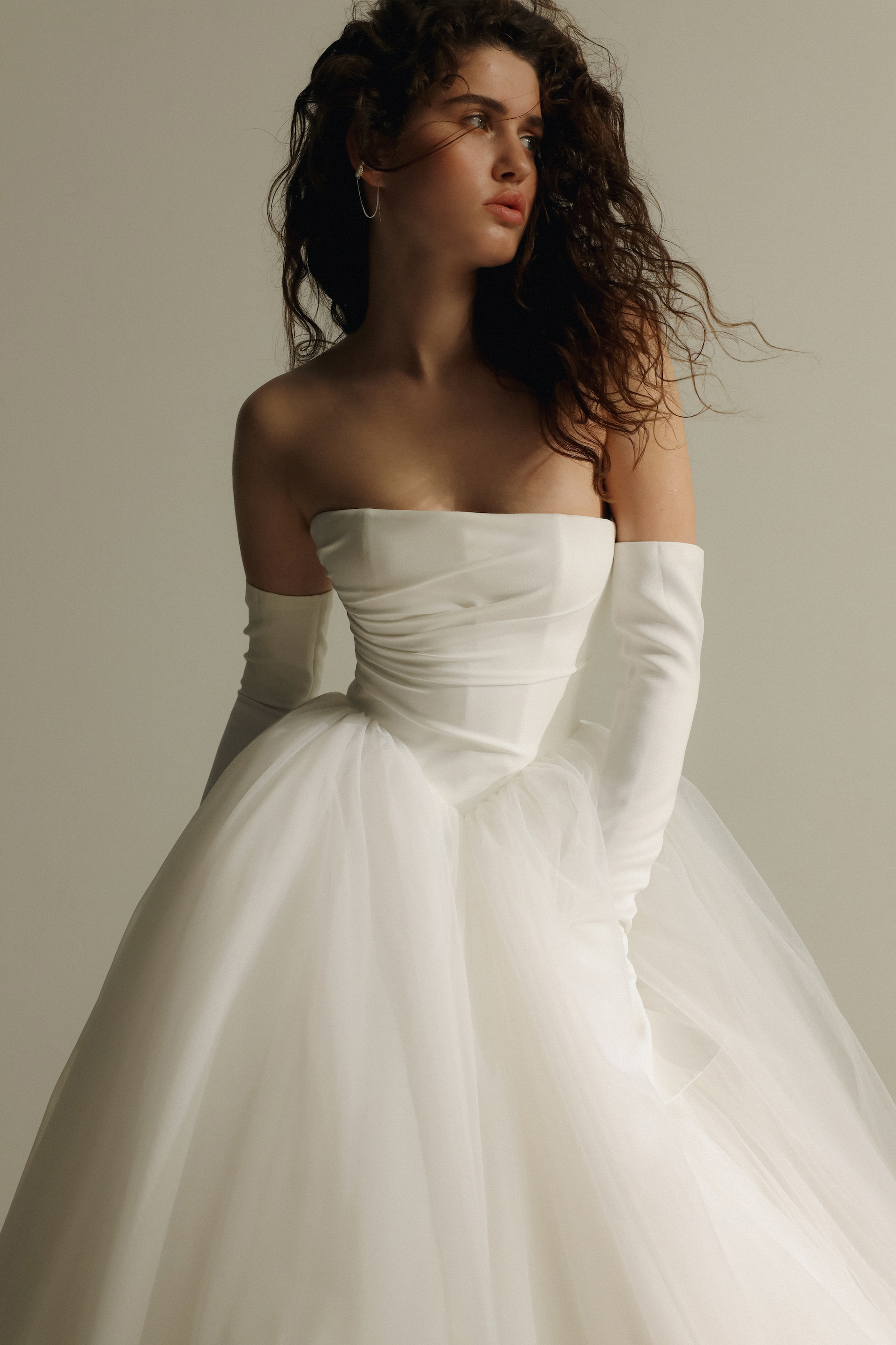 The Bowie gown is a bold and romantic choice, featuring a voluminous silhouette that captures effortless beauty. The structured, draped corset is crafted from tailored suiting fabric, creating a modern and clean contrast to the soft, layered tulle skirt. The combination of textures adds depth and movement, making the gown feel both light and striking. The dress fastens at the back with a concealed closure and is completed with a modest, flowing train.