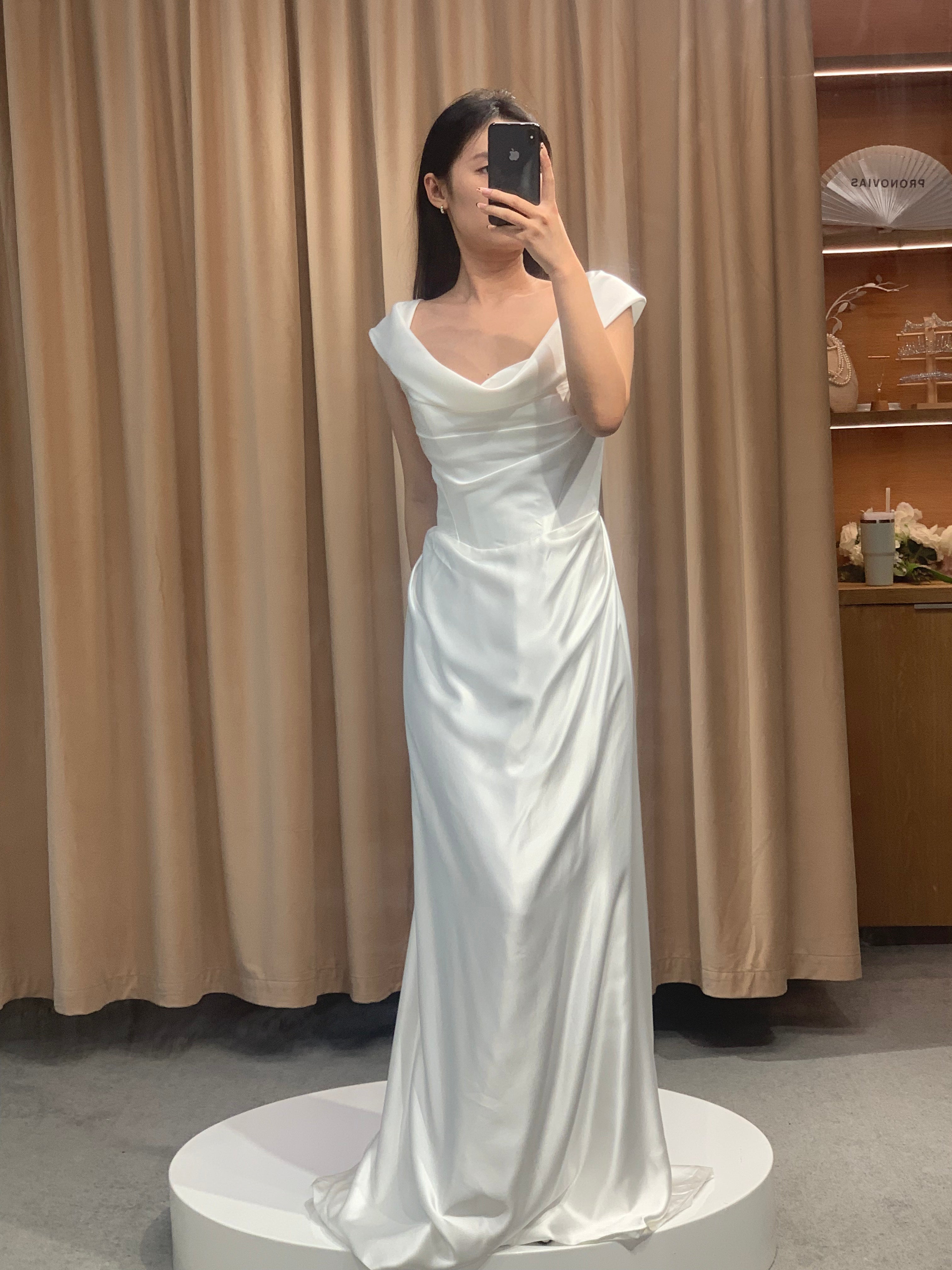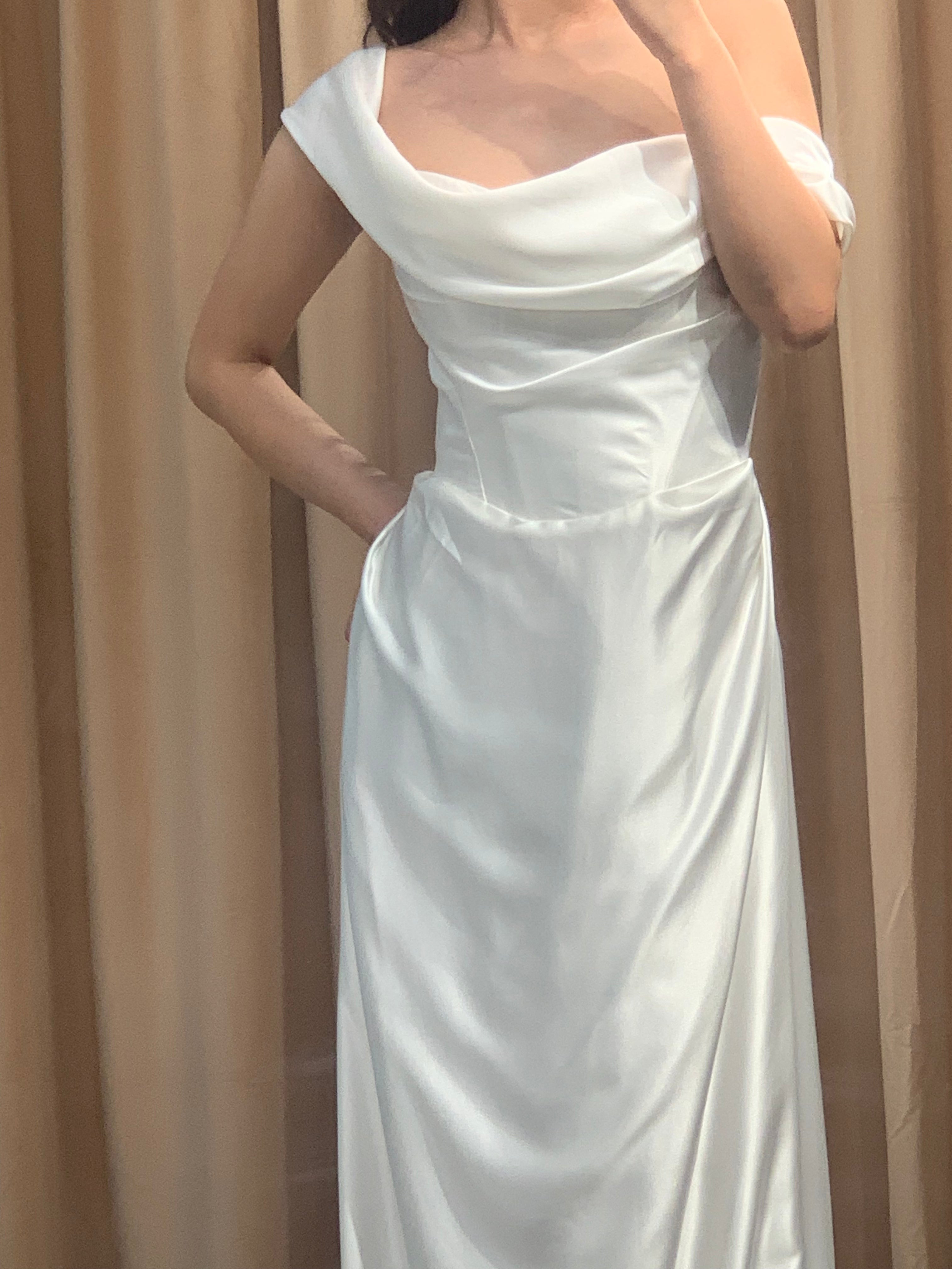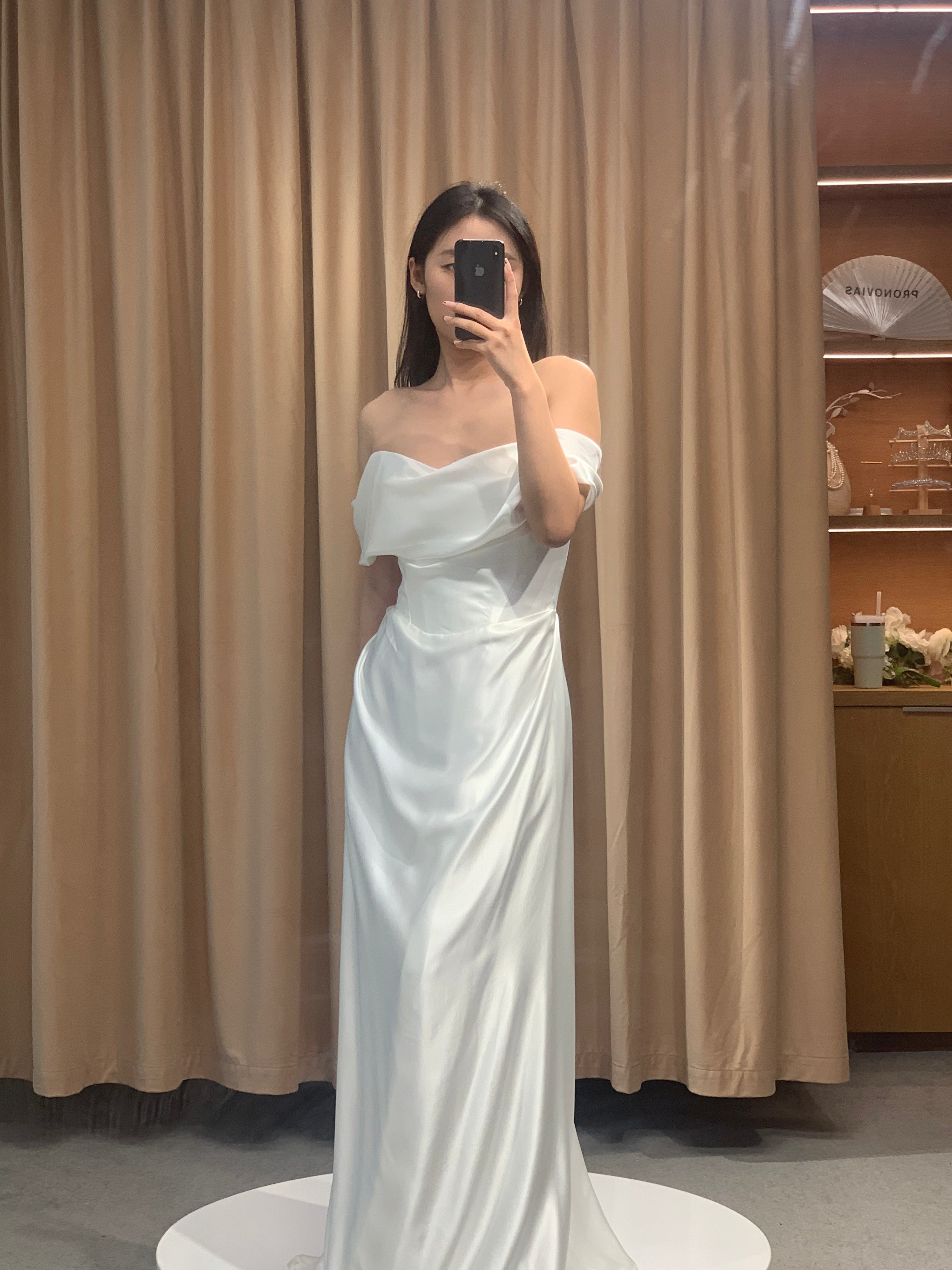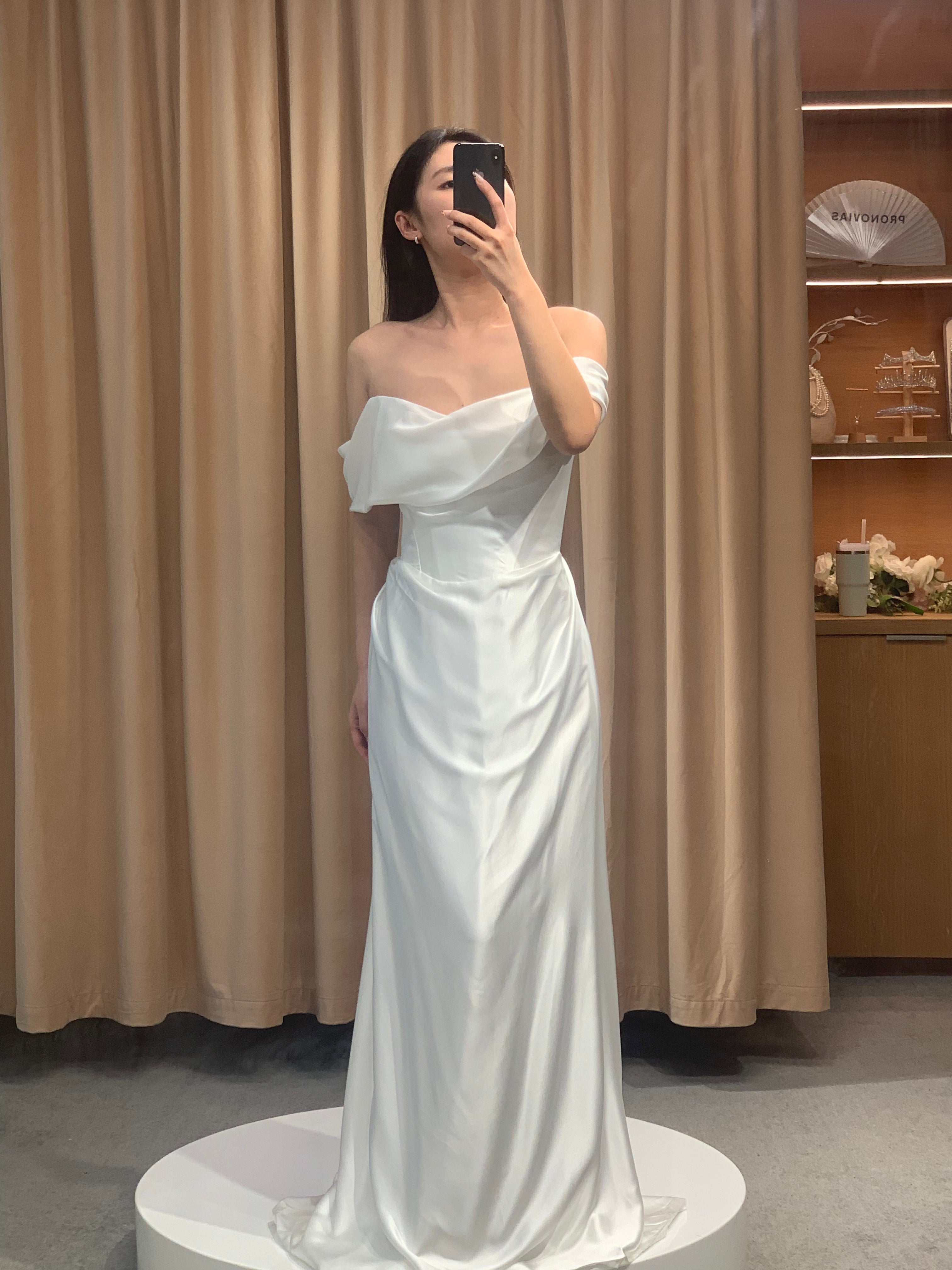 This exquisite satin gown offers a romantic, convertible off-the-shoulder neckline, allowing you to tailor your look from classic to effortlessly dramatic. The magic continues at the skirt, where artful gathering and deep, luxurious draping create a cascade of light and shadow. Every step is a movement of pure elegance in this timeless yet contemporary masterpiece.