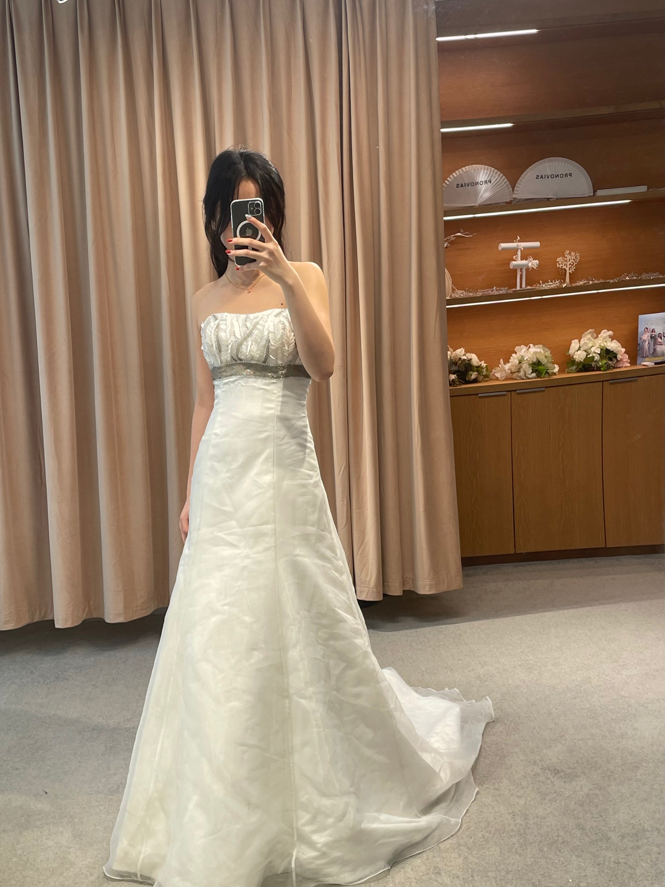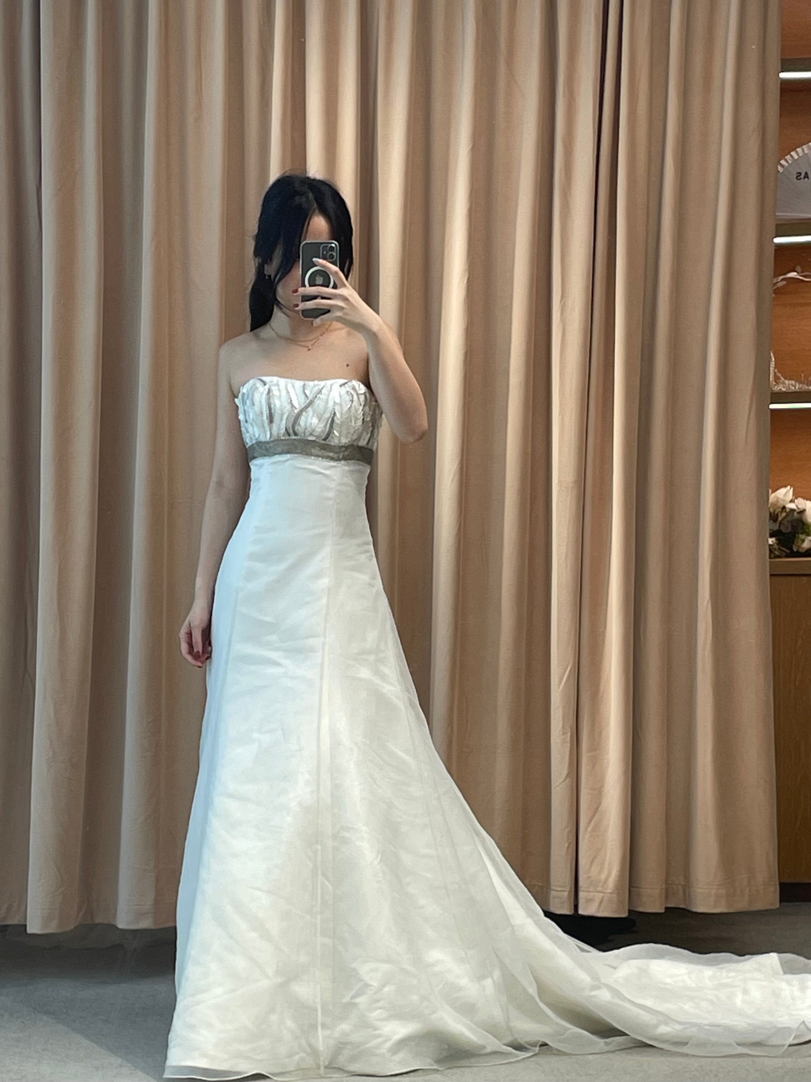 Sample sale gowns can be altered down from their original size for a perfect fit. Alterations incur additional charges. If you wish to use our in-house tailor, measurements must be taken in-store. Minor issues such as zipper repairs, small holes, or slight bead loss can be fixed by our in-house tailor at no extra cost.
