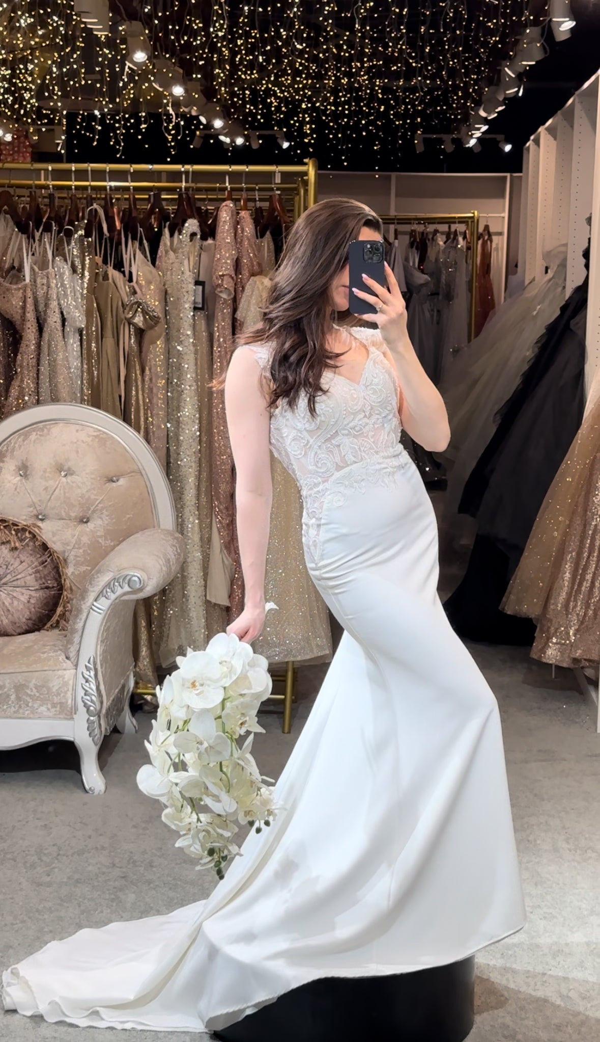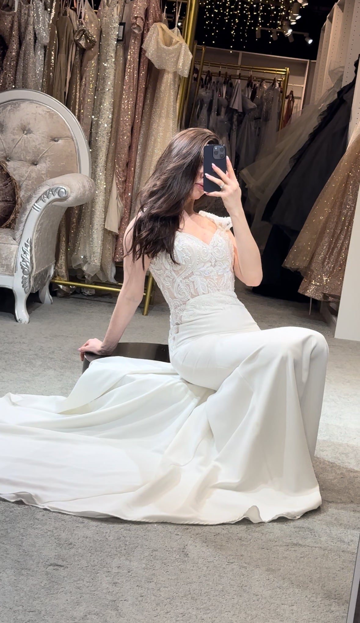 Step into a space designed for comfort and luxury. Our fitting rooms offer soft, cozy seating areas for you and your guests, along with an assortment of shoes to complement your dresses. Our curtains curate a private and safe environment, while our luxurious carpet and lighting ensure you feel pampered as you search for your dream gown. Book your appointment today and visit us to create a truly unforgettable experience.