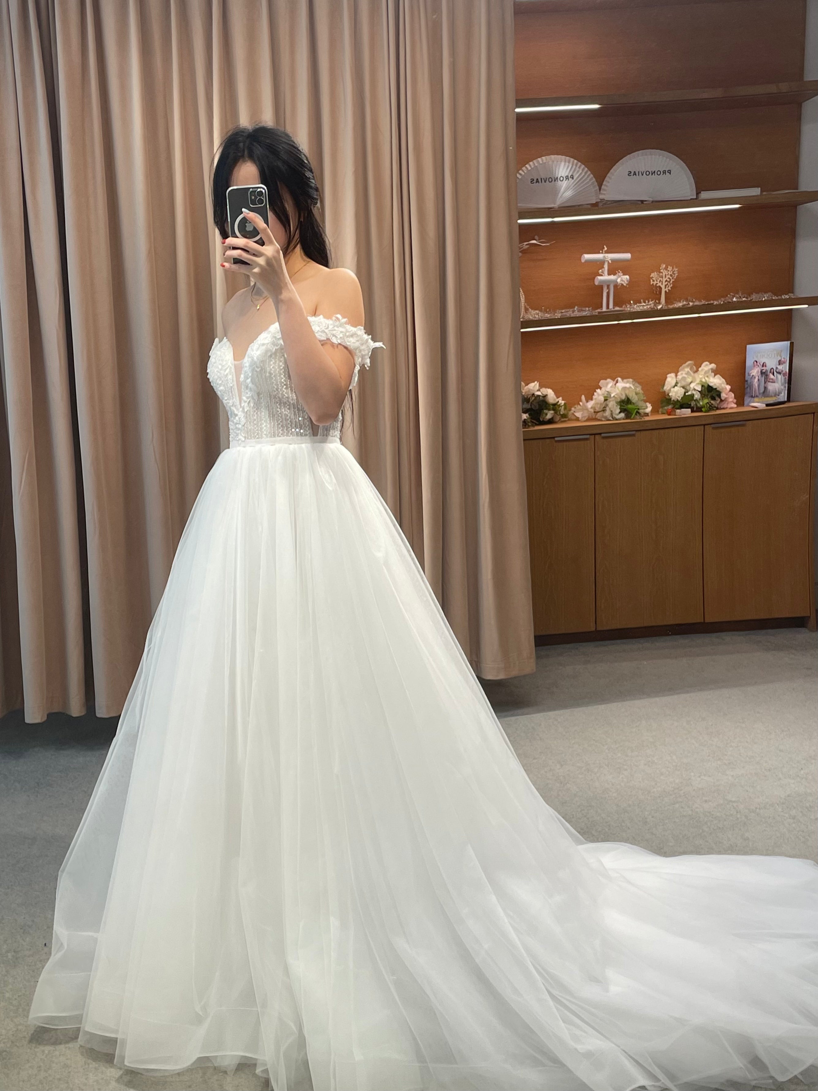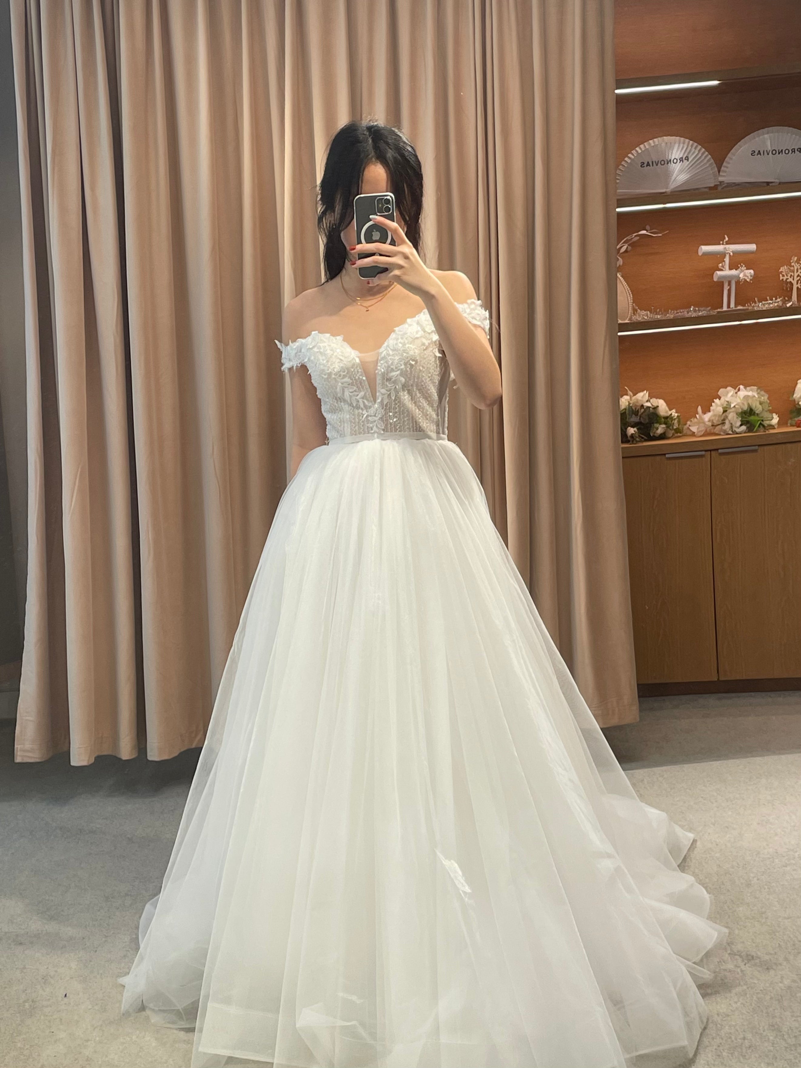 Step into a space designed for comfort and luxury. Our fitting rooms offer soft, cozy seating areas for you and your guests, along with an assortment of shoes to complement your dresses. Our curtains curate a private and safe environment, while our luxurious carpet and lighting ensure you feel pampered as you search for your dream gown. Book your appointment today and visit us to create a truly unforgettable experience.