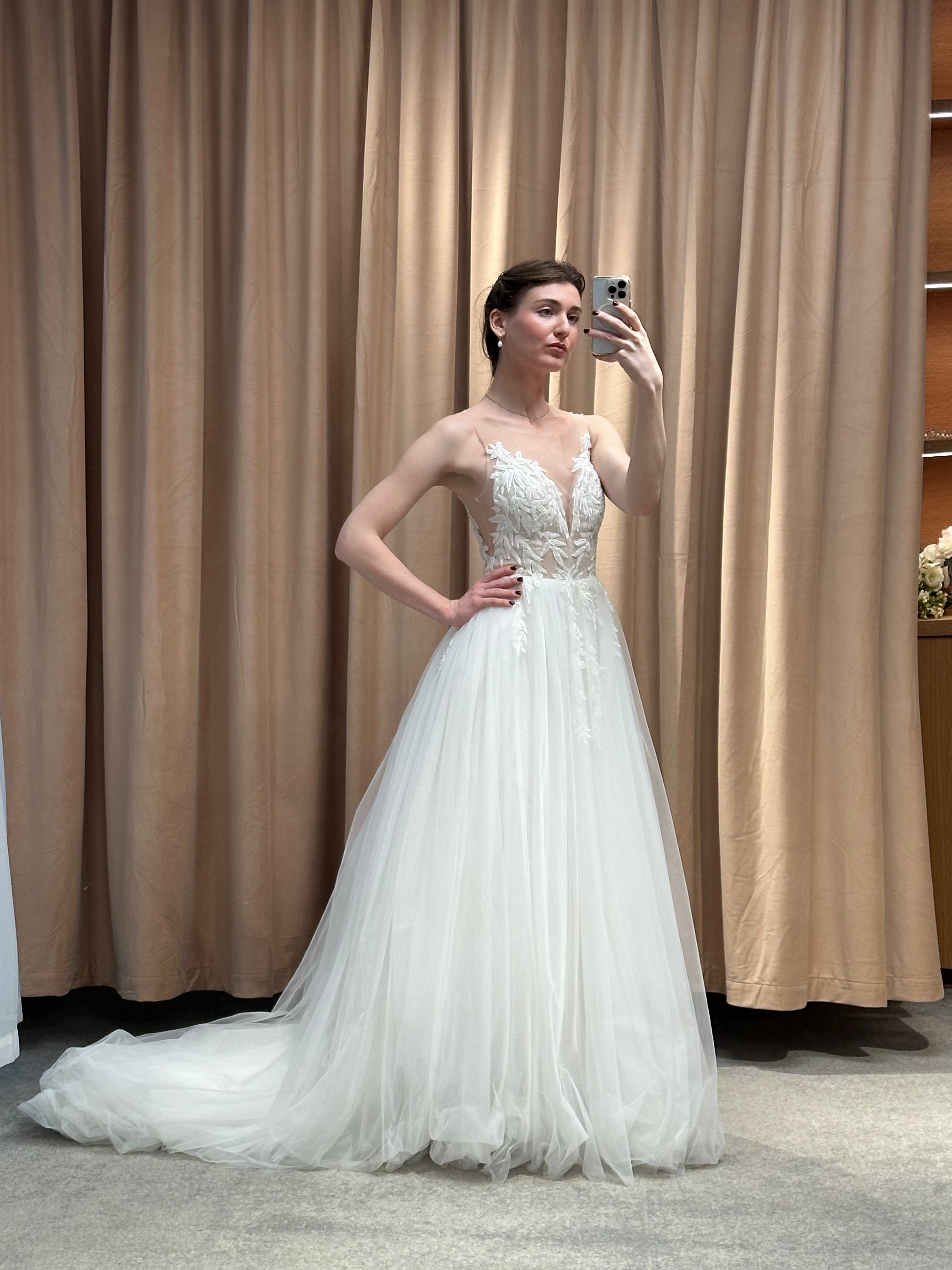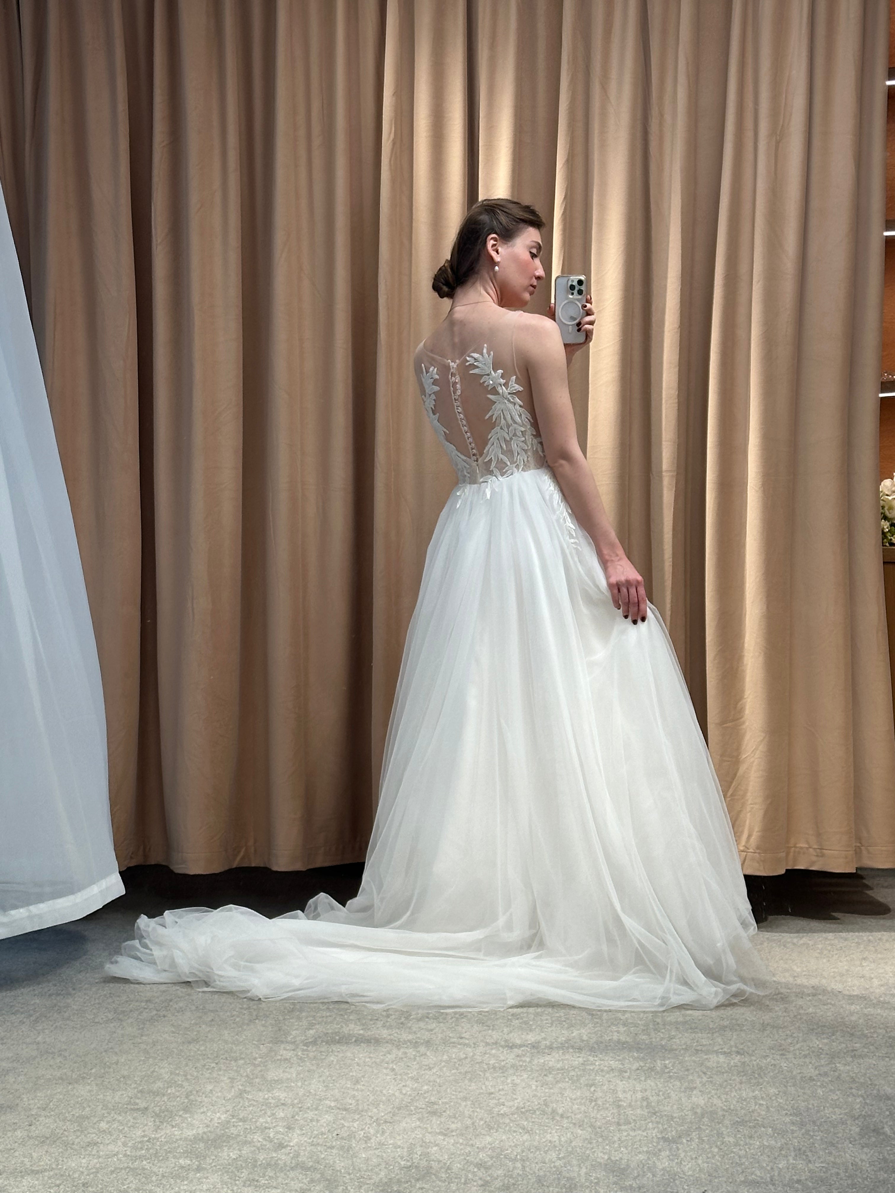 This stunning wedding dress combines modern sophistication with timeless elegance. The V-neckline and high-back design create a flattering and graceful silhouette, while a row of sparkling crystal buttons down the back adds a touch of luxury and drama. The bodice features a sheer mesh with a delicate nude lining, offering a sensual yet tasteful transparency. The skirt flows effortlessly into a pure, soft tulle design, creating a dreamy and ethereal look.