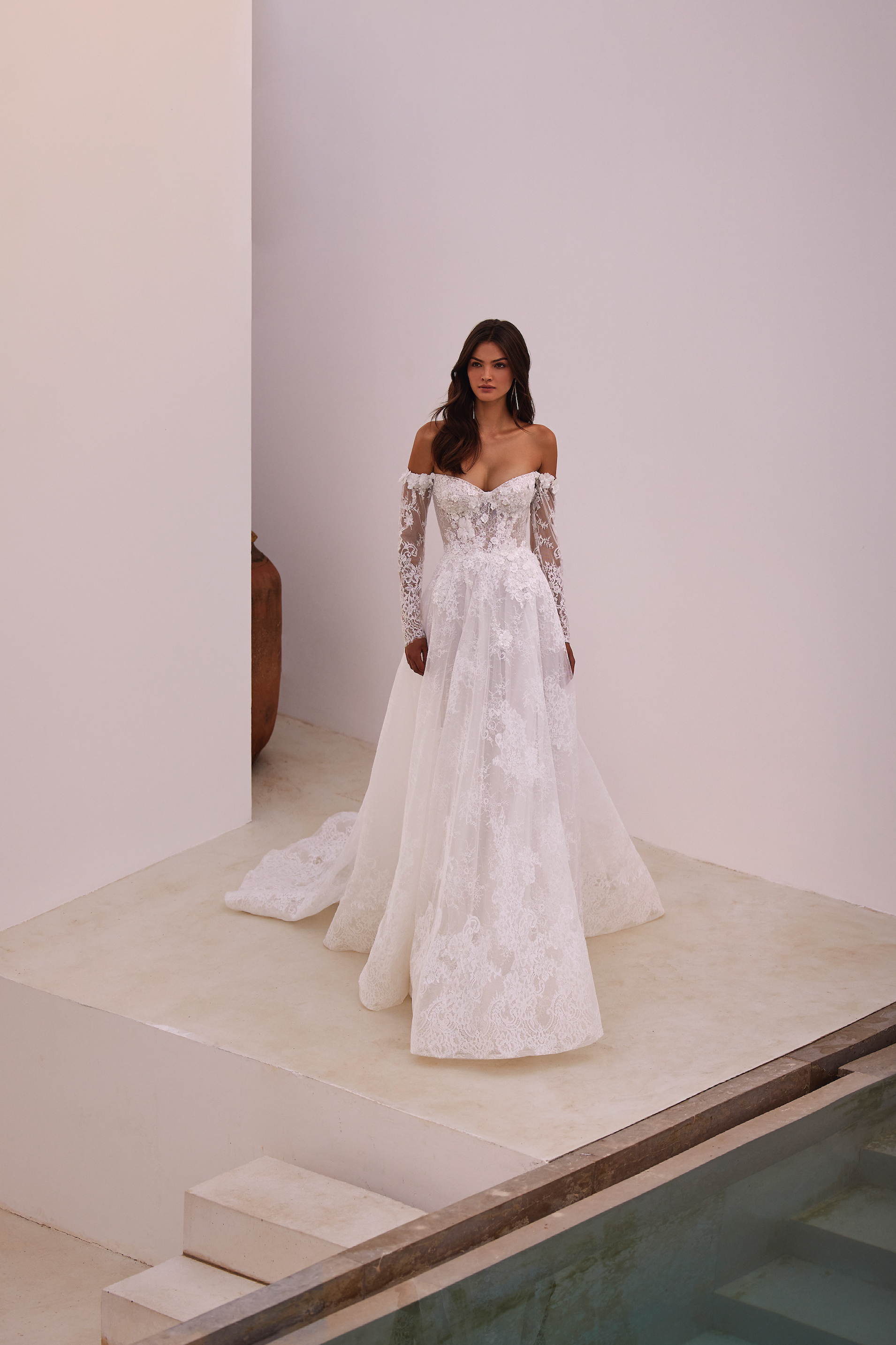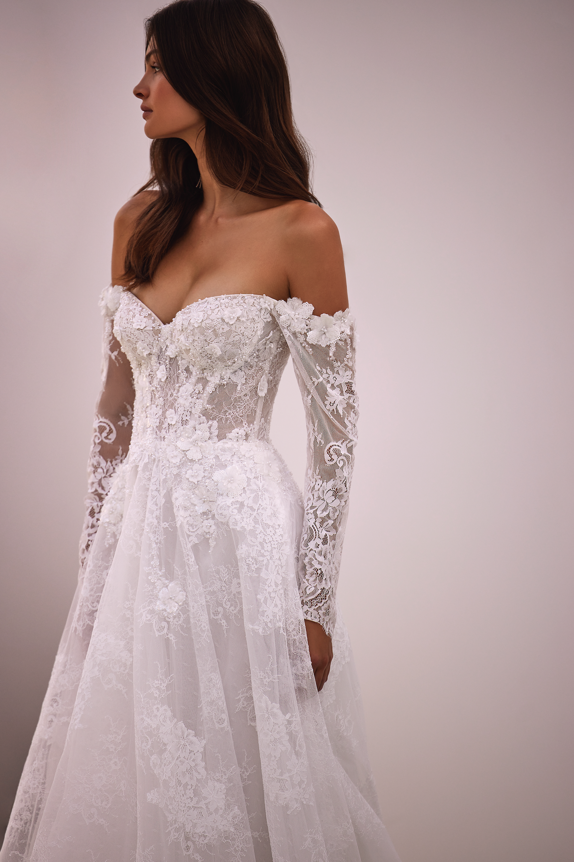 Spectacular long-sleeved off-the-shoulder A-line wedding gown made from chantilly floral lace embellished with sequins and 3D floral applique. Featuring a semi-sweetheart neckline, off-the-shoulder long sleeves, a semi-transparent boned embellished bodice, lace-up or zipper closure on the back, and a lace embroidered princess skirt with a midi train.