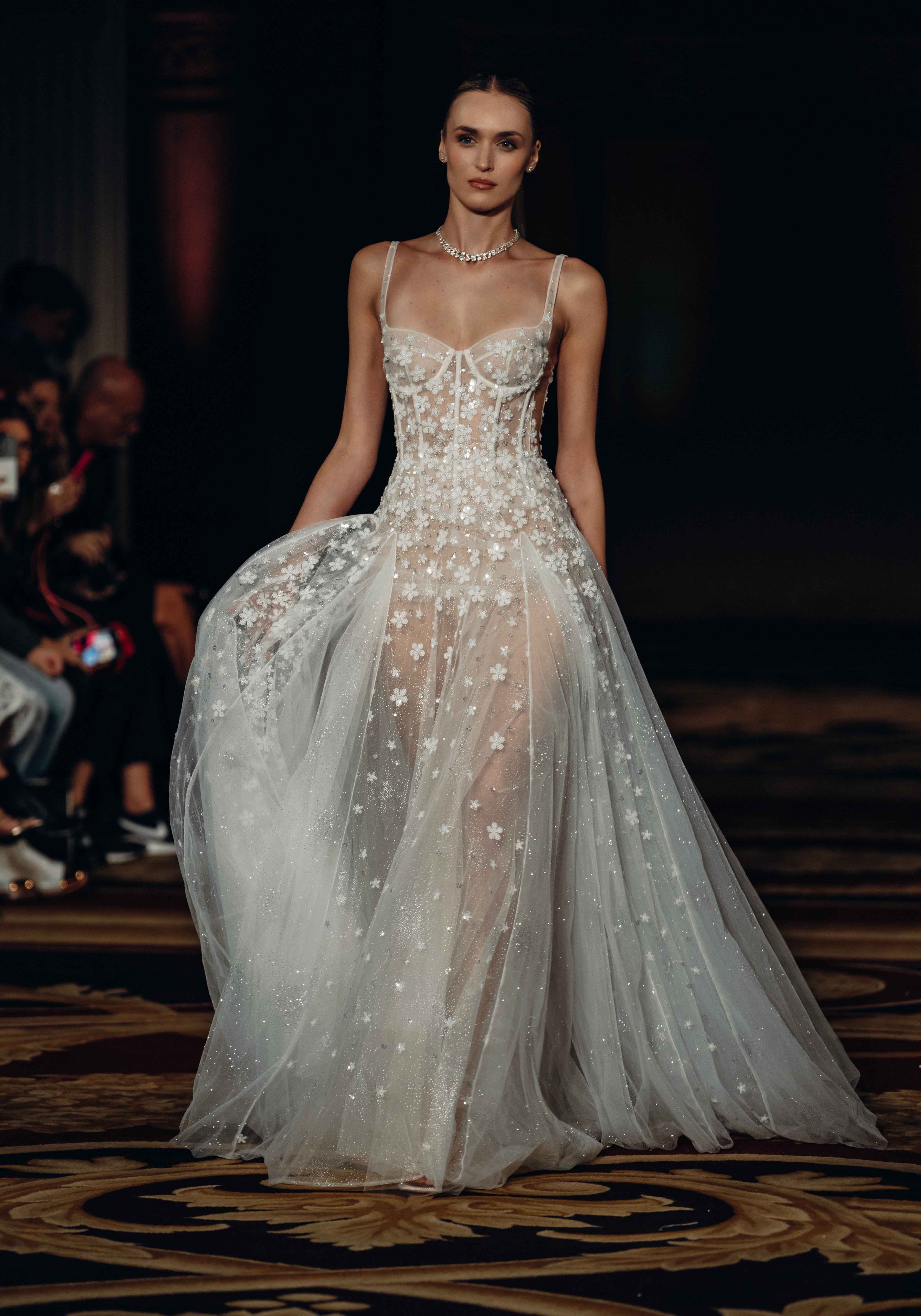 From Muse by Berta, this A-line gown shimmers with an all-over motif of delicate, sparkling florals that gracefully cascade down the body. The ethereal pattern softens into a sheer skirt, creating a breathtaking gradient effect. Slender straps complete a look of modern fairy-tale romance.