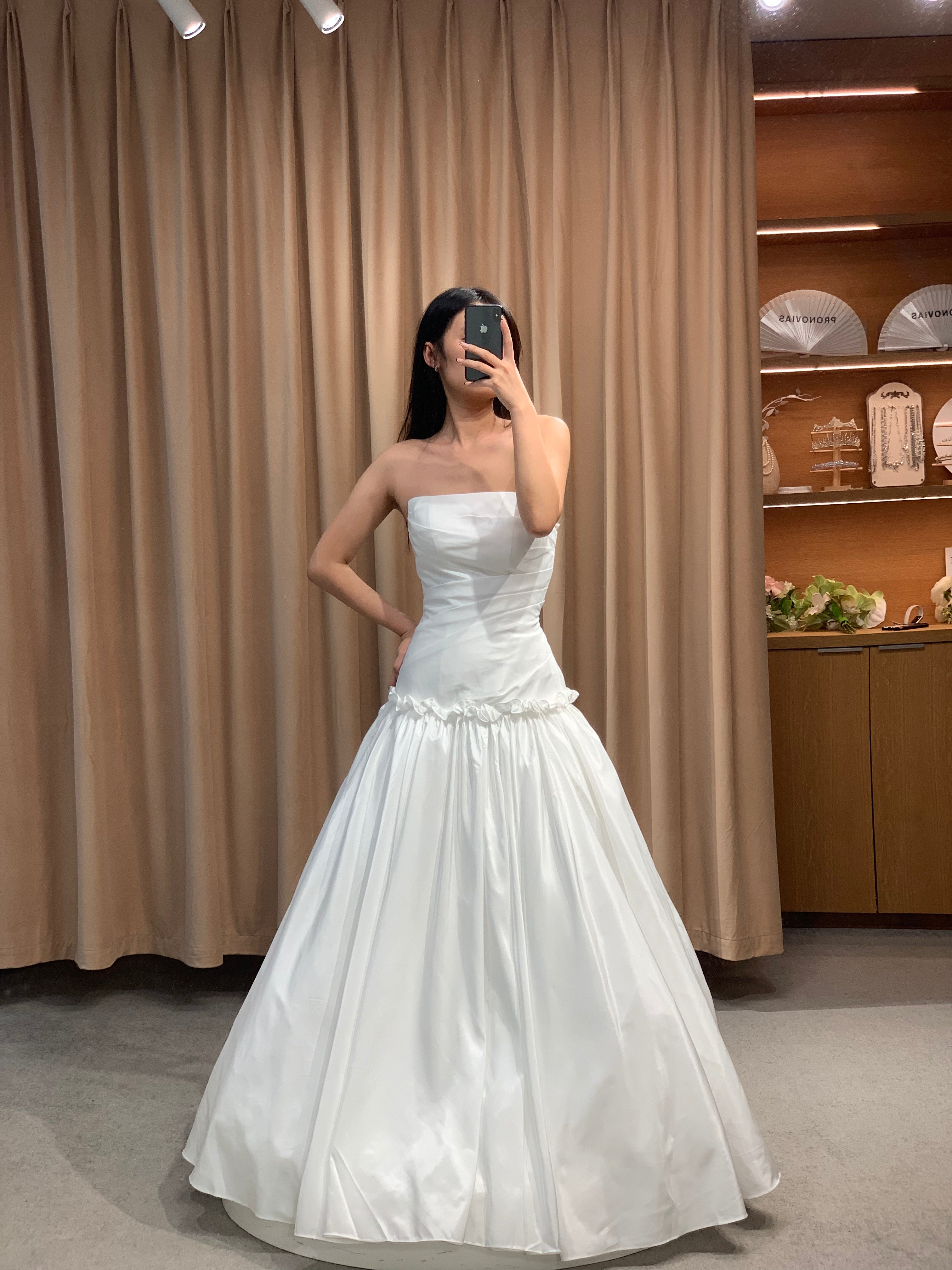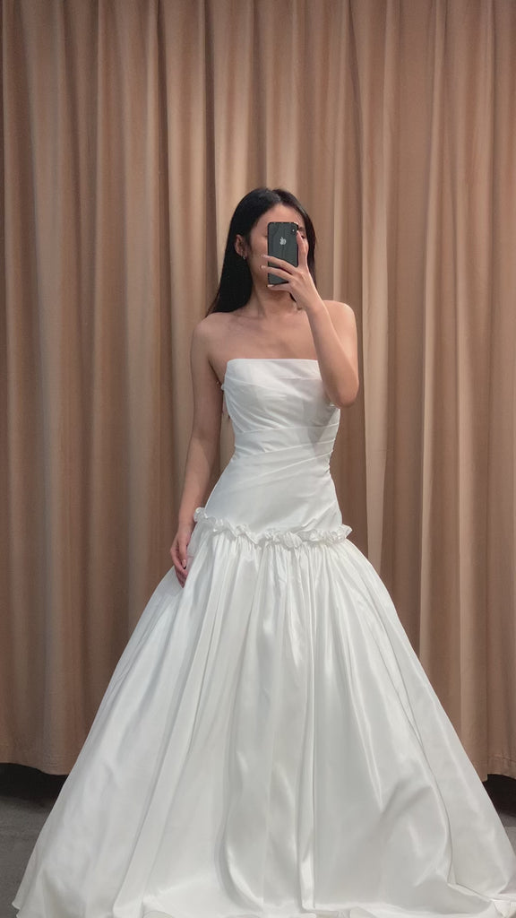 This exquisite wedding gown features a beautifully dropped waistline that creates an elongating silhouette, accented with delicate 3D floral appliqués at the bodice. Crafted from pristine satin, the dress combines luxurious simplicity with dramatic volume in its full ball gown skirt. The clean fabric allows the intricate floral details to shine as the focal point of the design.