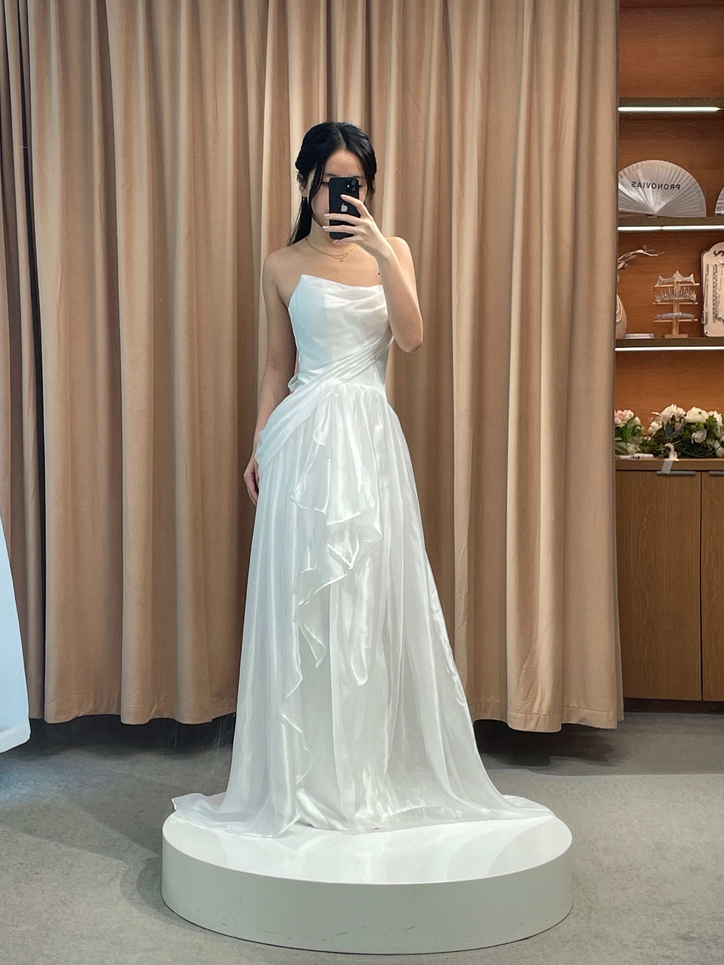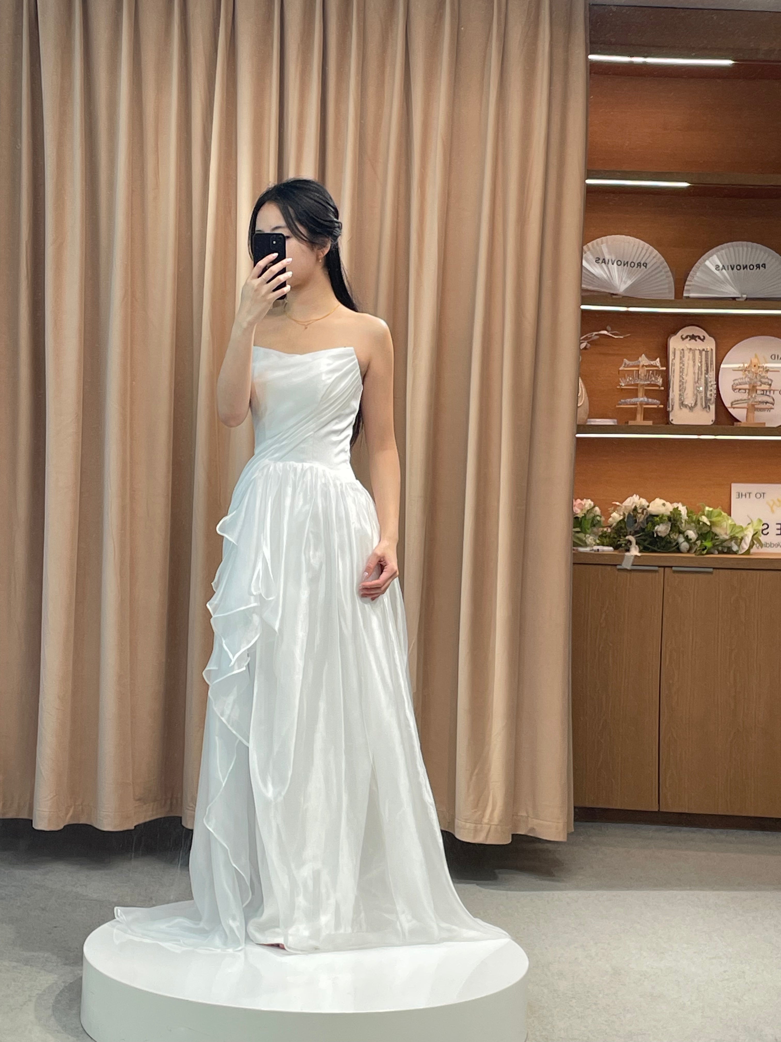This dress has a dreamy, fairy-like feel with its delicate strapless bodice and flowing layers. The soft ruffle detail down the skirt adds a whimsical touch, making it look light and airy. It’s the kind of gown that feels effortless, almost like it’s floating.