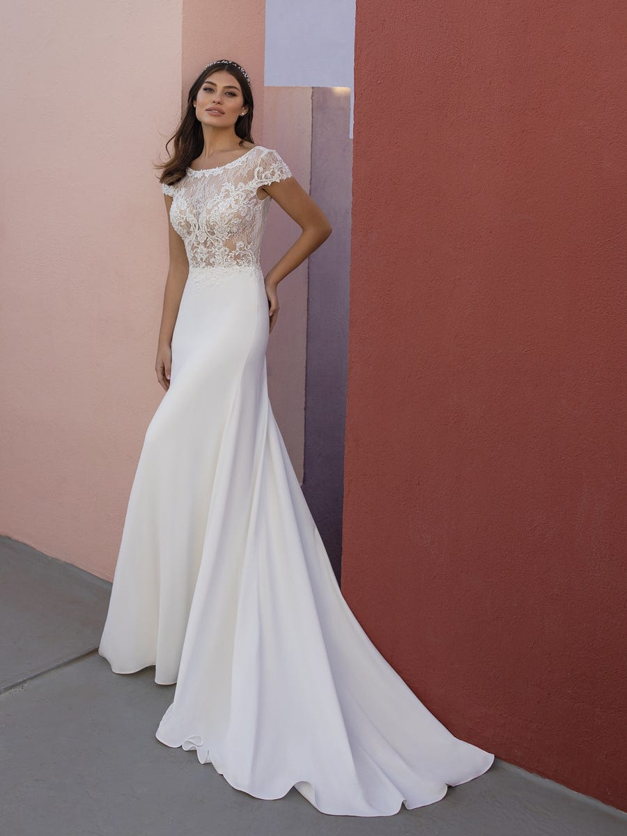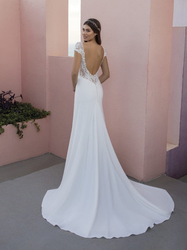 This enchanting A-line gown features delicate cap sleeves and an open back, combining elegance with a touch of allure. The lace-adorned bodice adds intricate detail, while the flowing skirt cascades effortlessly for a light, romantic feel.