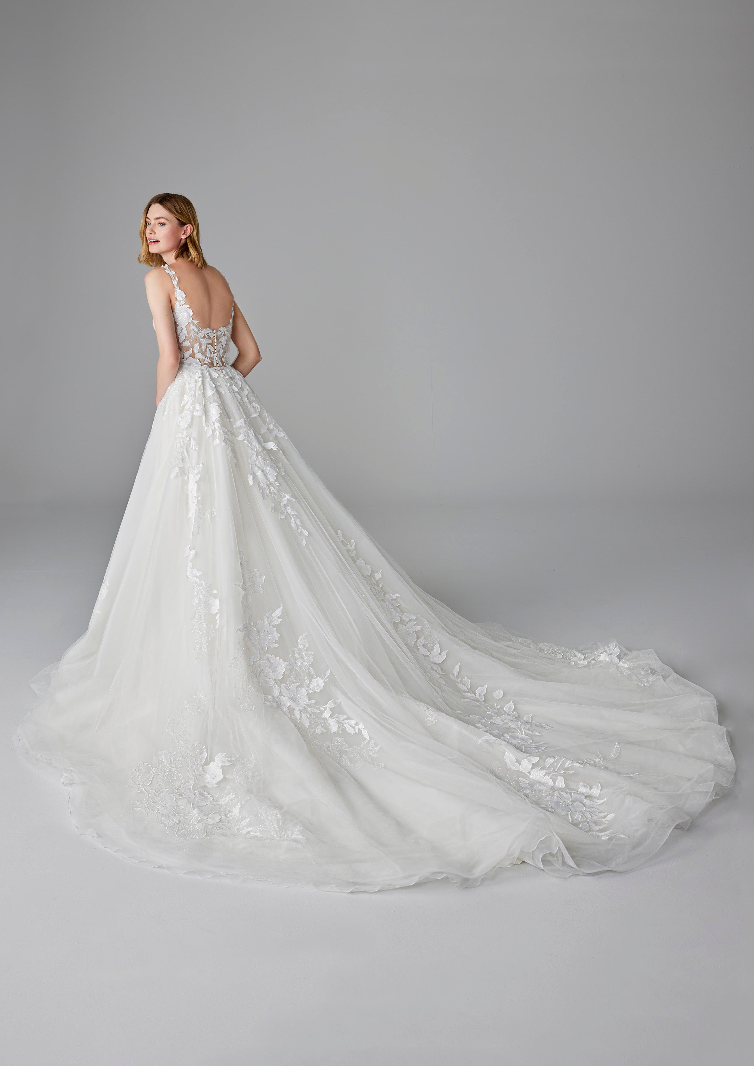 This enchanting Ball Gown wedding dress features a plunging V-neckline and delicate lace appliqués, exuding timeless elegance. The flowing tulle skirt adds a touch of ethereal beauty, while the open back enhances its romantic allure.
