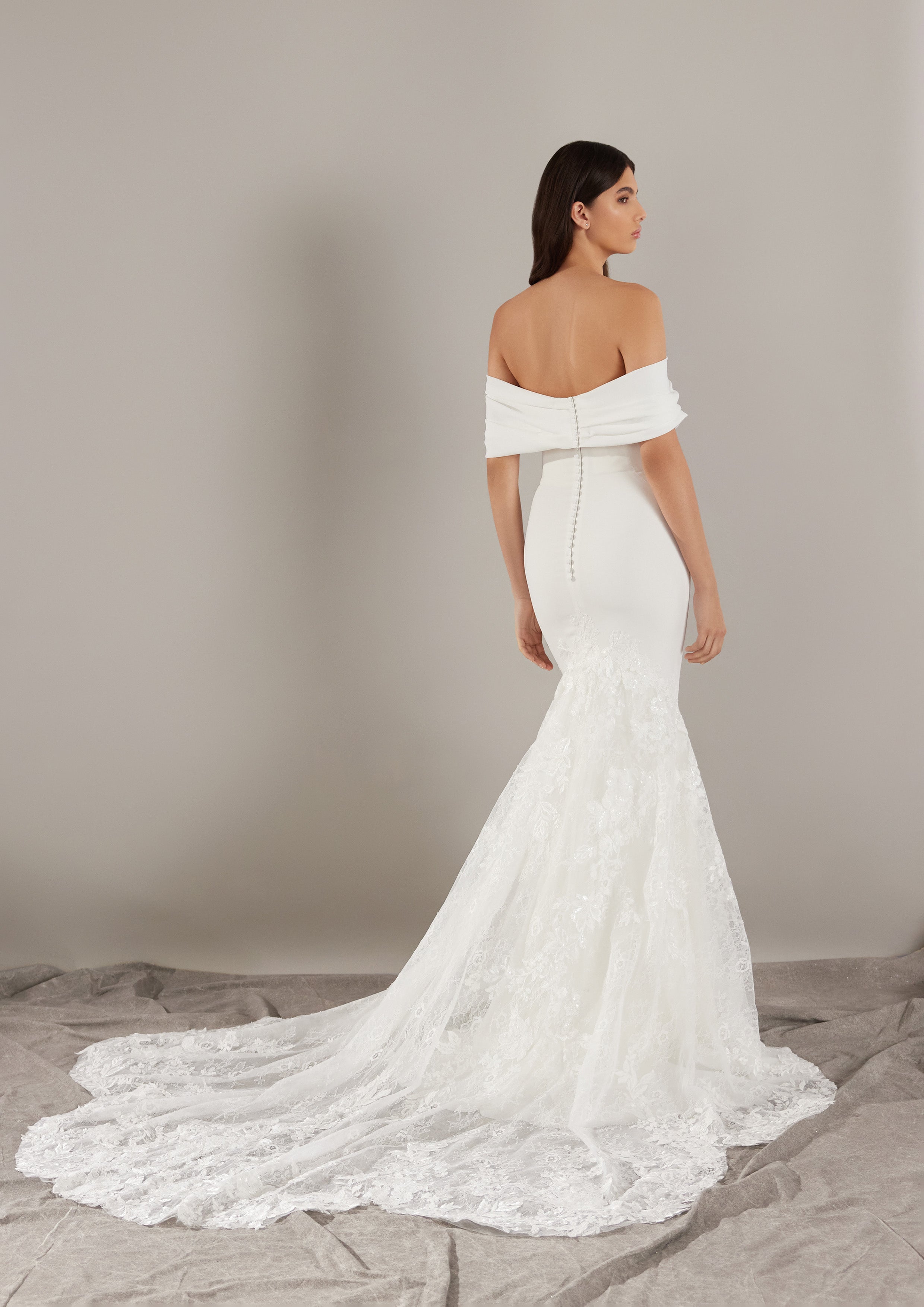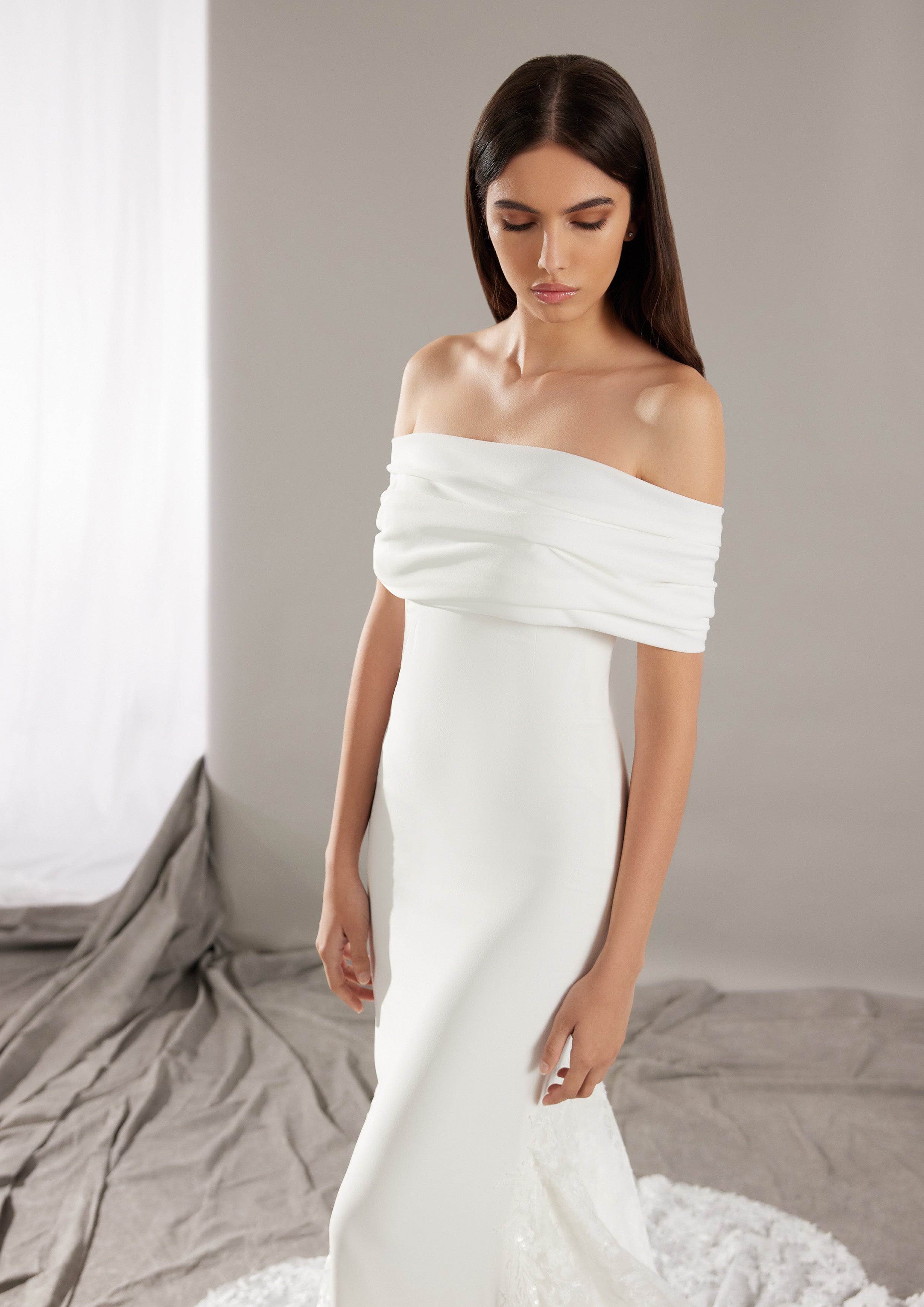 This sophisticated mermaid wedding gown features an off-the-shoulder neckline and is crafted from luxurious crepe fabric, offering a sleek and modern silhouette. The fitted bodice gracefully transitions into a flared skirt, complemented by a chapel-length train that adds a touch of elegance.