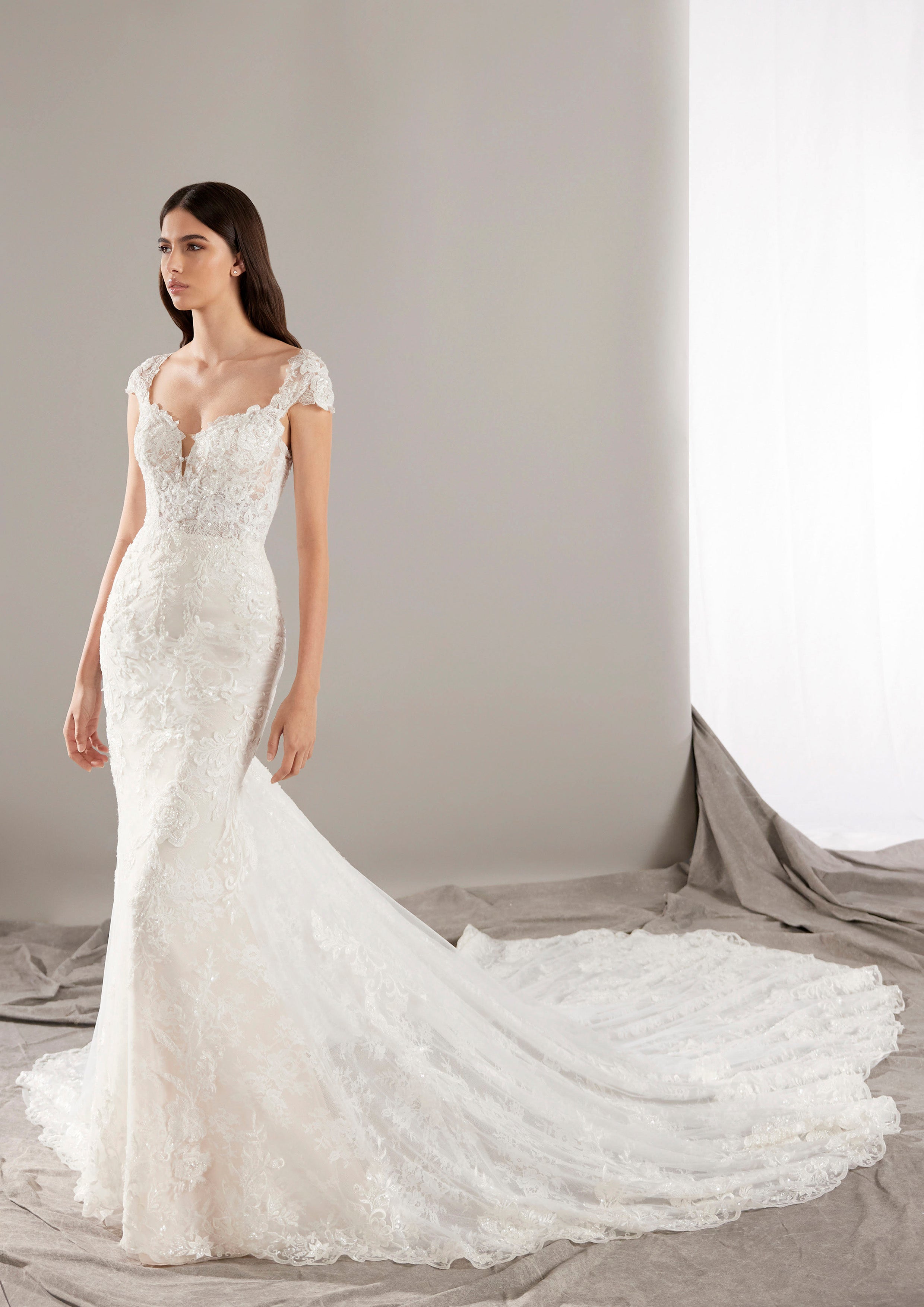 This romantic mermaid wedding dress features a V-neckline, delicate lace appliqués, and charming cap sleeves for a touch of vintage elegance. The open back, framed by intricate lace detailing, adds a modern and alluring element. Completing the look is a flowing skirt and chapel-length train.