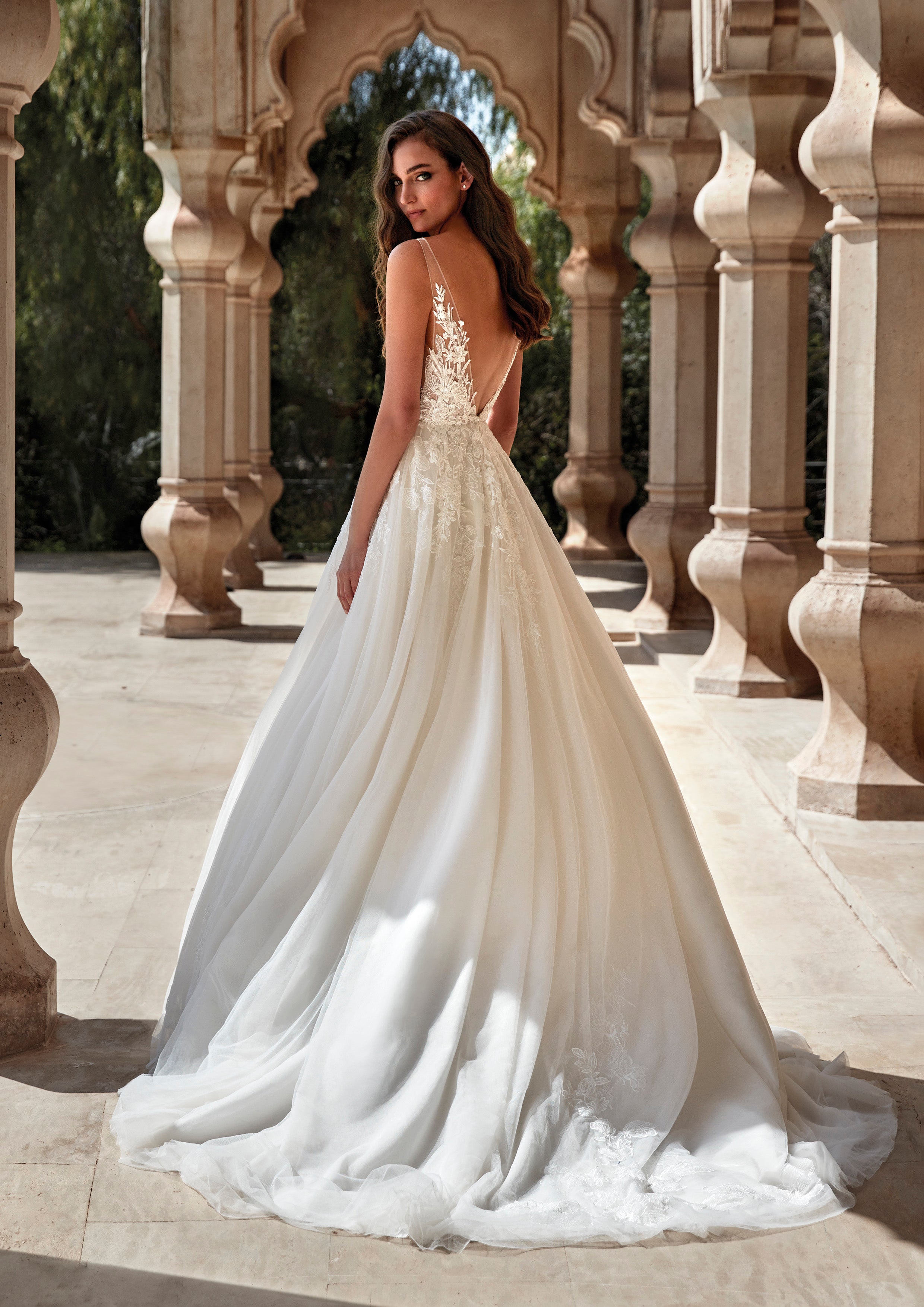 This enchanting A-line wedding dress features a V-neckline and delicate lace appliqués, exuding timeless elegance. The flowing tulle skirt adds a touch of ethereal beauty, while the open back enhances its romantic allure. Ideal for brides seeking a harmonious blend of classic sophistication and modern grace.