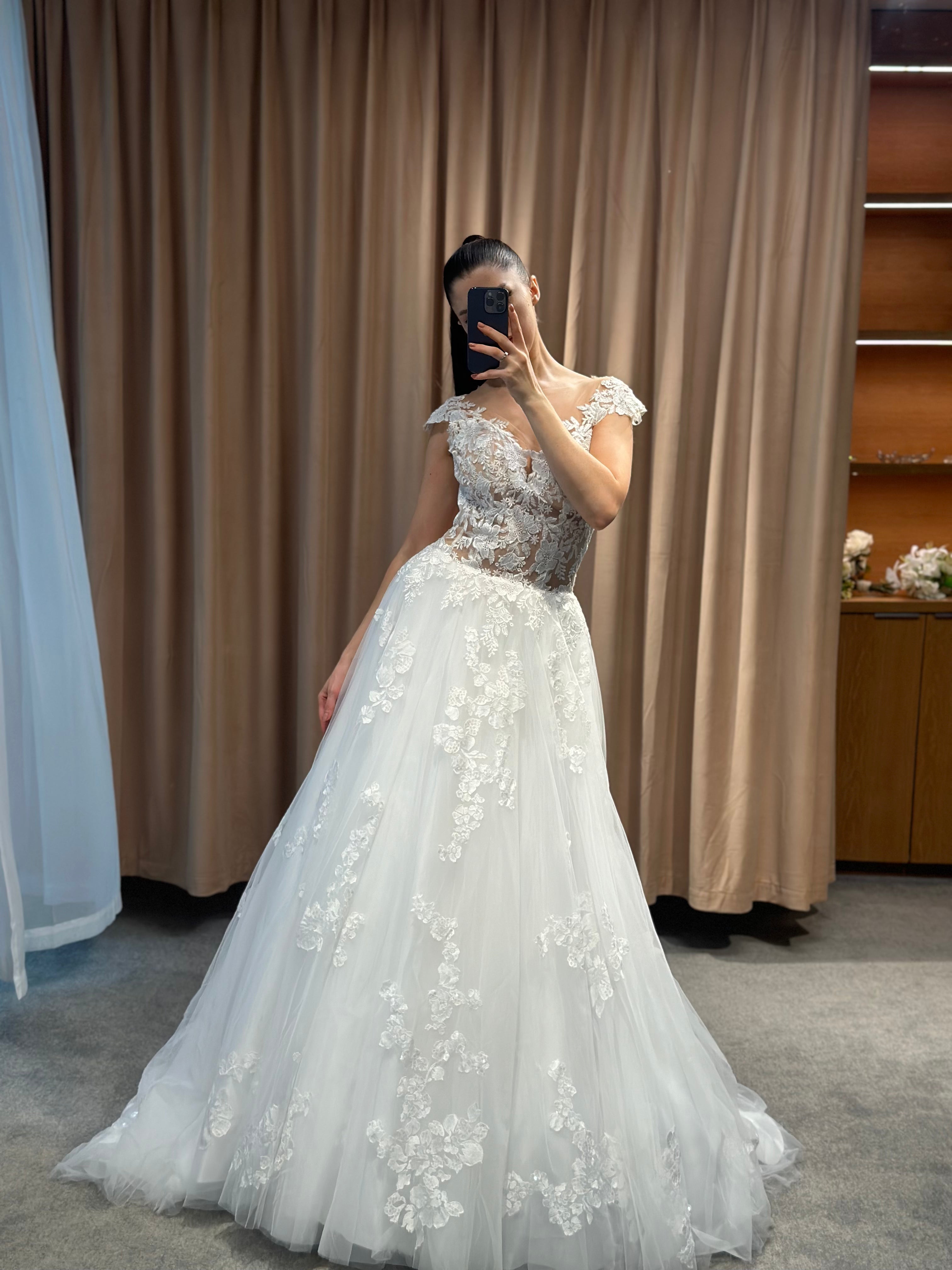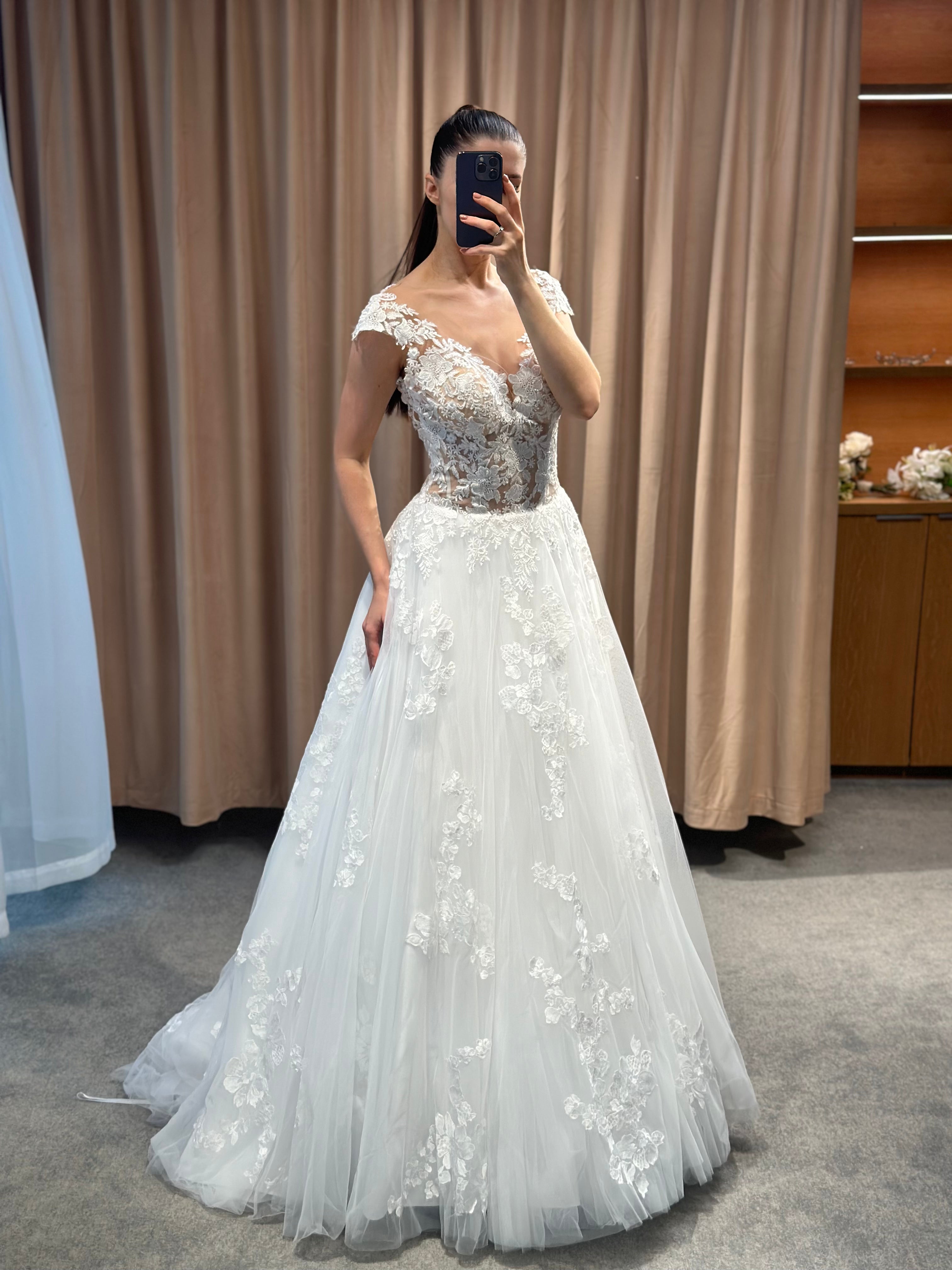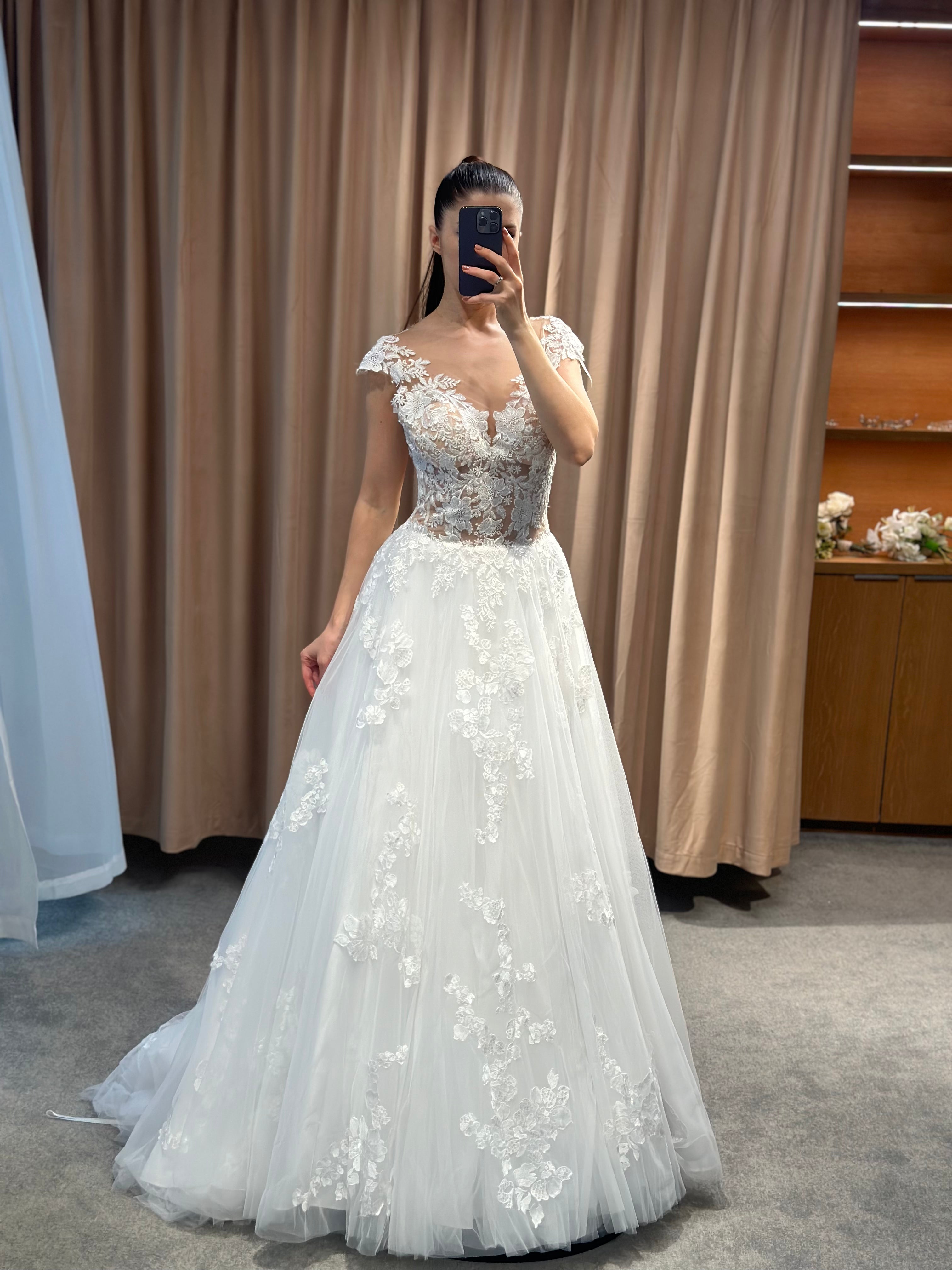 Radiate elegance and grace in this stunning A-line wedding gown. The sheer bodice features intricate lace embroidery, creating the illusion of lace delicately draping over the skin for a romantic and ethereal effect. The high-back design adds a touch of sophistication and provides a seamless, elegant finish. The flowing tulle skirt completes the look, offering soft movement and a dreamy silhouette.