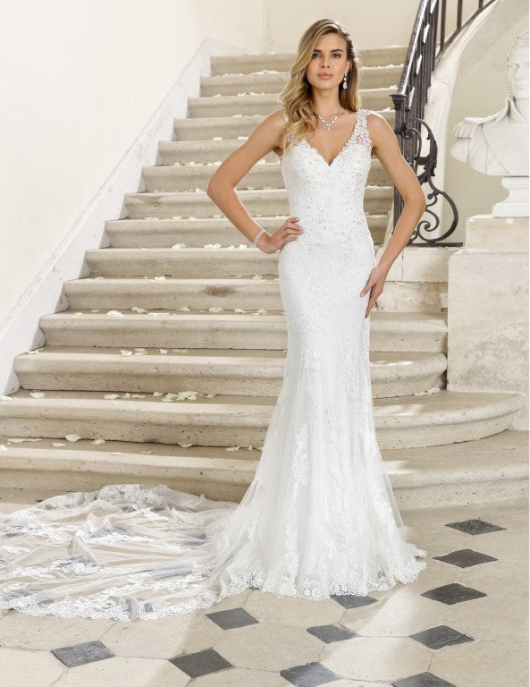This captivating mermaid gown features a dramatic V-neckline and is adorned with intricate lace from bodice to hem. The lace detailing enhances the figure-hugging silhouette, creating an elegant and romantic design.
