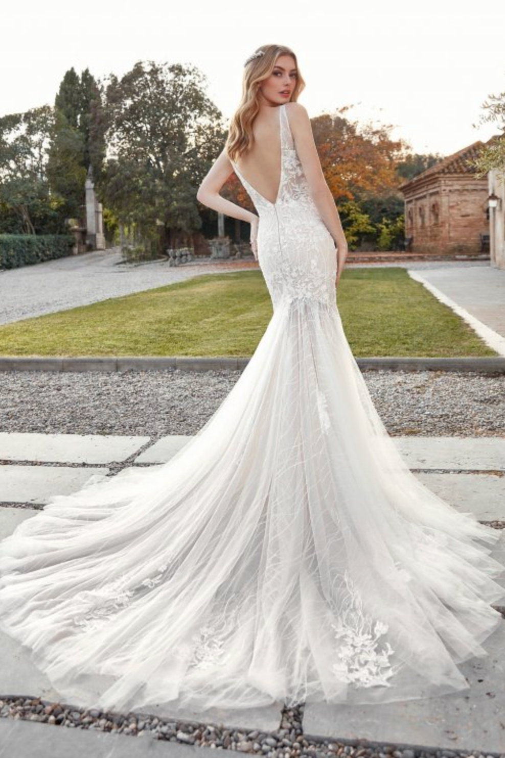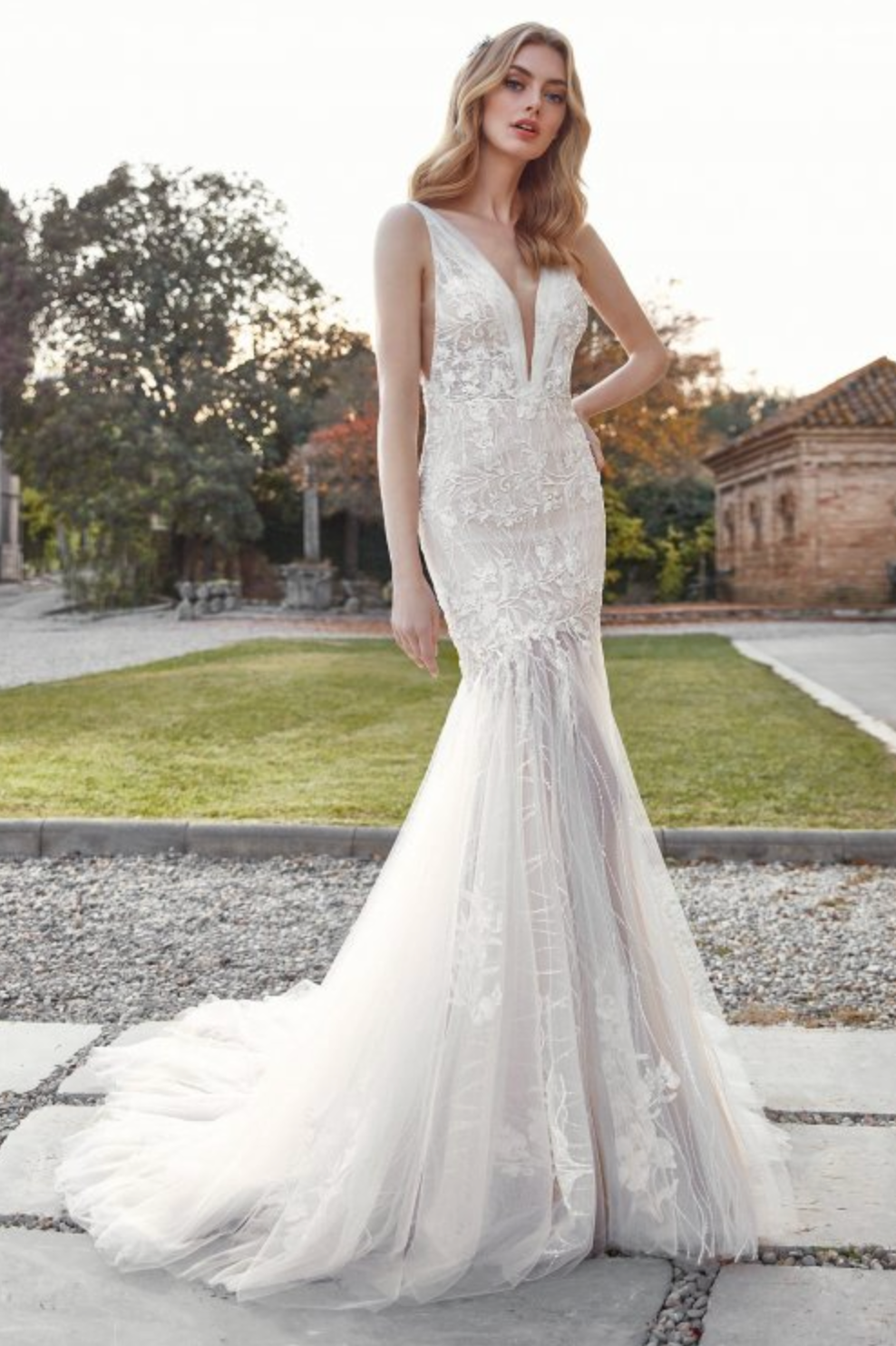 This elegant trumpet gown showcases a deep V-neckline, adding a touch of allure to its refined design. Crafted with delicate details and soft lines, the dress gently contours the body for a sophisticated and graceful silhouette.