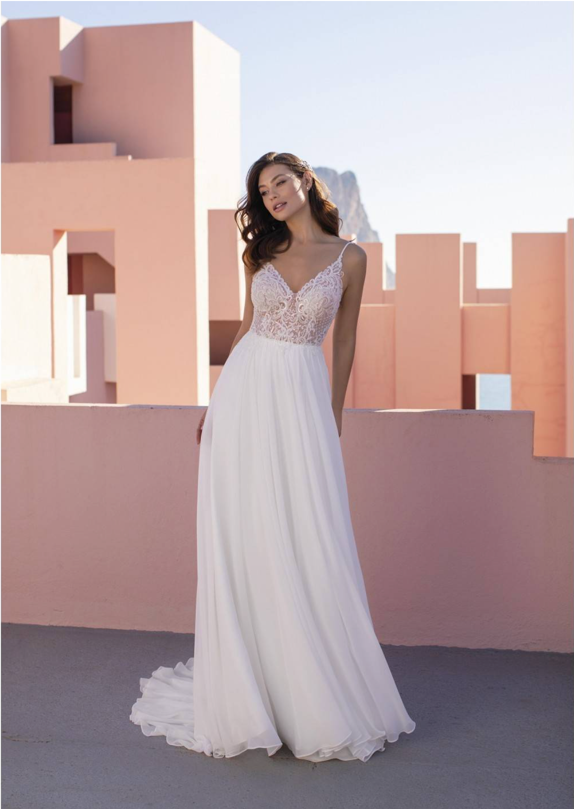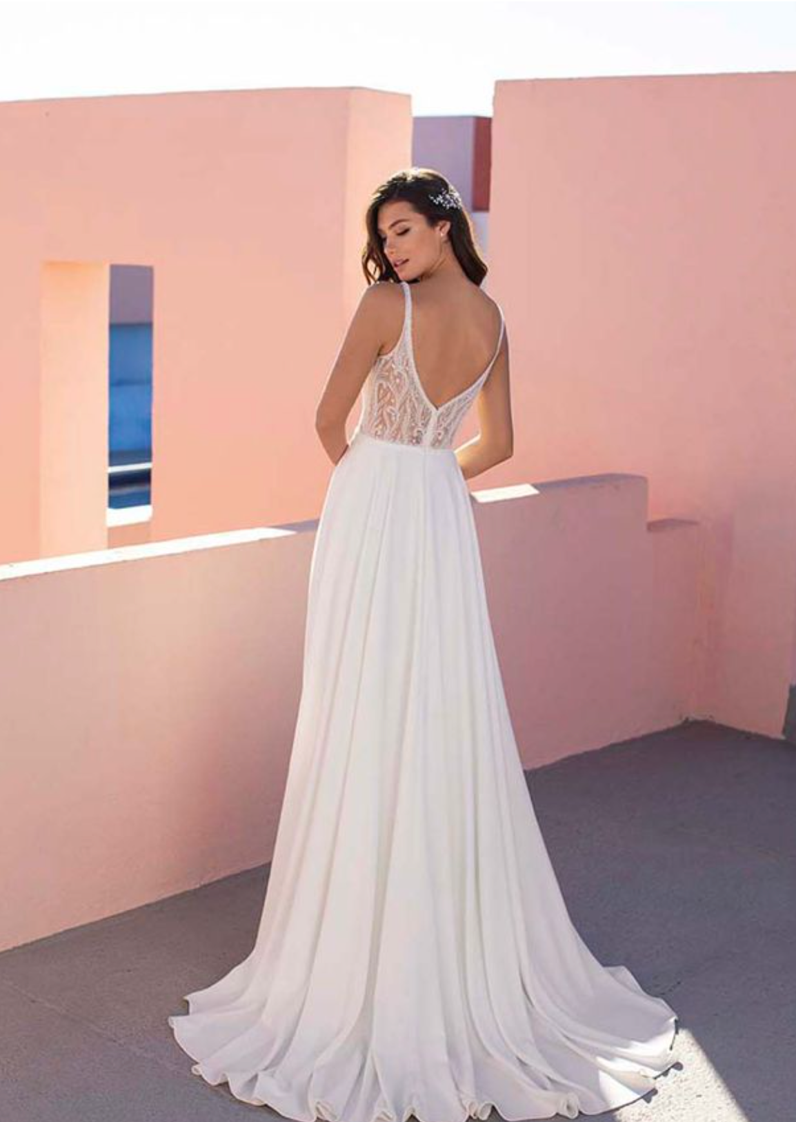 This ethereal A-line gown features a soft V-neckline and a delicately designed semi-sheer bodice that exudes romantic elegance. The intricate detailing on the top transitions seamlessly into the flowing skirt, creating a look that is both graceful and captivating.