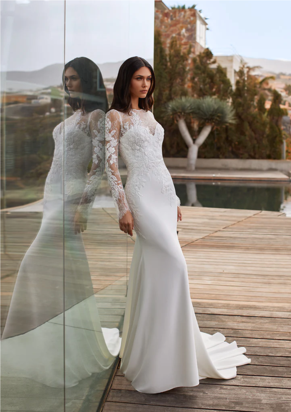This refined fit-and-flare gown showcases a classic sweetheart neckline paired with elegant lace long sleeves, offering a timeless yet sophisticated look. Crafted from smooth crepe, the silhouette flows gracefully into a chic crawl-line hem, creating a sleek and polished finish.