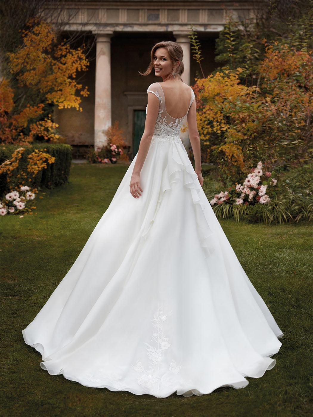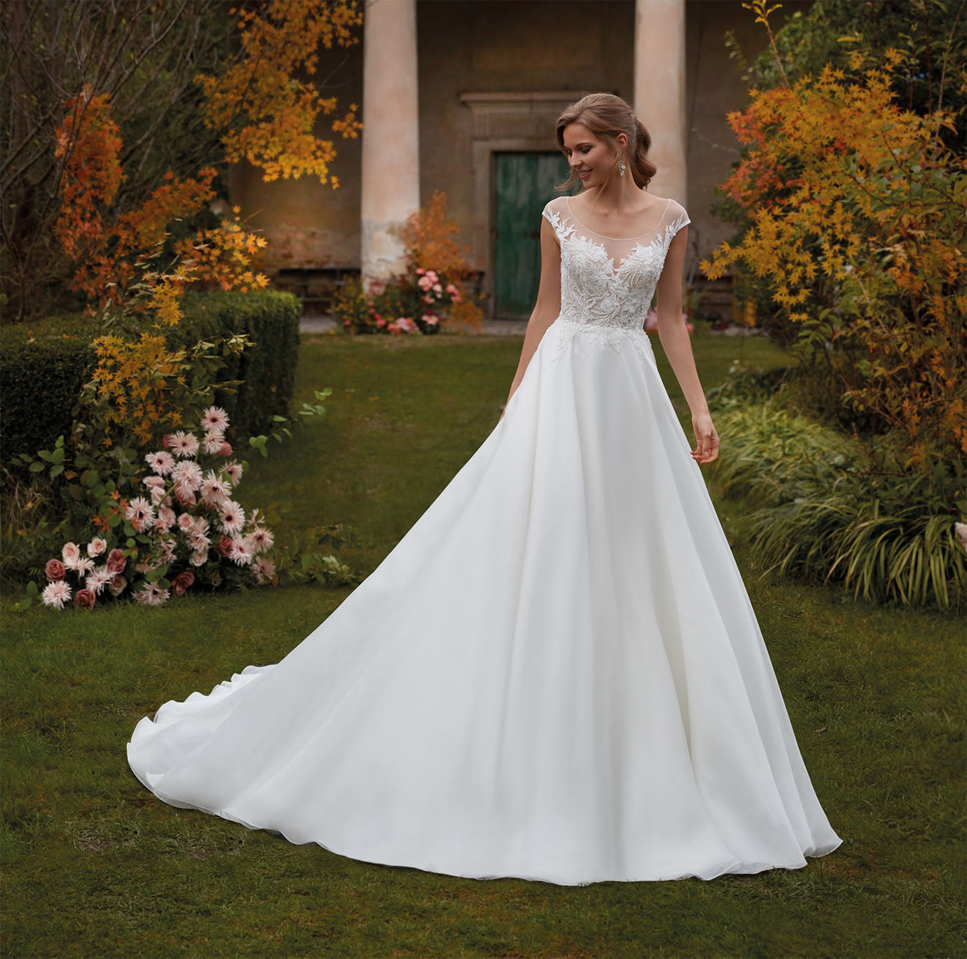This charming A-line gown features a classic sweetheart neckline complemented by delicate cap sleeves, offering a touch of romantic elegance. The flowing skirt creates a graceful and timeless silhouette.