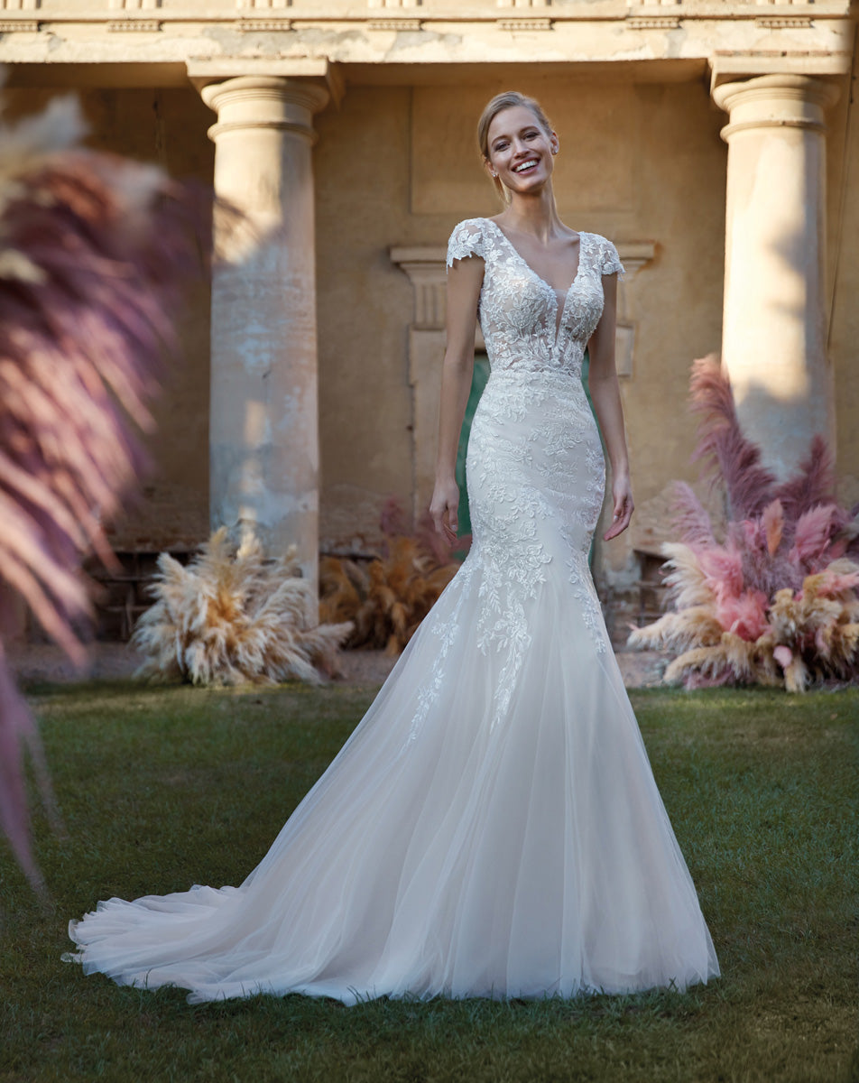 This elegant mermaid gown features a flattering V-neckline and delicate cap sleeves, combining classic sophistication with modern charm. The soft tulle skirt flows gracefully from the fitted silhouette, adding a touch of ethereal beauty.