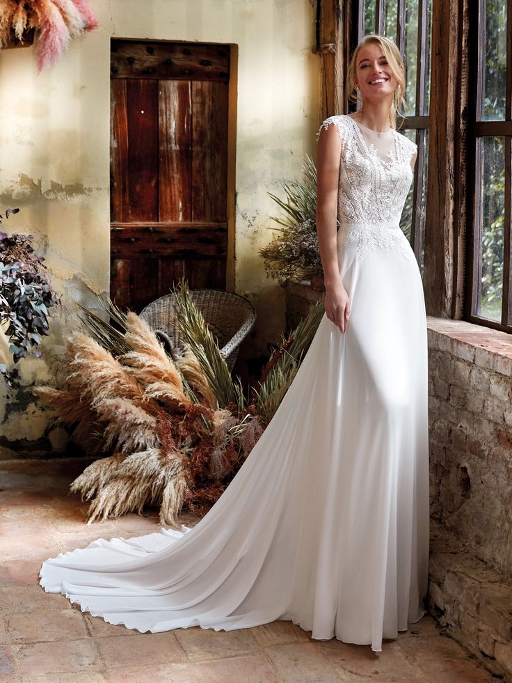 This unique gown seamlessly blends A-line grace with the sleek structure of a mermaid silhouette. Featuring delicate cap sleeves and a lace-adorned bodice, the design exudes romantic charm. The soft crepe skirt flows elegantly, offering a refined and sophisticated finish perfect for modern brides.