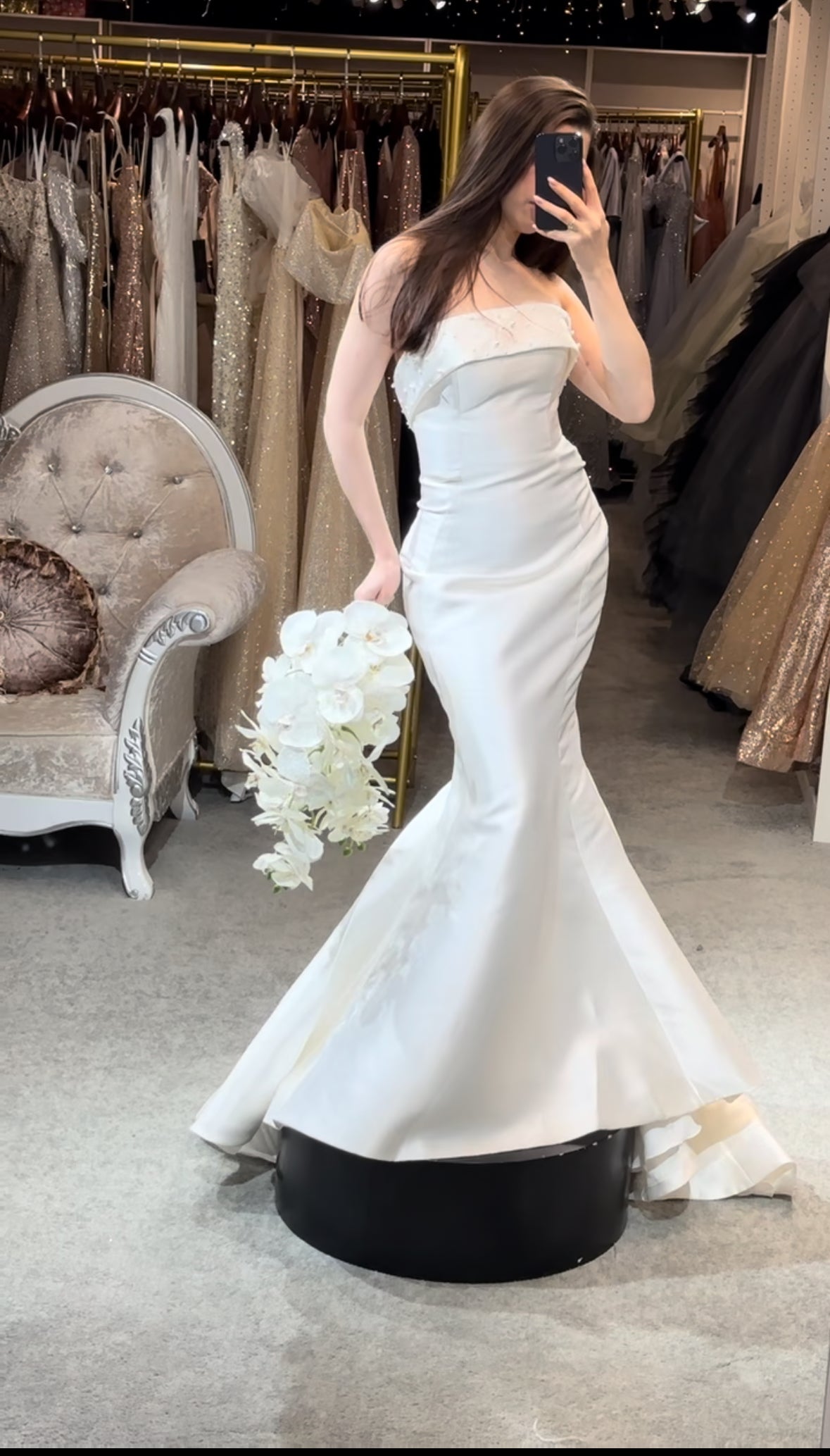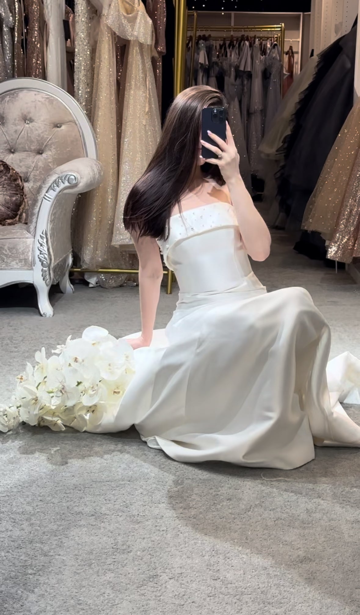Step into a space designed for comfort and luxury. Our fitting rooms offer soft, cozy seating areas for you and your guests, along with an assortment of shoes to complement your dresses. Our curtains curate a private and safe environment, while our luxurious carpet and lighting ensure you feel pampered as you search for your dream gown. Book your appointment today and visit us to create a truly unforgettable experience.