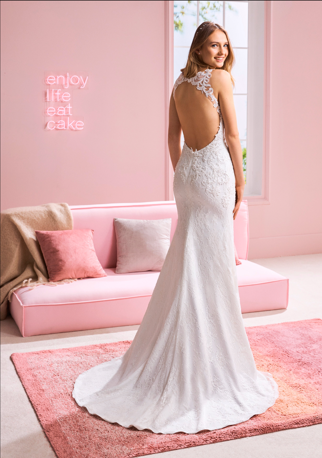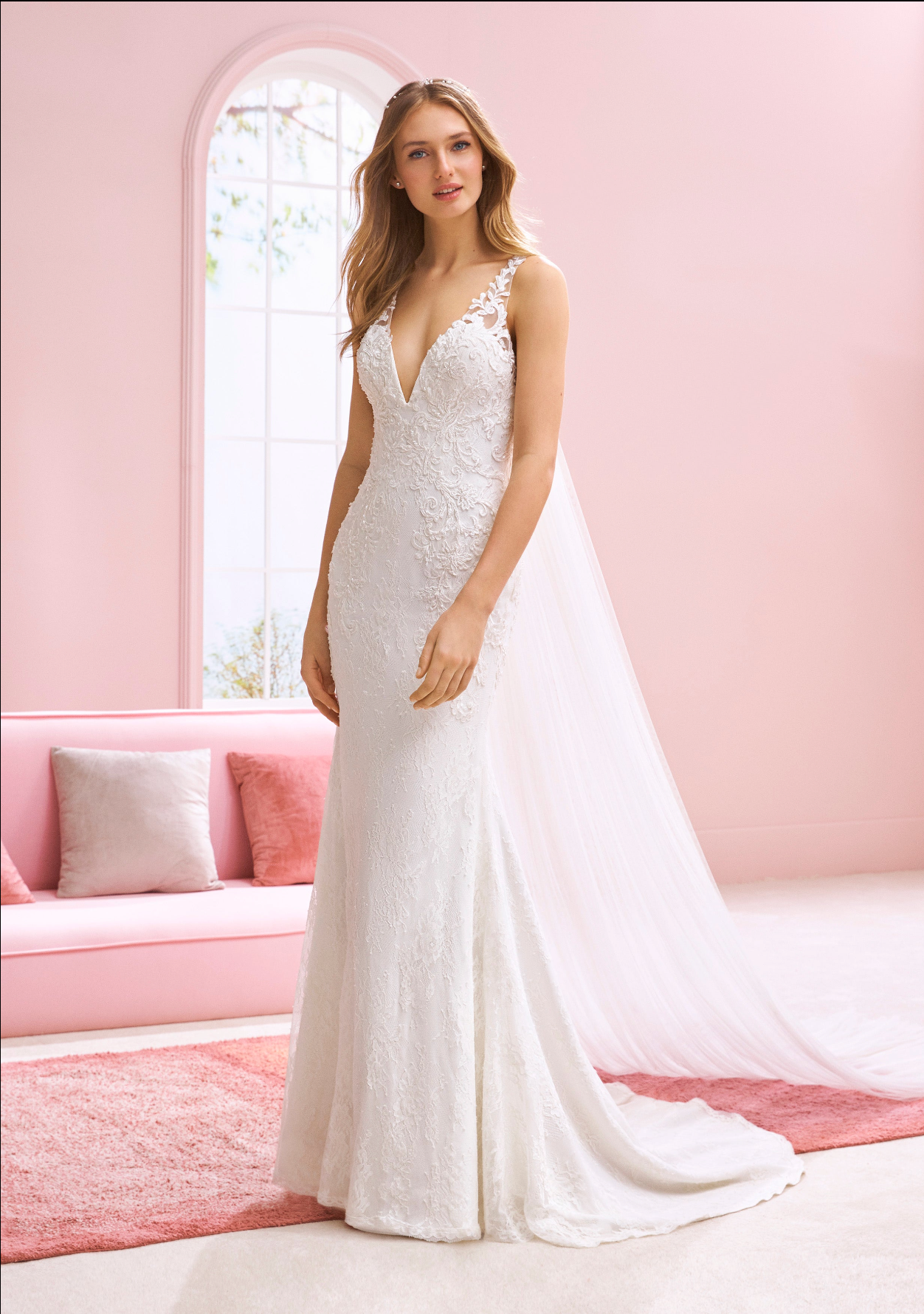This stunning mermaid gown features a deep V-neckline and delicate lace straps, blending elegance with a touch of romance. The fitted silhouette highlights the bride’s curves, while the lace detailing adds timeless sophistication.