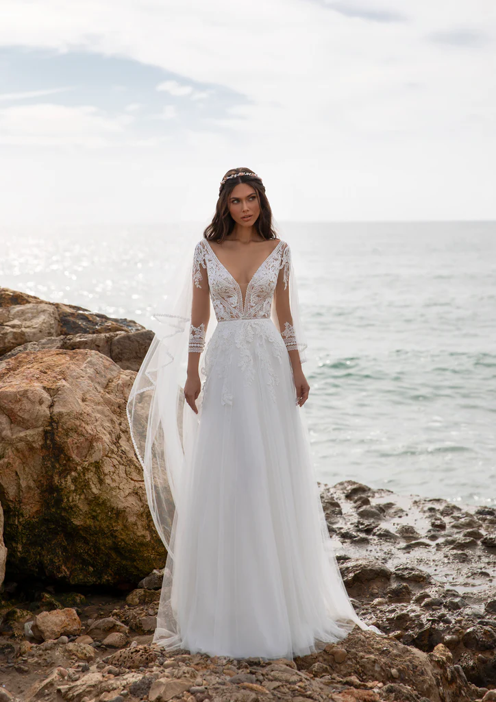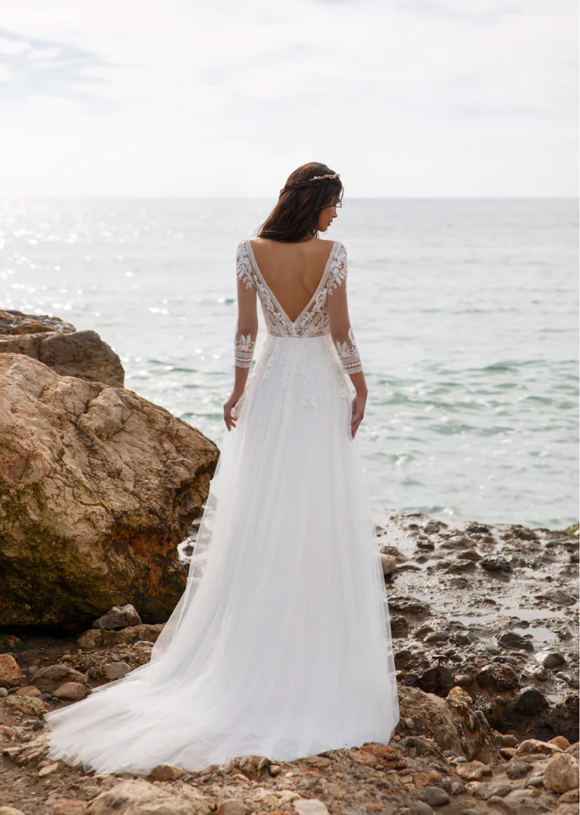 A stunning long-sleeved V-neck A-line gown with a flowing train. The sleeves add a touch of sophistication, while the A-line silhouette offers a flattering and timeless shape. The gentle train completes the look, making it an ideal choice for a bride seeking elegance and grace on her special day.