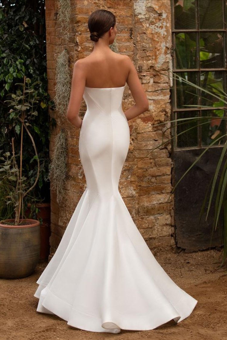 This is a classic mermaid gown with godet at the bottom, it has my signature anatomical seams to highlight the bride’s body. The fabric has incredible photogrogentuc quality, it is not only important to look good in person but now-a-days it has to photograph as well.
