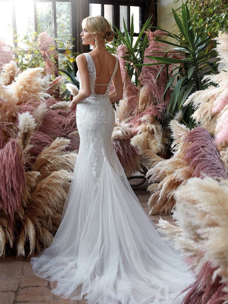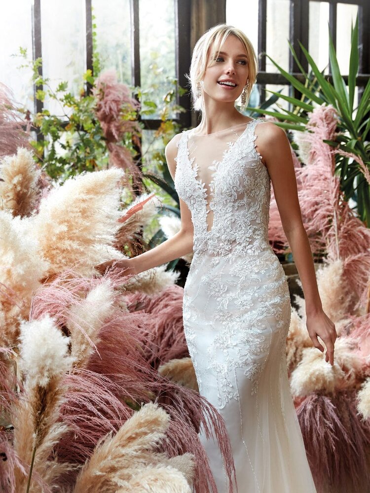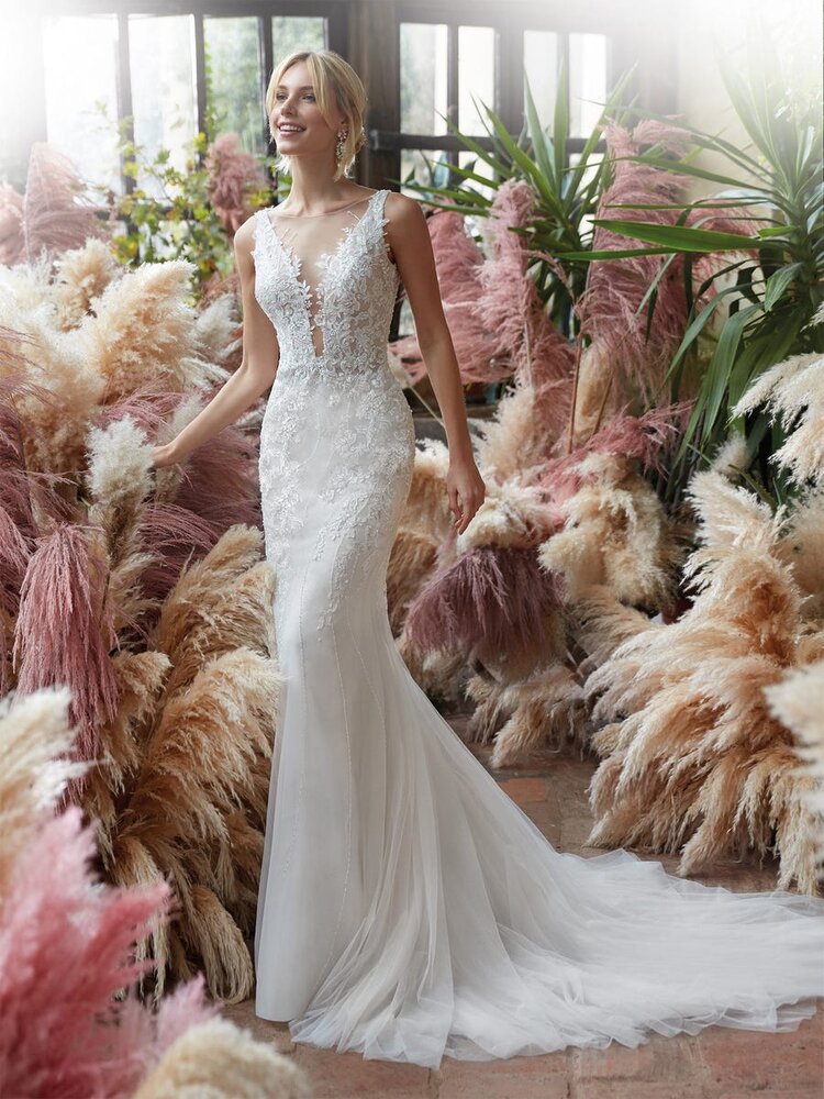 This captivating mermaid gown features a dramatic deep V-neckline and intricate lace patterns that add texture and elegance. The fitted silhouette flows effortlessly into a soft tulle train, creating a romantic and graceful finish.