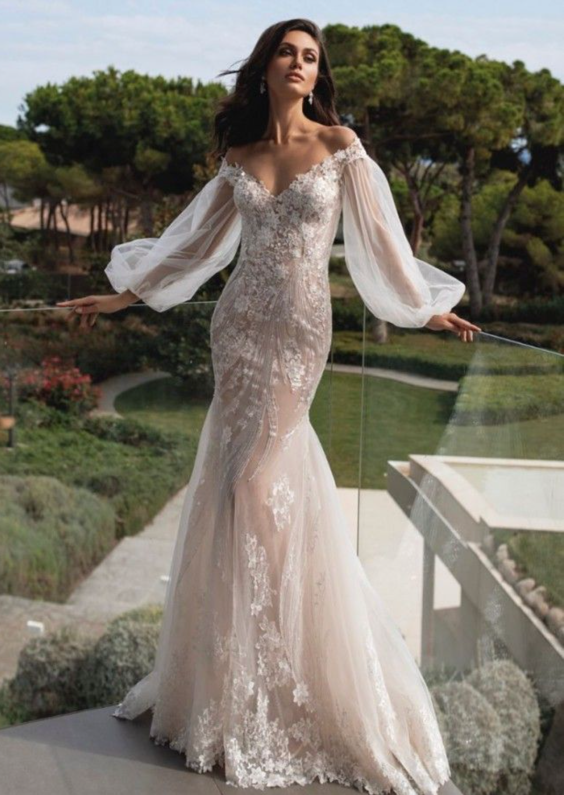 This stunning mermaid wedding gown features a plunging V-neckline and elegant long sleeves, all adorned with intricate lace that creates a seamless, all-over design. The slightly sheer bodice adds a touch of allure, while the fitted silhouette flows gracefully into a dramatic mermaid skirt.