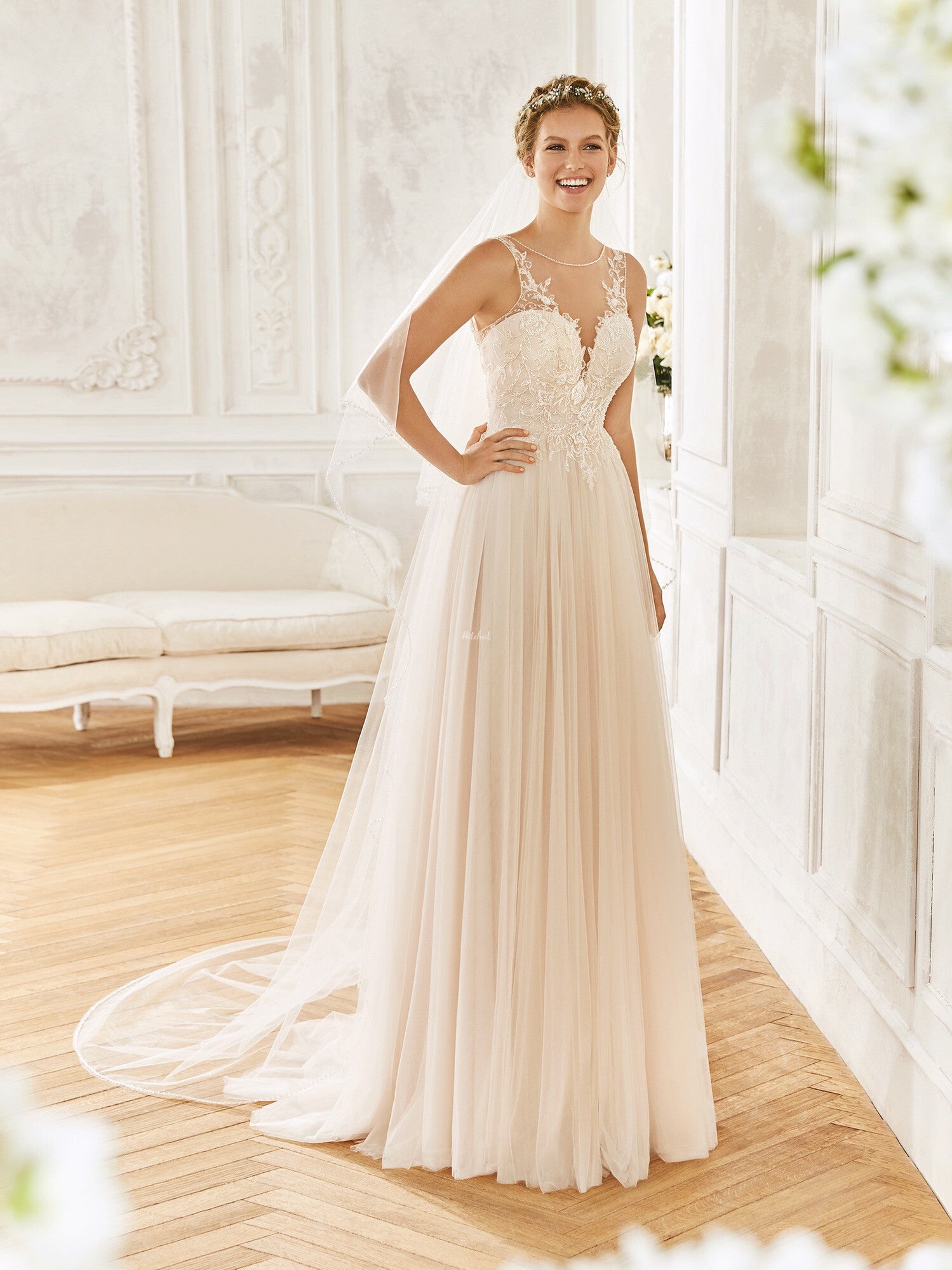 This soft pink A-line wedding dress is beautifully enhanced with delicate lace accents and bead detailing around the neckline, adding a subtle touch of sparkle. The graceful A-line silhouette offers a flattering fit, making it a romantic and elegant choice for your special day.