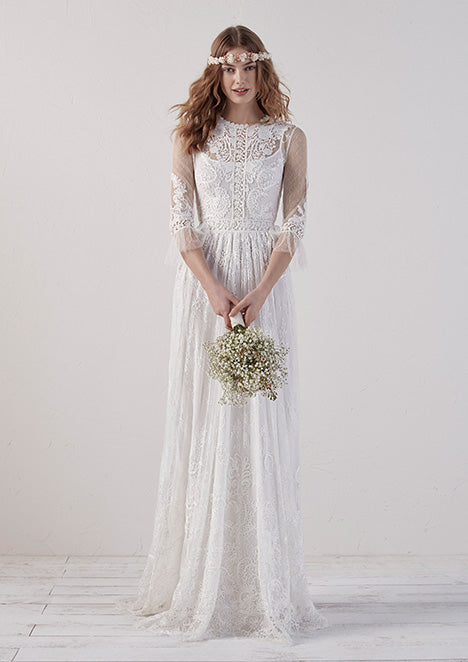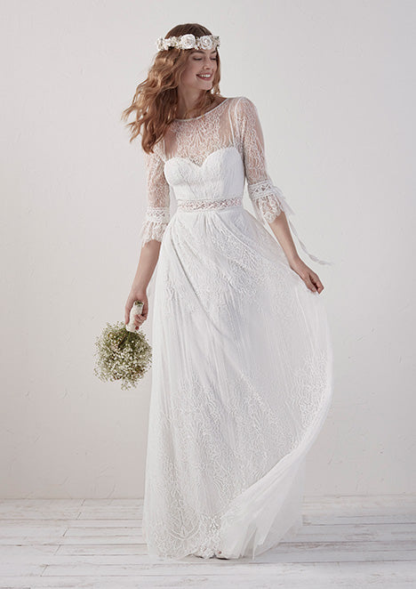 This long-sleeve, round-neck wedding gown embraces a Bohemian style with its flowing, effortless silhouette. The delicate lace detailing and airy fabric create a romantic and free-spirited look, perfect for brides seeking a blend of elegance and laid-back charm. The design effortlessly combines traditional elements with a modern twist, making it a beautiful choice for a relaxed yet stylish celebration.
