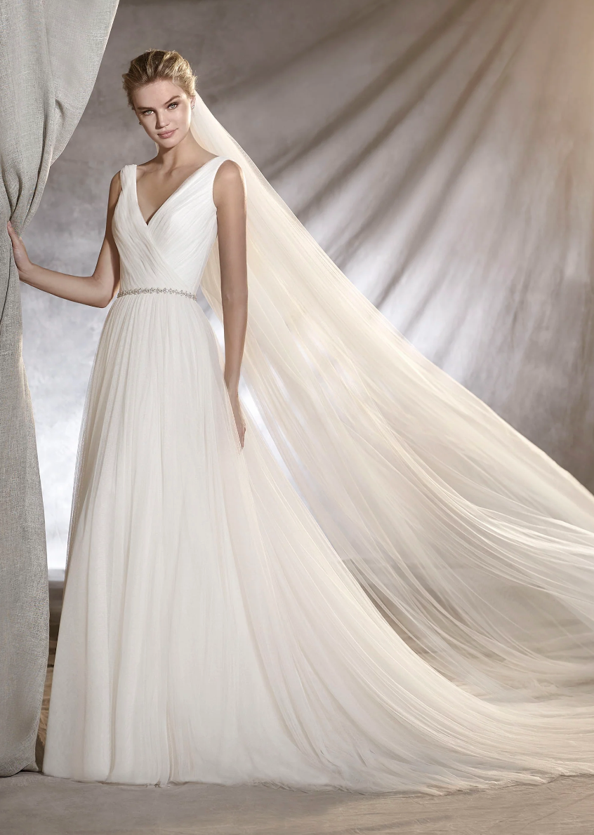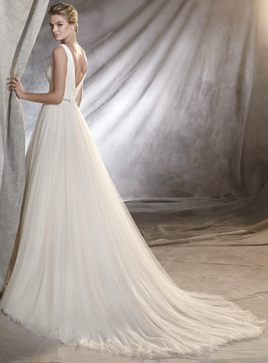 This elegant wedding dress features a V-neckline with wide straps and delicate pleated tulle, adding texture and movement to the design. The soft, flowing fabric creates a graceful, ethereal look. A detachable waist belt allows for a customizable fit, offering a versatile touch to the gown, so you can effortlessly transform your look for the ceremony and reception.