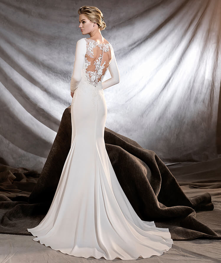 Elegant and refined, this fitted wedding dress is a perfect blend of modern simplicity and timeless romance. The sleek crepe fabric drapes beautifully, enhancing the gown’s figure-hugging silhouette with a soft, flowing effect. Long sleeves add sophistication, while the open back, adorned with delicate lace embroidery, creates a breathtaking focal point.