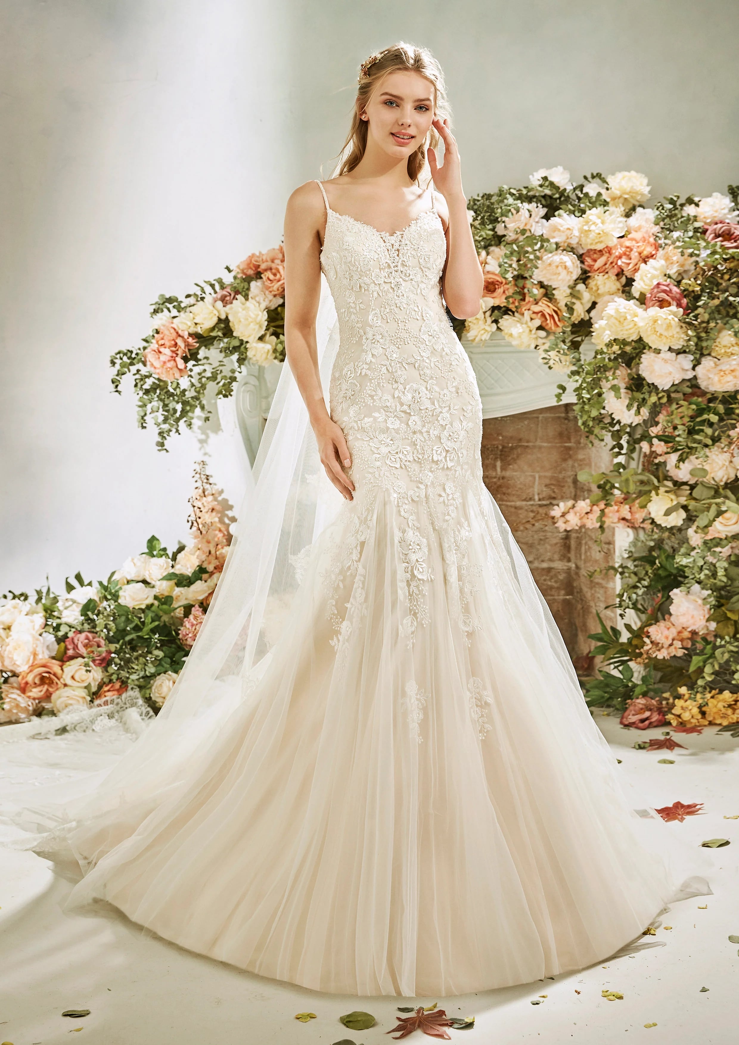Turn heads on your special day with this glamorous mermaid wedding dress. Featuring delicate spaghetti straps and a plunging V-neckline, the fitted silhouette highlights your curves with elegance and style. The gown is adorned with intricate lace detailing, accented with subtle shimmering elements that catch the light beautifully. The mermaid skirt flares out dramatically, adding a touch of sophistication and allure.