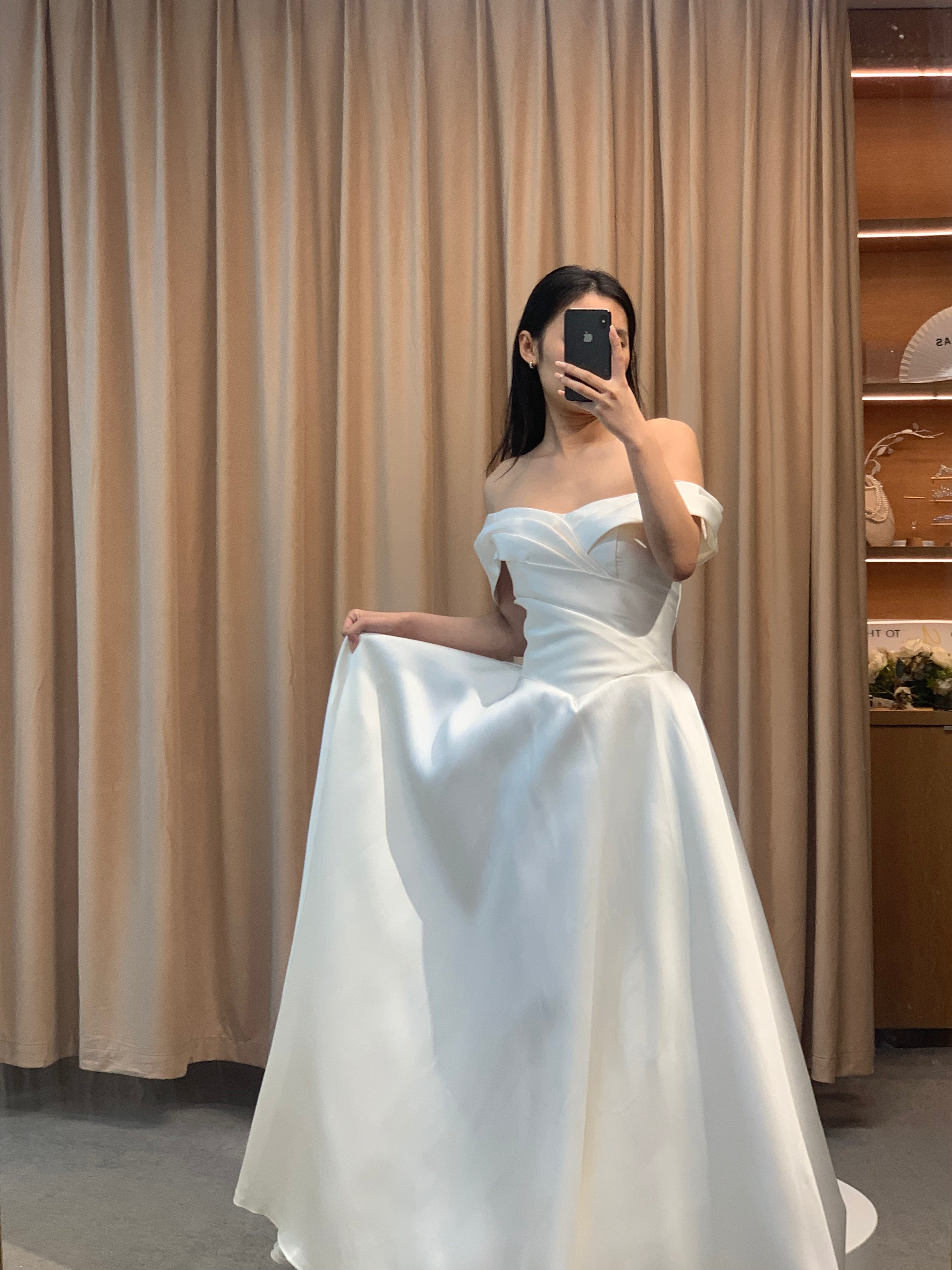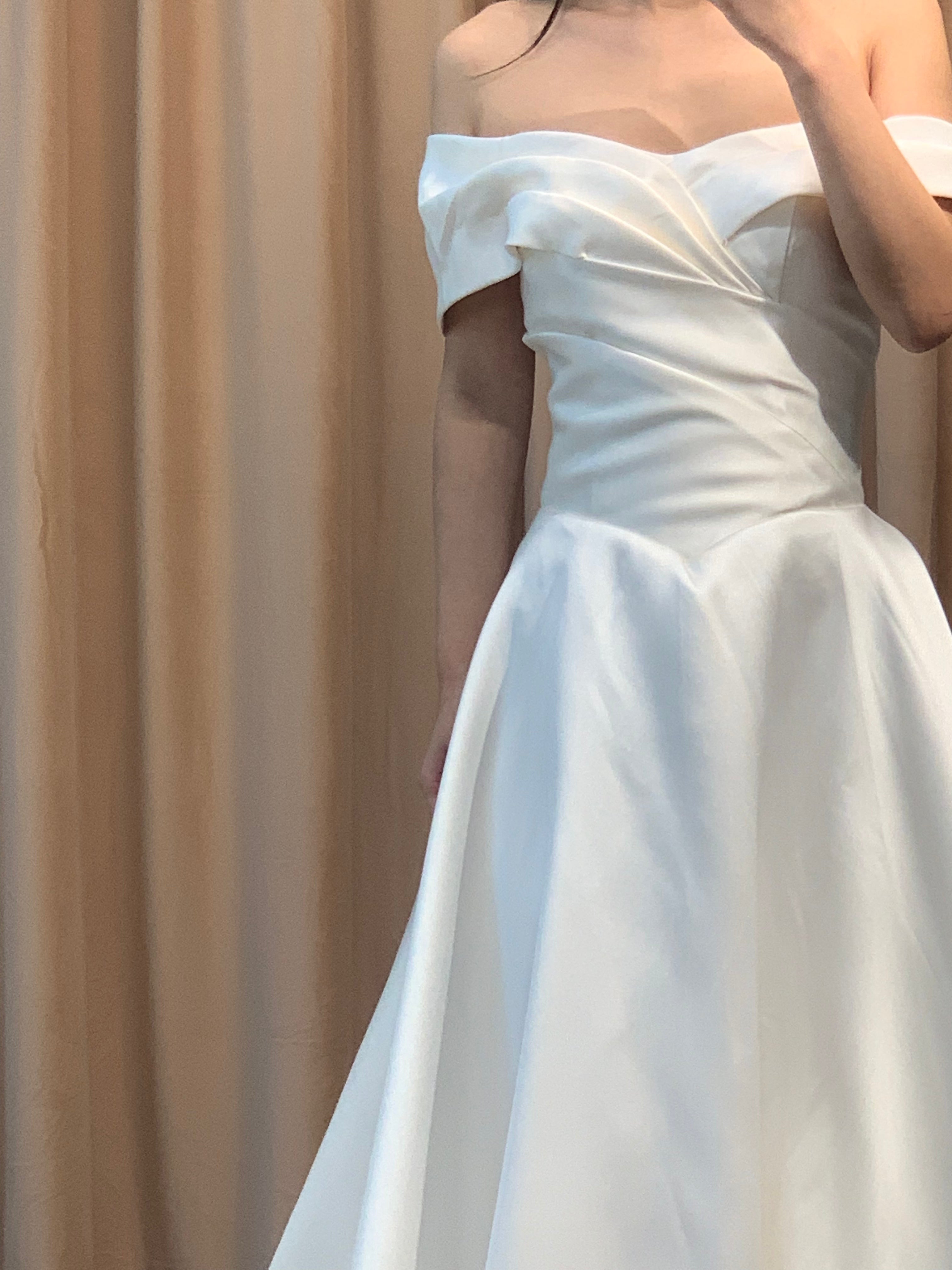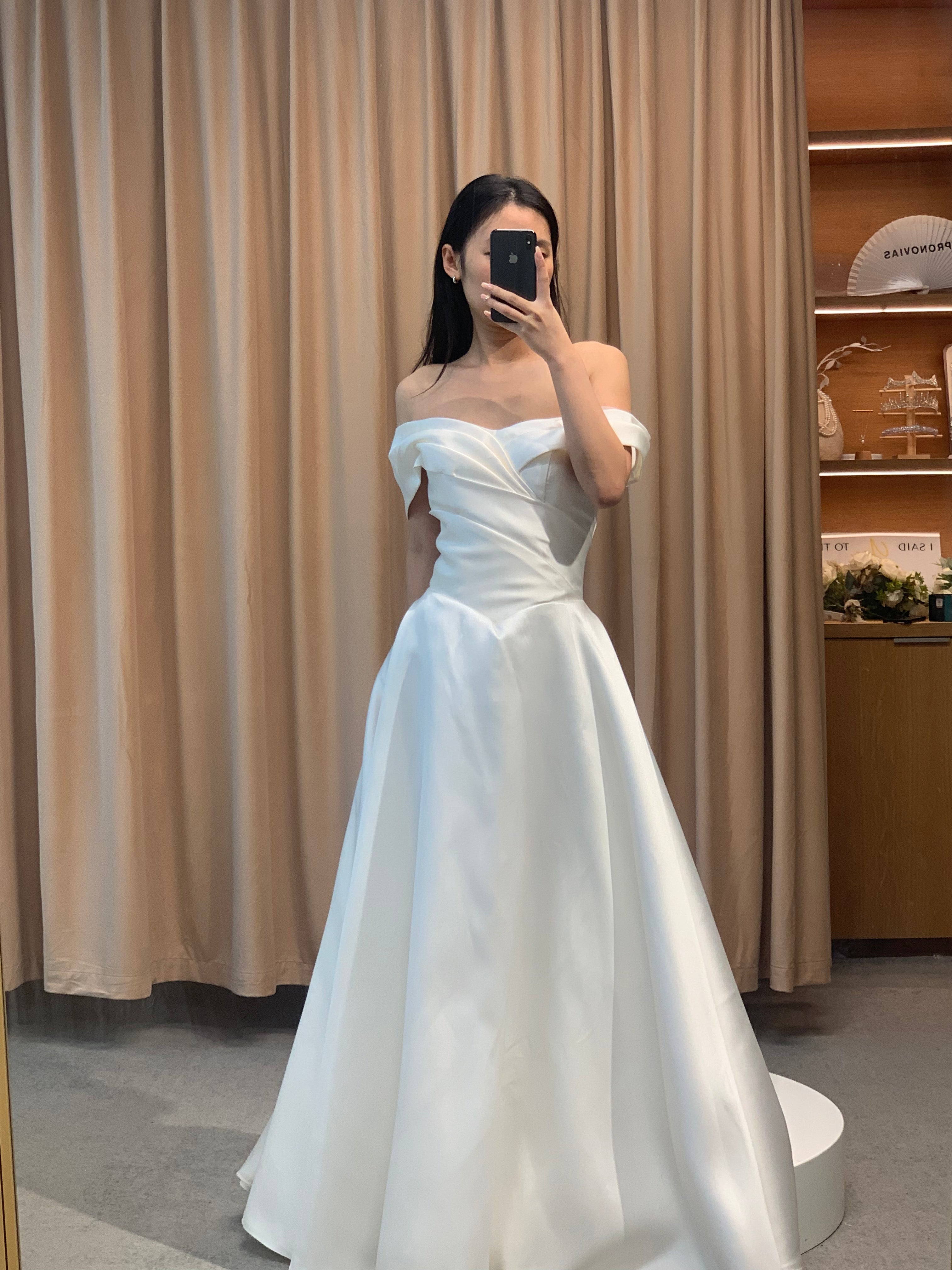 This stunning gown showcases a defining Basque waist, creating a beautifully sculpted silhouette that celebrates the female form. The graceful off-the-shoulder neckline adds a touch of softness, while the luxurious satin fabric flows seamlessly into a clean A-line skirt. Entirely free of embellishment, this design commands attention through its masterful cut, rich texture, and timeless sophistication—a true modern classic.