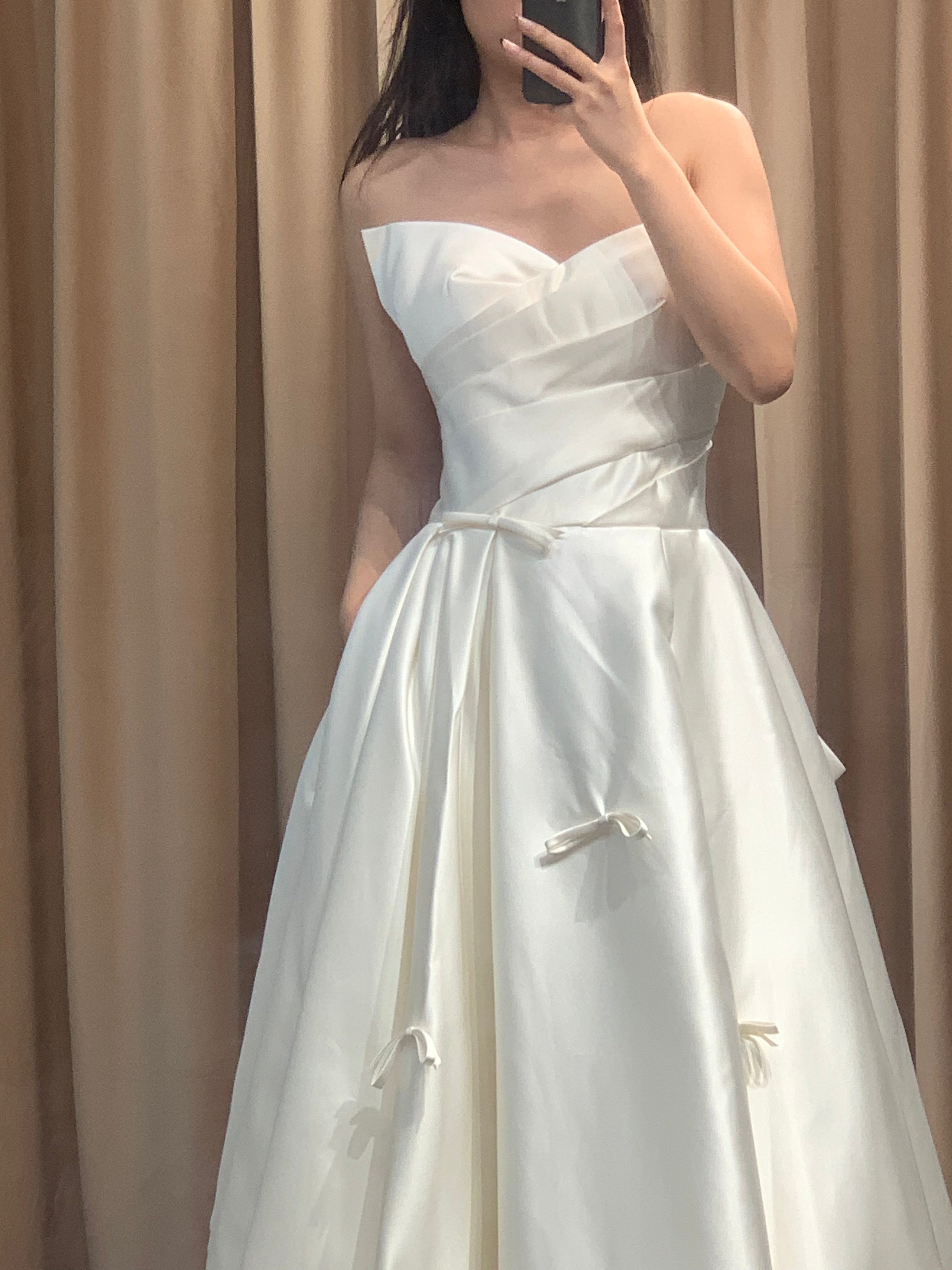 This stunning satin gown begins with a deep V-neckline that elegantly frames the face and décolletage. The bodice is softly gathered with artful draping that flatters the form, flowing seamlessly into a classic A-line skirt. The final flourish? A beautifully sculpted satin bow that adorns the hip or back, offering a perfect punctuation of playfulness and polish to this elegant silhouette.