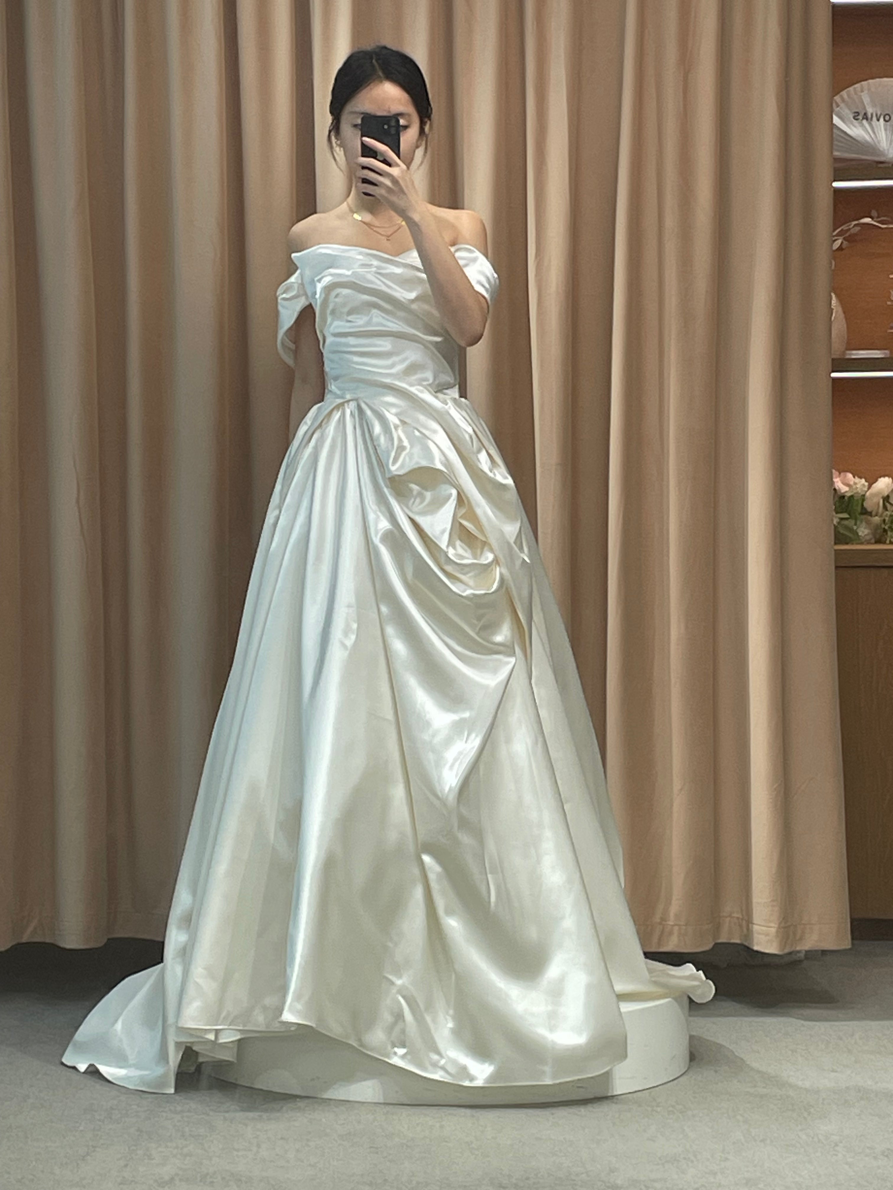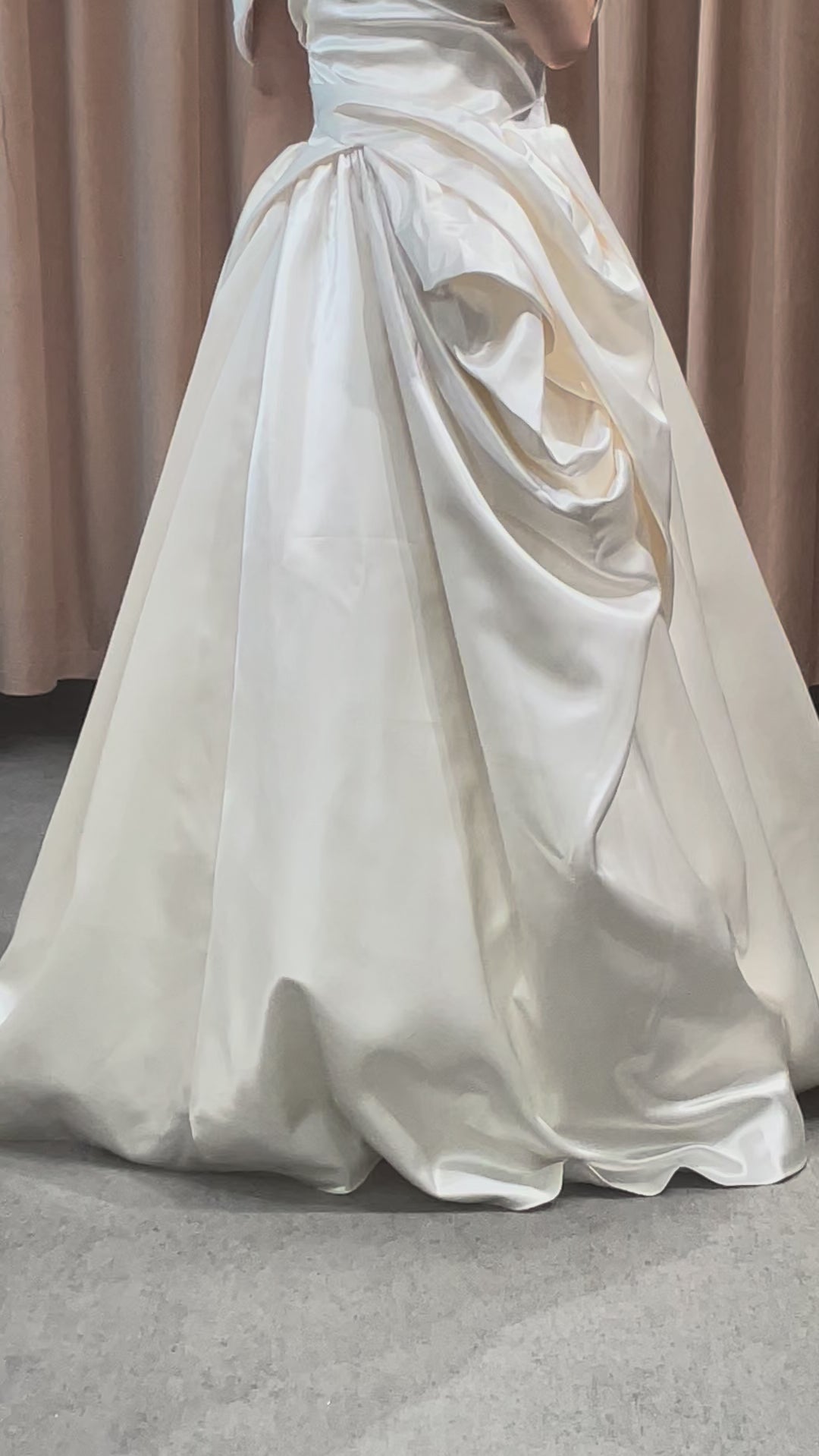 Embrace minimalist elegance in this stunning satin gown. The sleek strapless bodice is adorned with soft, cascading folds, and features versatile detachable off-the-shoulder sleeves. Flowing into a dramatic long train, its pure, unadorned design ensures a timeless and sophisticated silhouette for a truly memorable aisle moment.