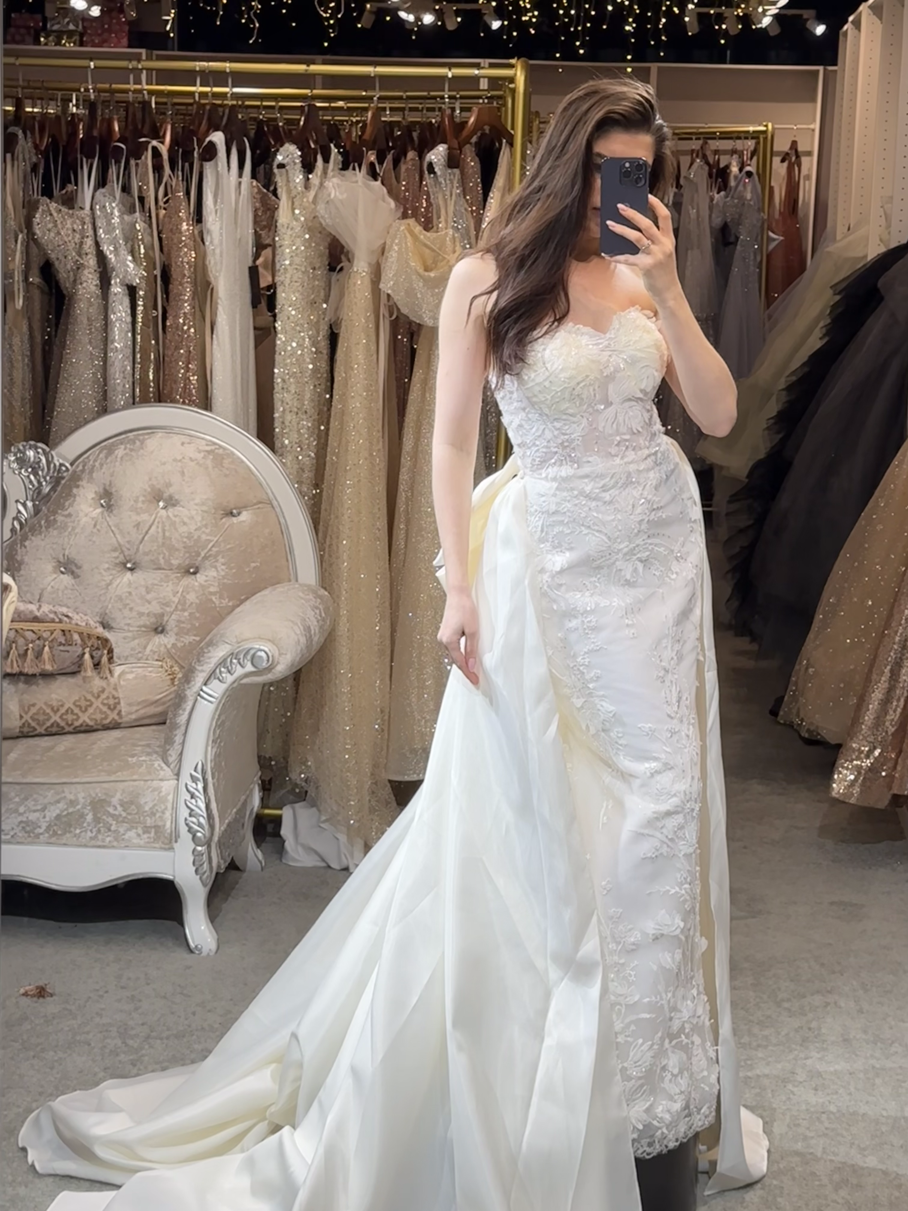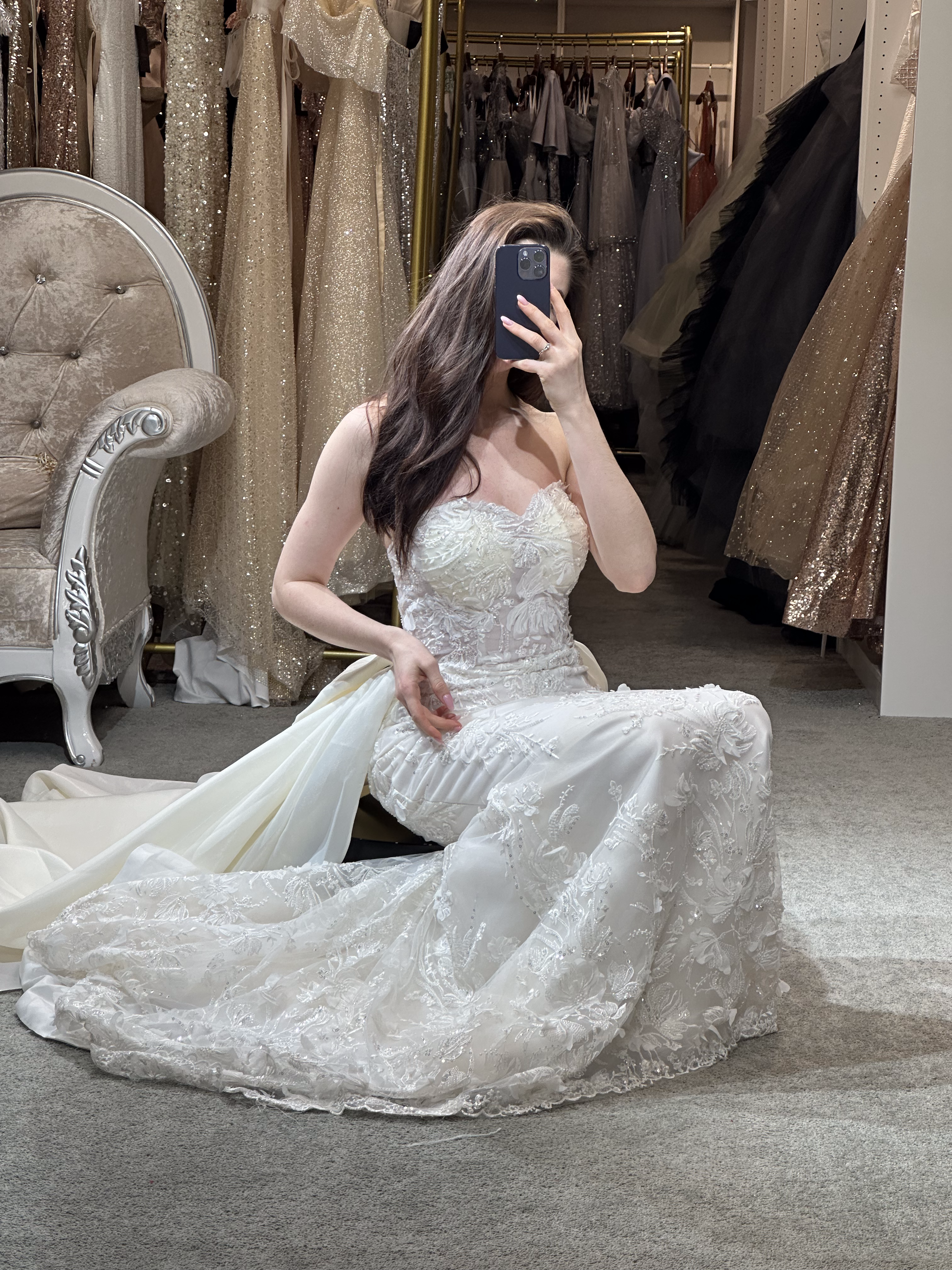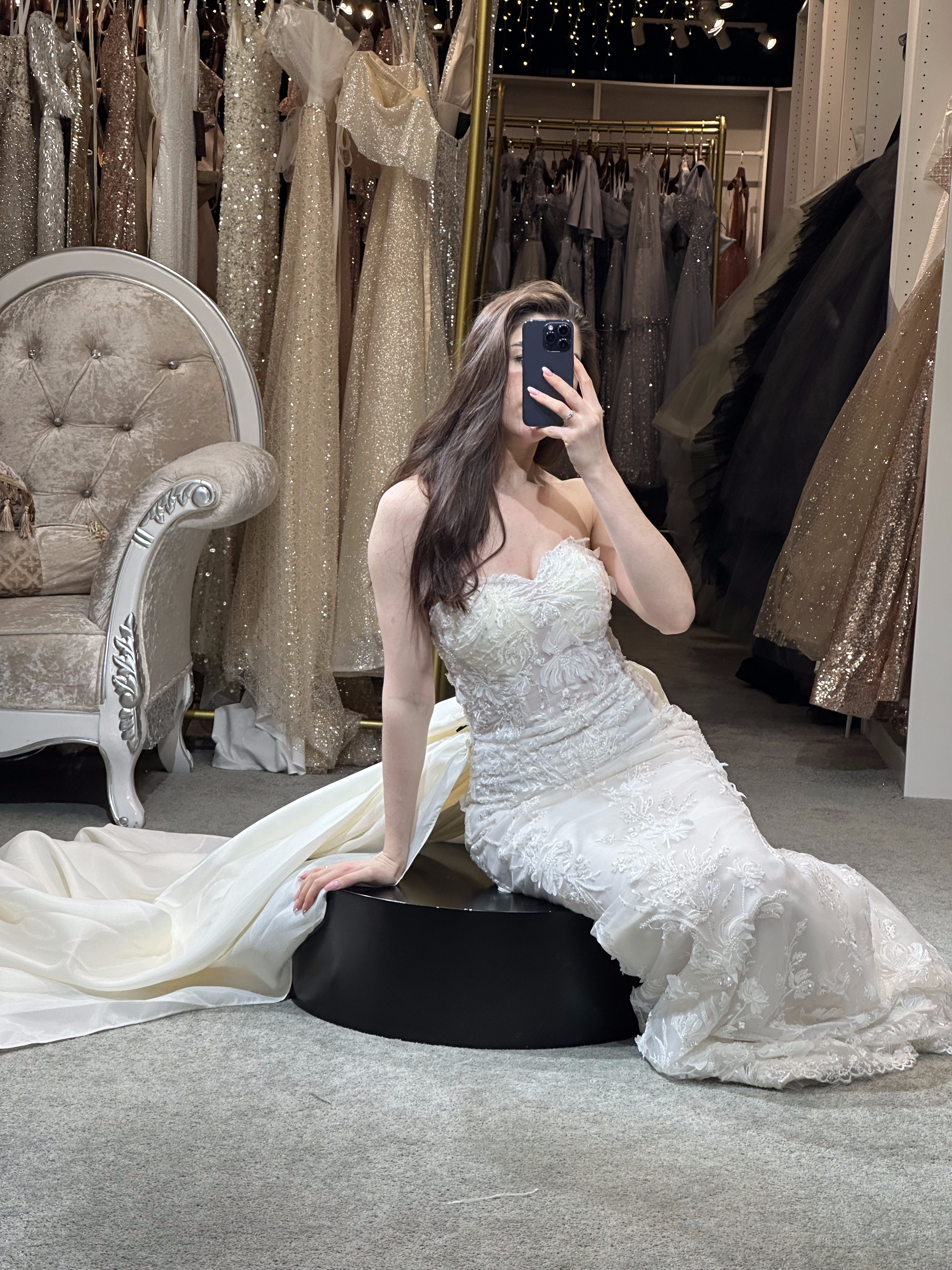 Step into a space designed for comfort and luxury. Our fitting rooms offer soft, cozy seating areas for you and your guests, along with an assortment of shoes to complement your dresses. Our curtains curate a private and safe environment, while our luxurious carpet and lighting ensure you feel pampered as you search for your dream gown. Book your appointment today and visit us to create a truly unforgettable experience.